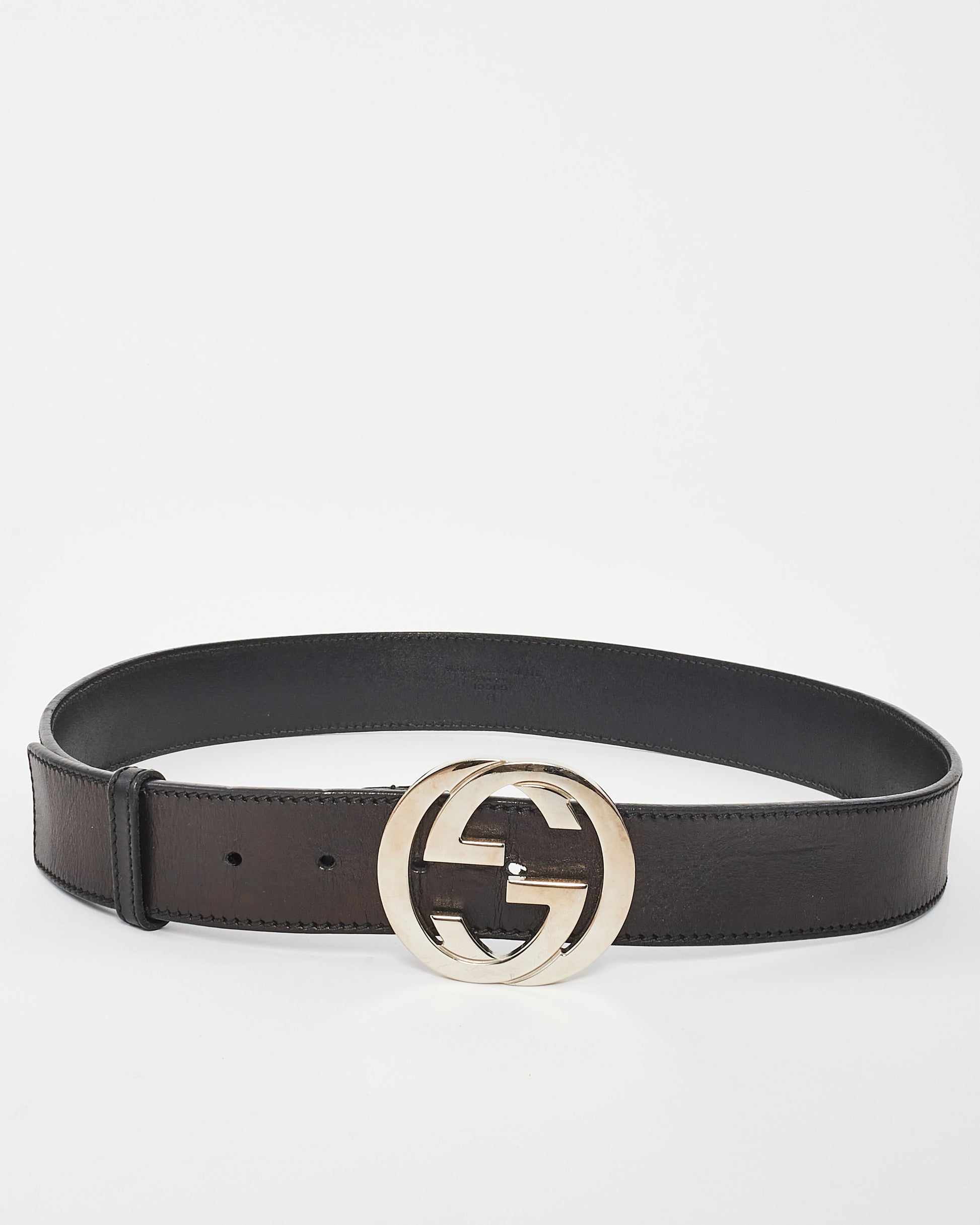 Black Leather Interlocking GG Silver Buckle Belt - 90/36