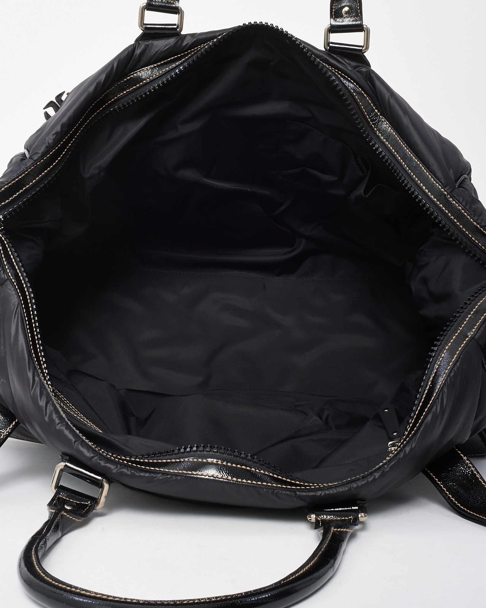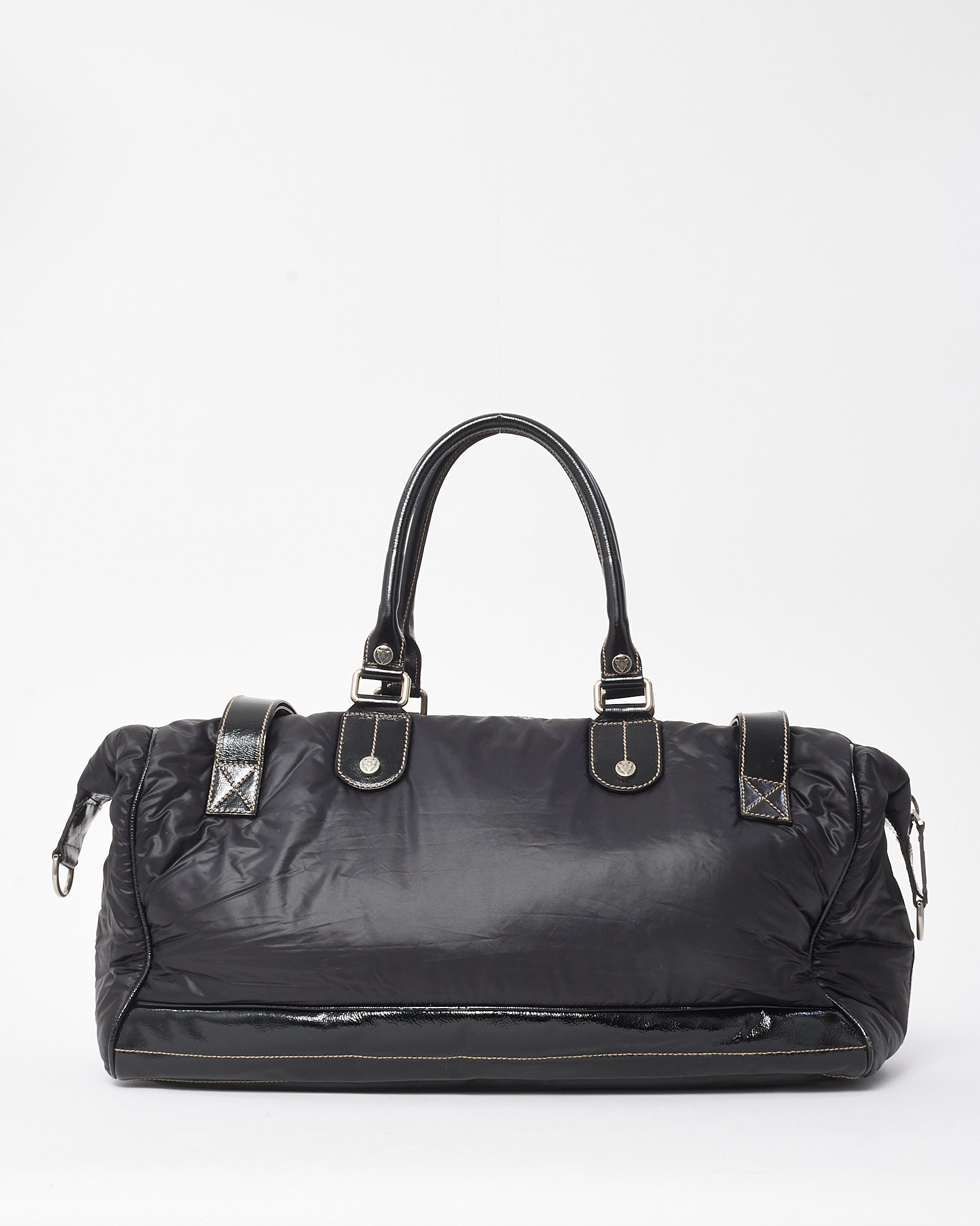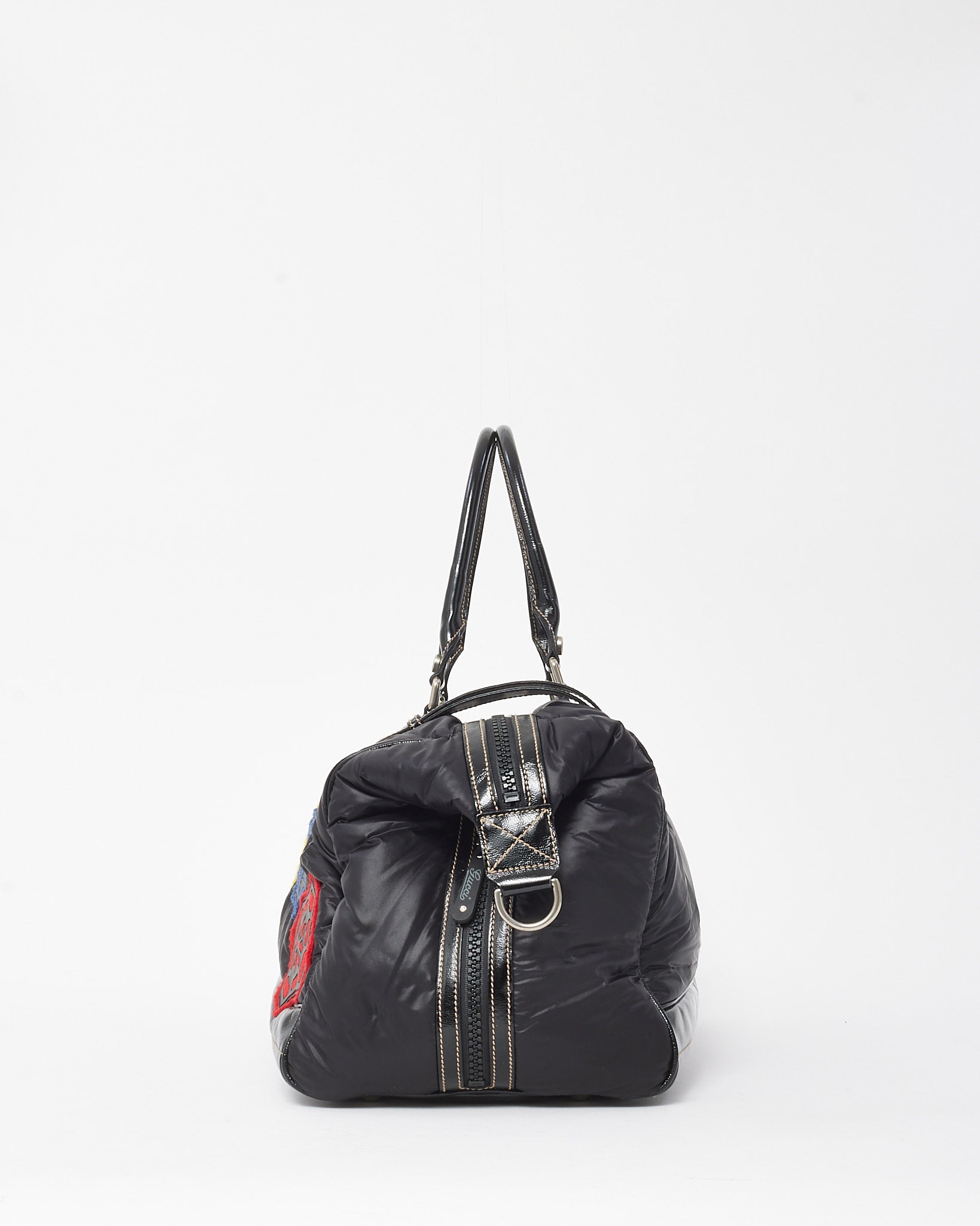 Elevate your travel essentials with this pre-loved authentic Gucci Black Nylon Logo Patches Duffle Bag. Crafted from durable black nylon and accented with leather trim, this spacious carryall features distinctive Gucci logo patches that nod to the brand’s heritage with a sporty edge. The double zip-top opens to a roomy interior, perfect for weekend getaways or gym runs. Finished with silver-tone hardware and reinforced top handles, this duffle blends utility and signature style in a bold, modern silhouette.