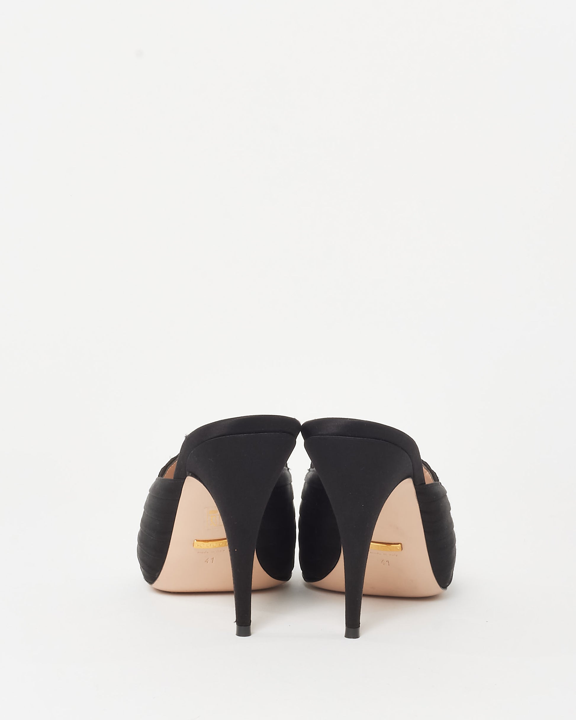 A perfect blend of elegance and modern sophistication, the pre-owned authentic Gucci Black Satin Double G Logo Mule Heels are a refined statement piece for any wardrobe. Crafted from luxurious black satin, these mule heels offer a sleek, polished silhouette that exudes effortless glamour.