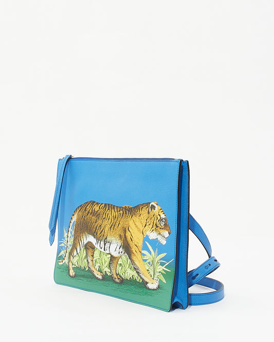 Blue Leather Tiger Print Pouch with Crossbody Strap