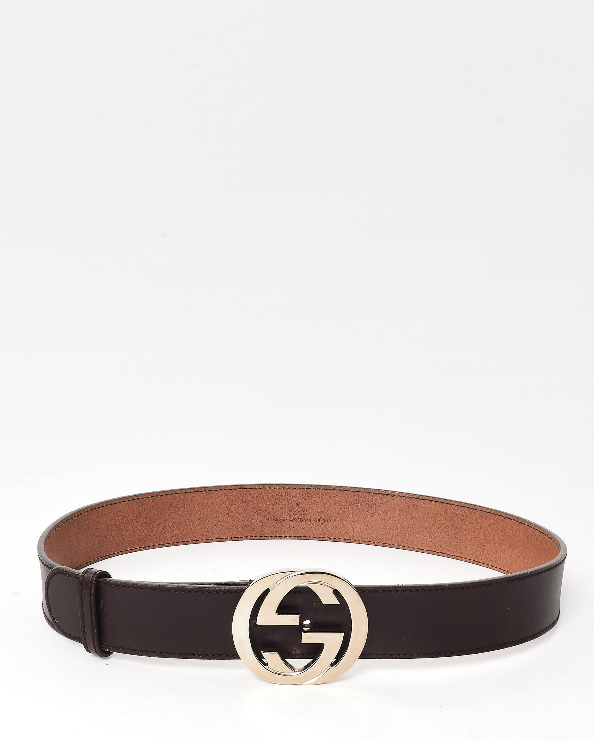Brown Leather Silver Interlocking GG Belt - 85/34