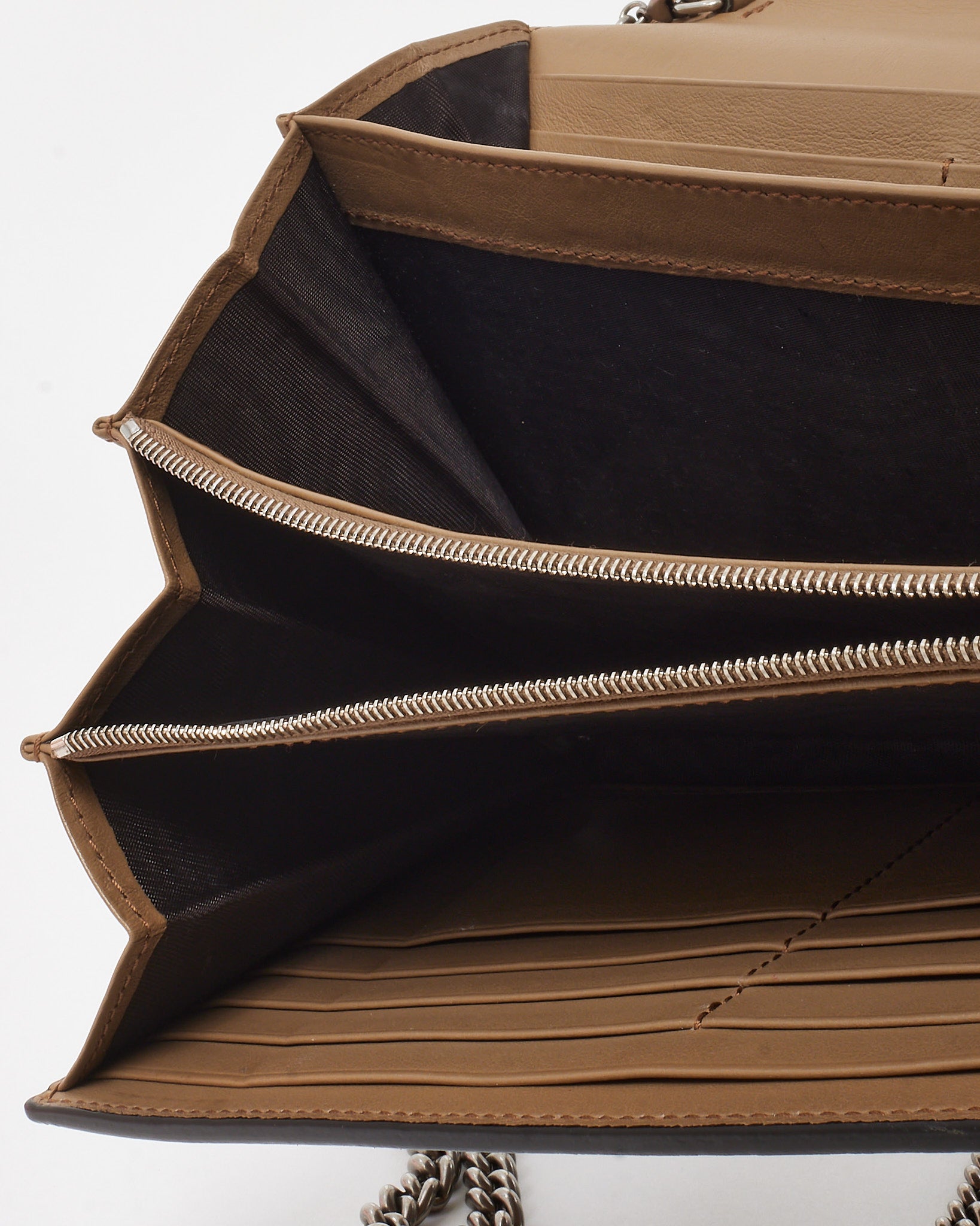 Crafted in plush brown suede, this pre-loved authentic Gucci Dionysus WOC (Wallet on Chain) embodies compact luxury with iconic flair. The structured silhouette is defined by the signature textured tiger head spur—an ode to Greek mythology—set against antique silver-tone hardware. A fold-over flap reveals a well-organized interior with card slots, a zip coin pouch, and compartments for on-the-go essentials. Finished with a detachable chain strap, this wallet seamlessly transforms into a sleek evening bag or crossbody companion. Elegant, versatile, and unmistakably Gucci, it’s the perfect fusion of function and fashion.