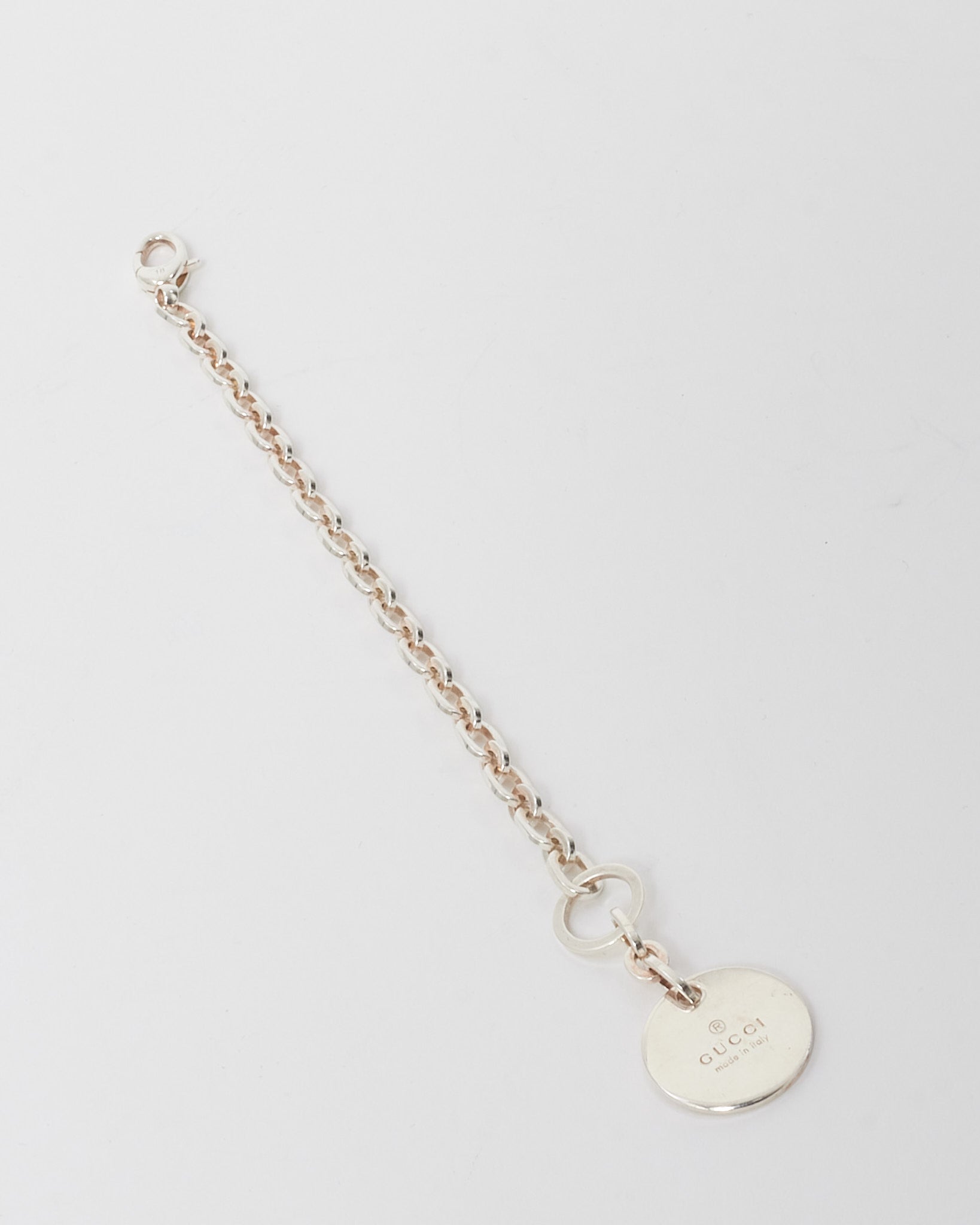 Refined and minimalist, this pre-loved authentic Gucci bracelet showcases timeless elegance in polished sterling silver. Featuring a delicate chain anchored by a round charm engraved with Gucci’s classic trademark logo, this piece offers understated sophistication perfect for everyday wear. The lobster clasp ensures secure closure while the subtle branding adds a touch of iconic Italian luxury. Whether worn alone or layered with other pieces, it brings effortless charm to any jewelry collection.