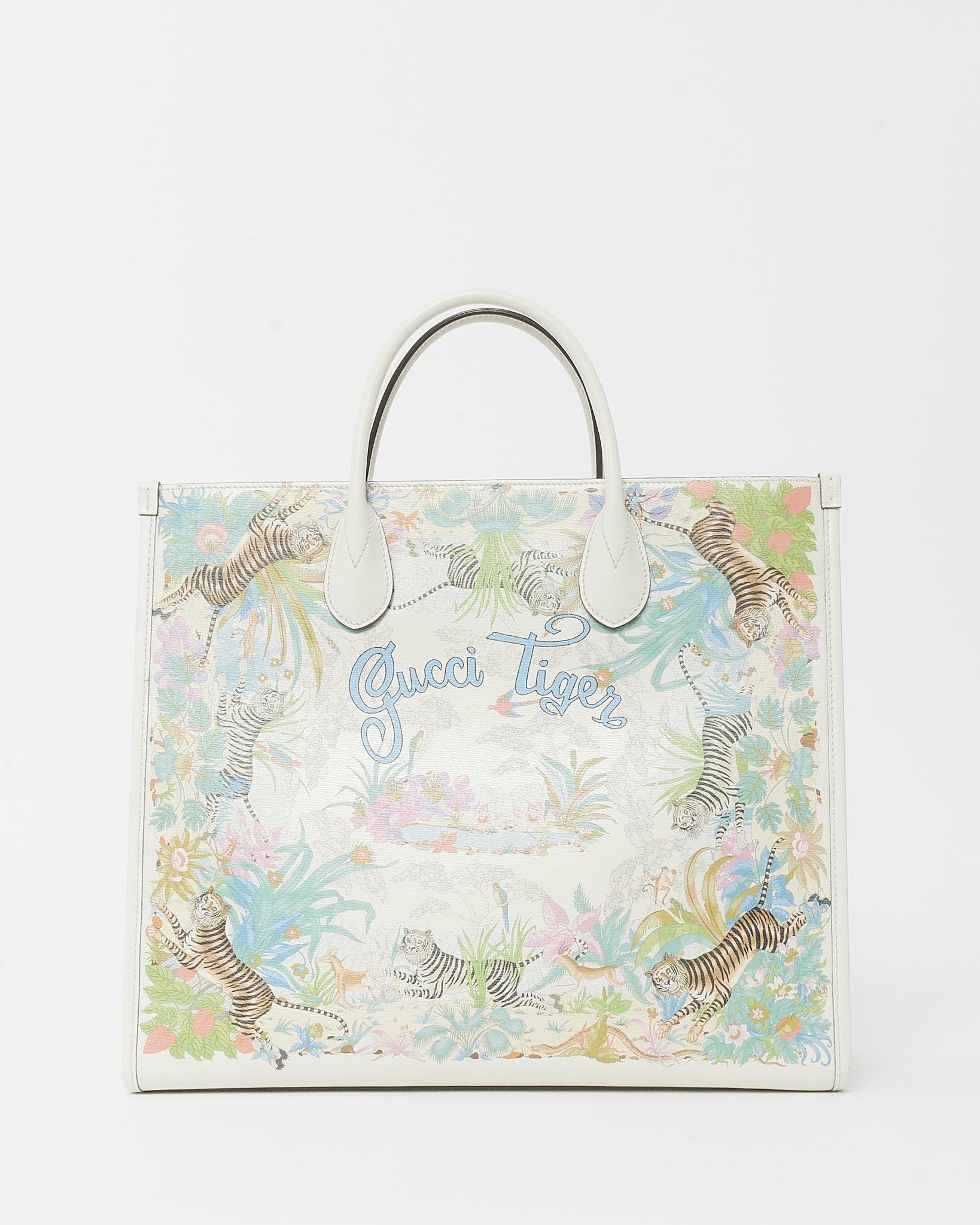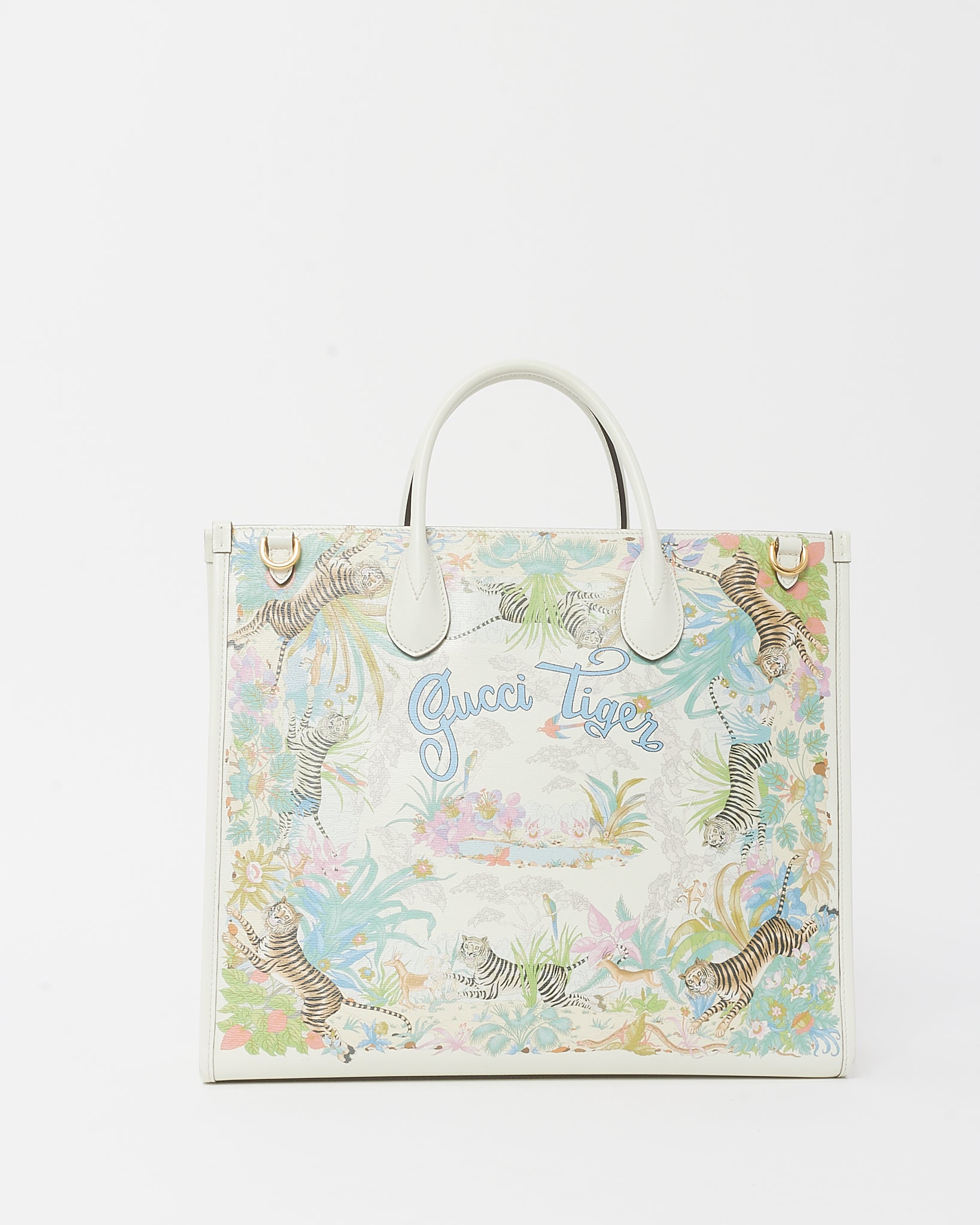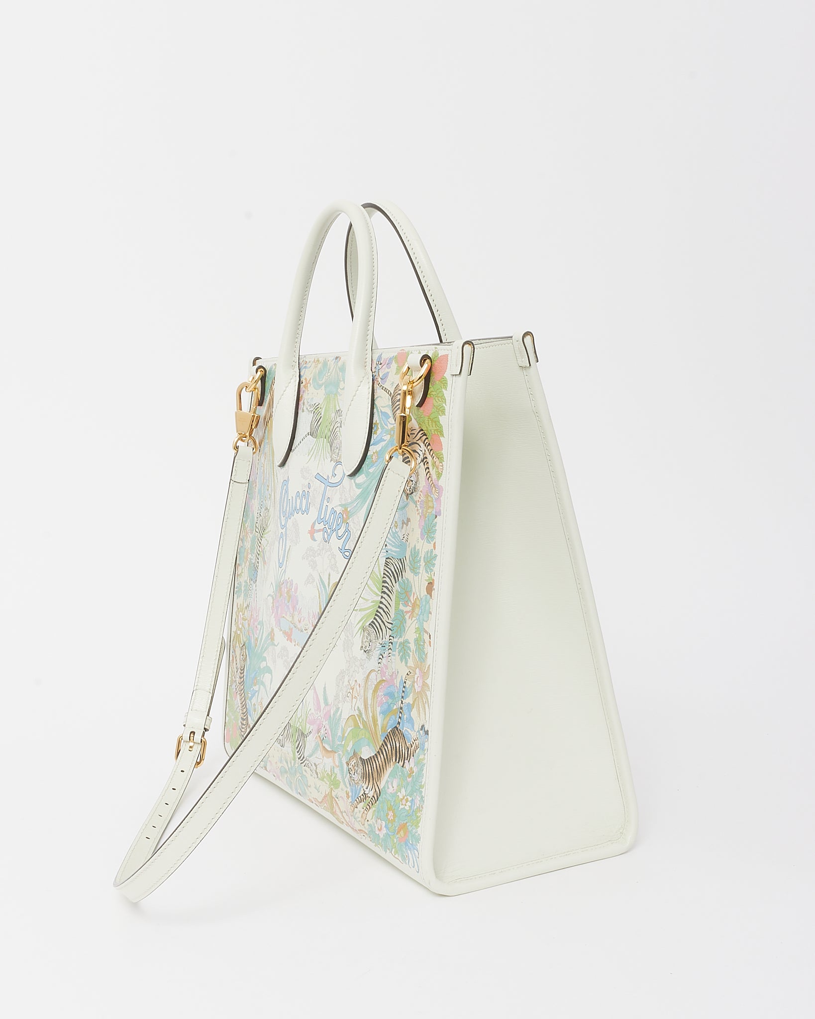 Make a bold statement with this pre-loved authentic Gucci White/Blue/Multi Coated Canvas Medium Tiger Tote with Strap. Crafted from durable coated canvas, this standout tote showcases Gucci’s iconic tiger motif overlaid on a signature GG Supreme print in vibrant, contrasting tones. The structured silhouette is balanced by sleek leather trim and dual top handles, while a detachable and adjustable shoulder strap offers hands-free versatility. Spacious and stylish, the tote opens to a canvas-lined interior with ample room for your daily essentials, making it the perfect blend of artful design and everyday function.