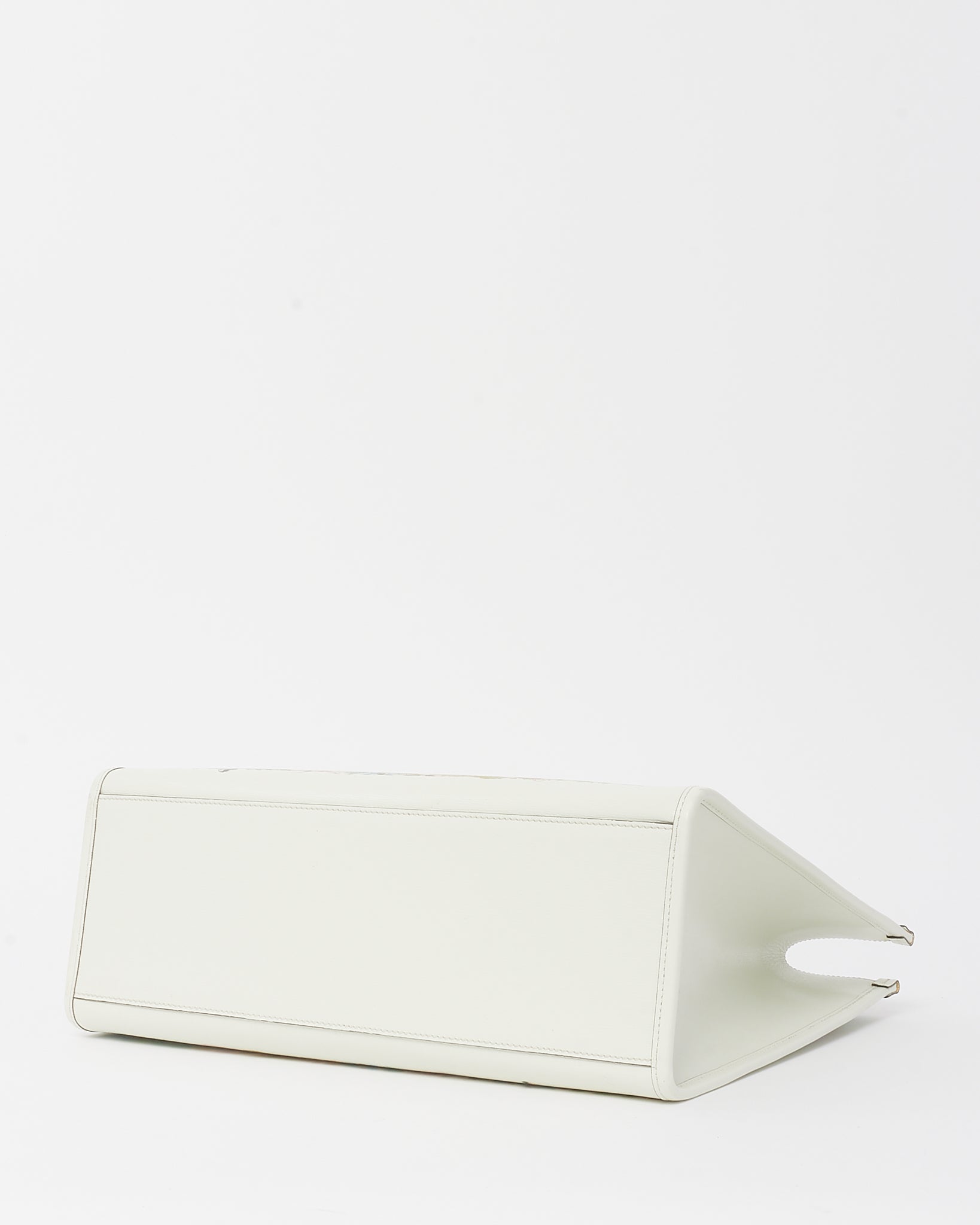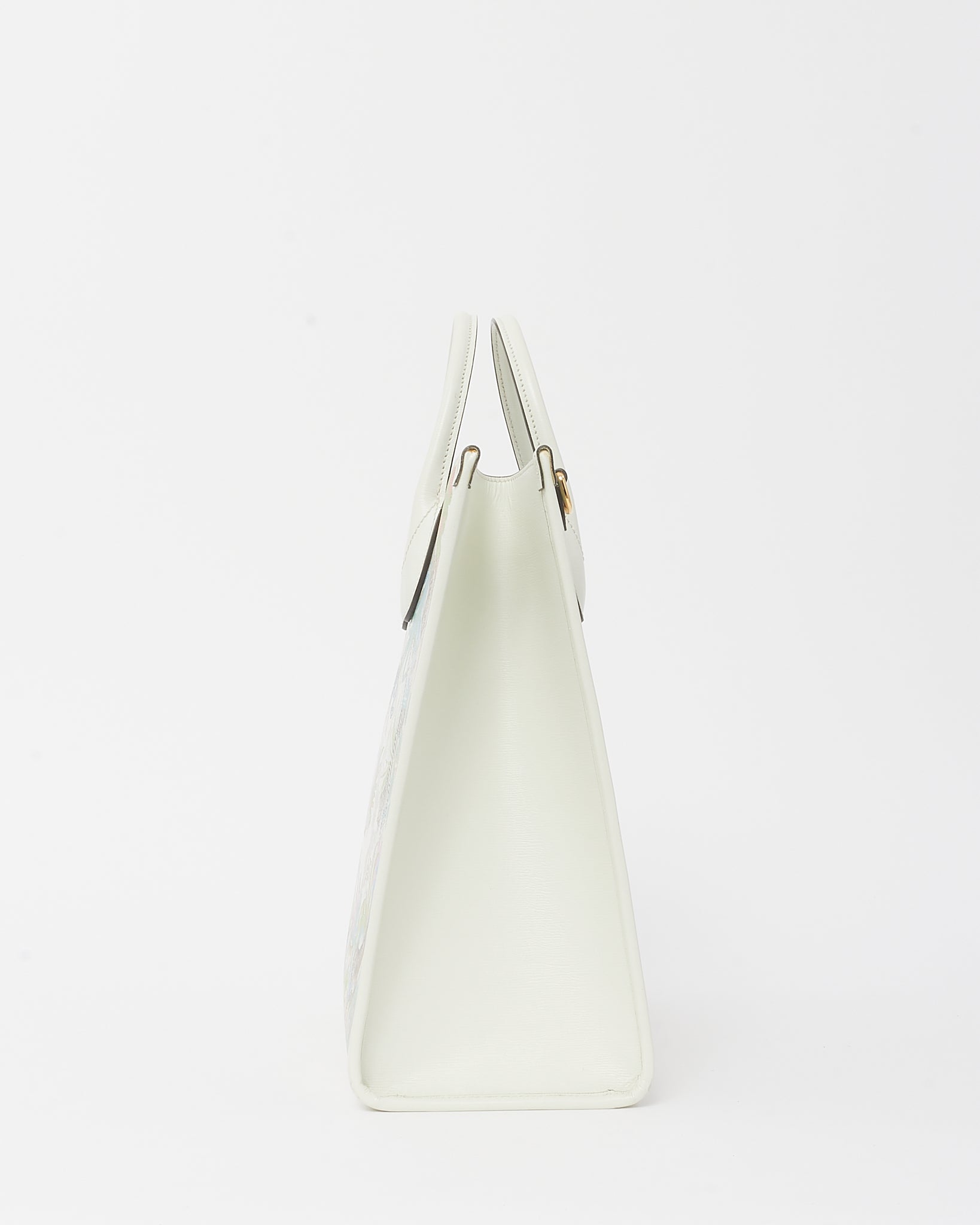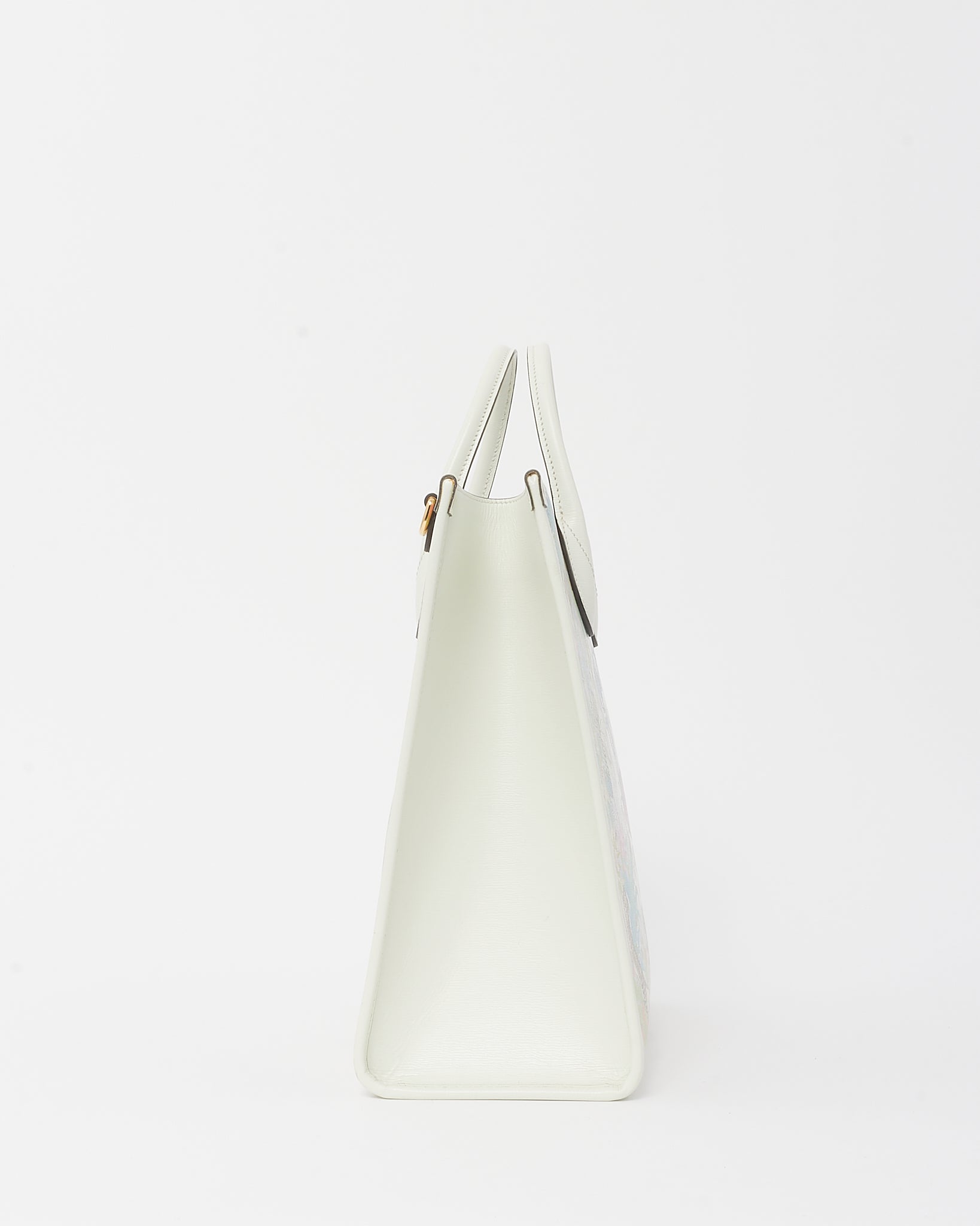 Make a bold statement with this pre-loved authentic Gucci White/Blue/Multi Coated Canvas Medium Tiger Tote with Strap. Crafted from durable coated canvas, this standout tote showcases Gucci’s iconic tiger motif overlaid on a signature GG Supreme print in vibrant, contrasting tones. The structured silhouette is balanced by sleek leather trim and dual top handles, while a detachable and adjustable shoulder strap offers hands-free versatility. Spacious and stylish, the tote opens to a canvas-lined interior with ample room for your daily essentials, making it the perfect blend of artful design and everyday function.