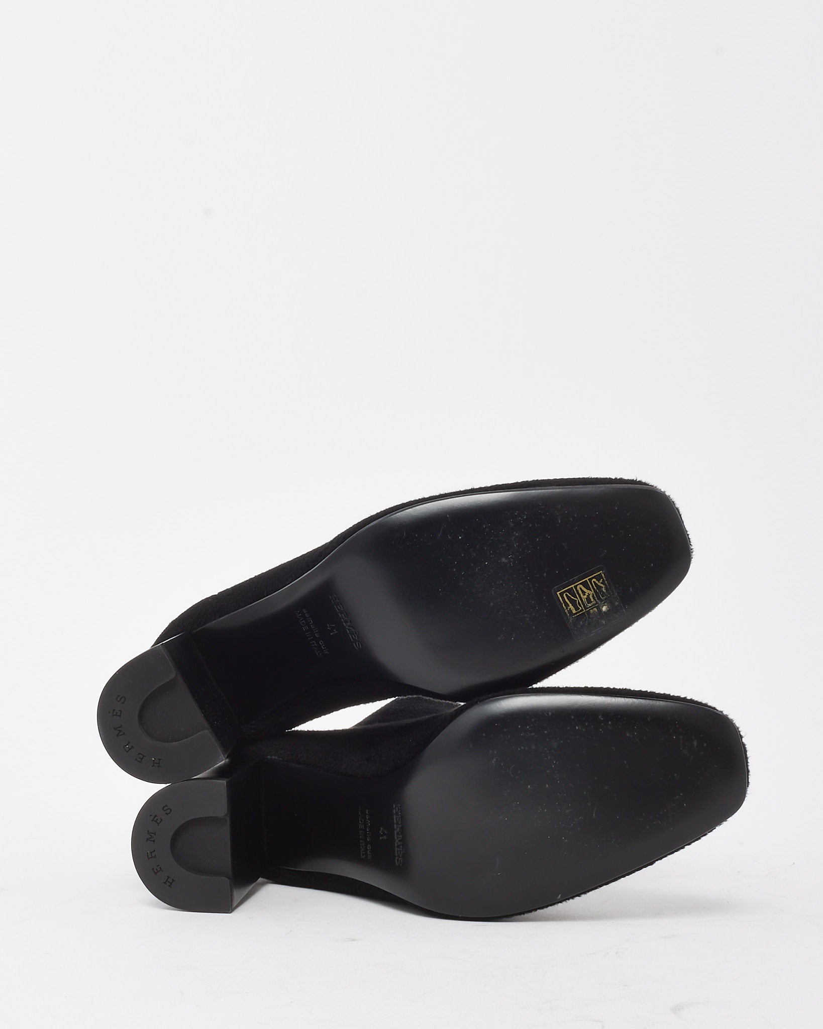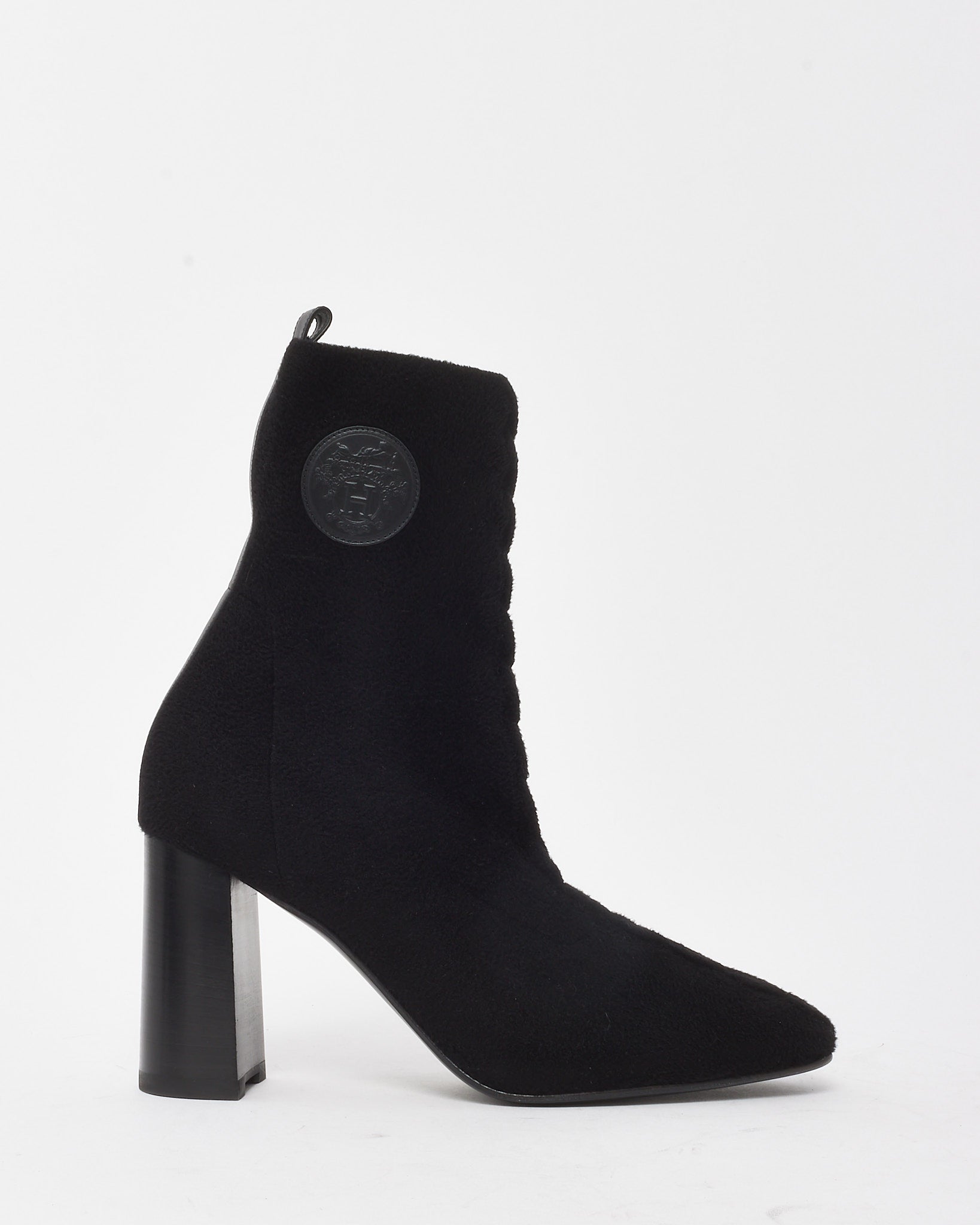 Elevate your cold-weather wardrobe with these pre-loved authentic Hermès Black Chenille Knit Fabric Jenna 90 Ankle Boots in size 41. Expertly crafted in rich black chenille knit, these sleek sock-style boots offer a snug, sculpted fit that blends high fashion with tactile comfort. The pointed toe silhouette and 90mm sculptural heel add architectural elegance, while the pull-on design ensures effortless wear. A chic interpretation of modern minimalism, these boots transition seamlessly from day to night, pairing beautifully with everything from tailored trousers to fluid skirts.