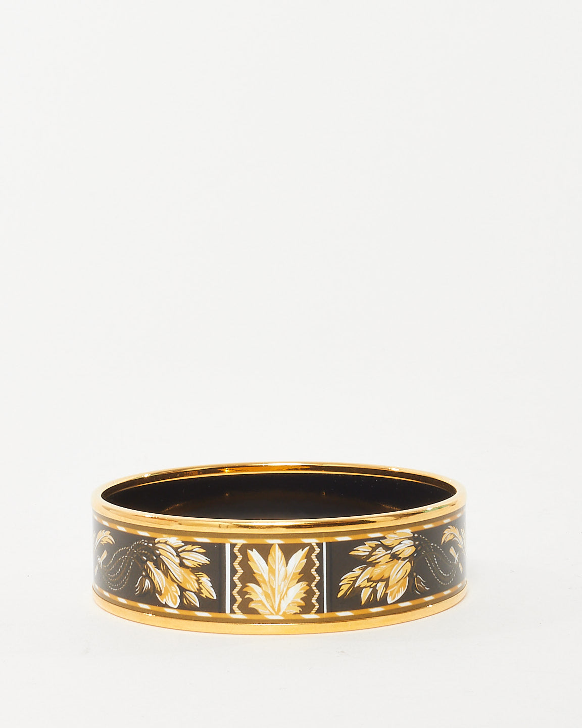 Bold yet refined, this authentic pre-owned Hermès Black & Gold Enamel Printed Brazil Wide Bangle Bracelet is a stunning tribute to the brand’s iconic equestrian heritage. Featuring the celebrated “Brazil” motif in gold against a rich black enamel backdrop, this wide bangle is framed with polished gold-tone trim for a striking finish.