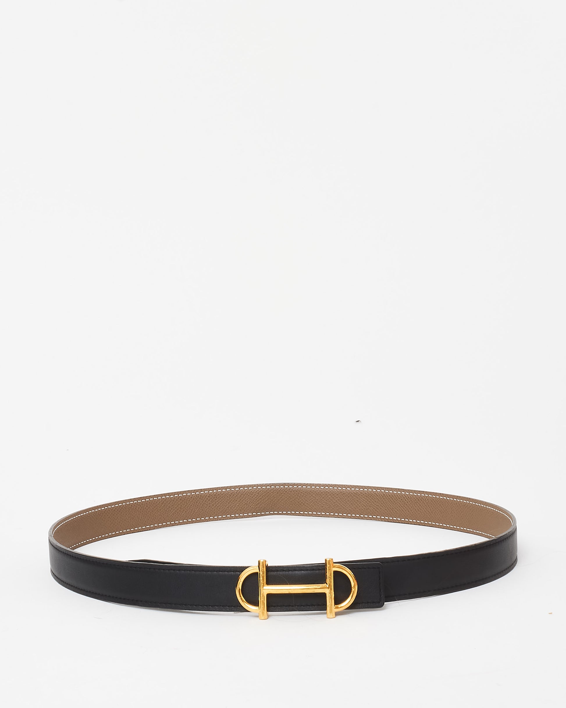 Understated luxury meets everyday versatility in the pre-owned authentic Hermès Black Swift/Etoupe Epsom Leather Reversible Belt with Gold Gamma Buckle. This elegant 24mm belt features smooth black Swift leather on one side and textured Etoupe Epsom leather on the reverse, offering two timeless looks in one streamlined accessory.