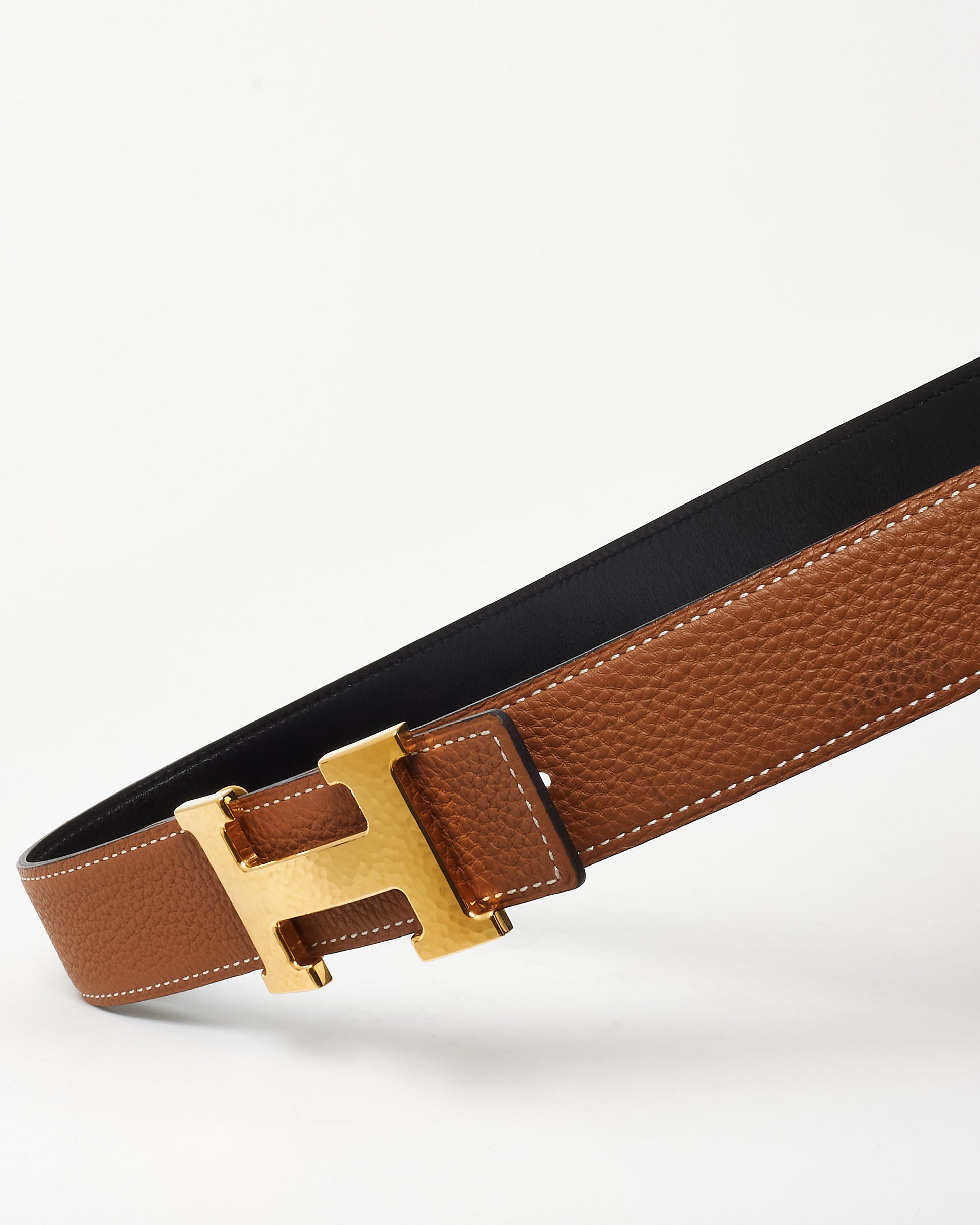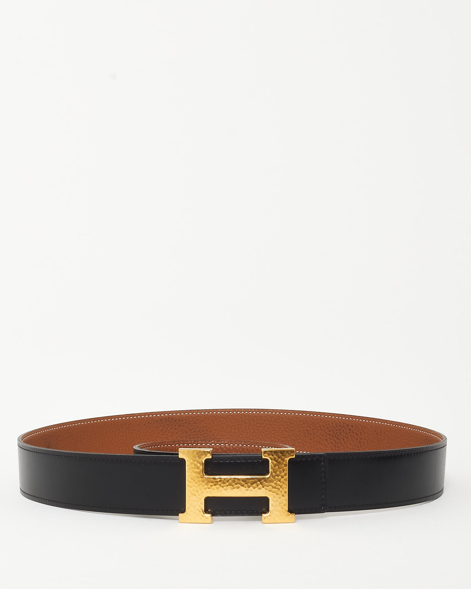 Black Swift & Tan Togo Leather Reversible Gold H Martelee 32mm Belt - 95