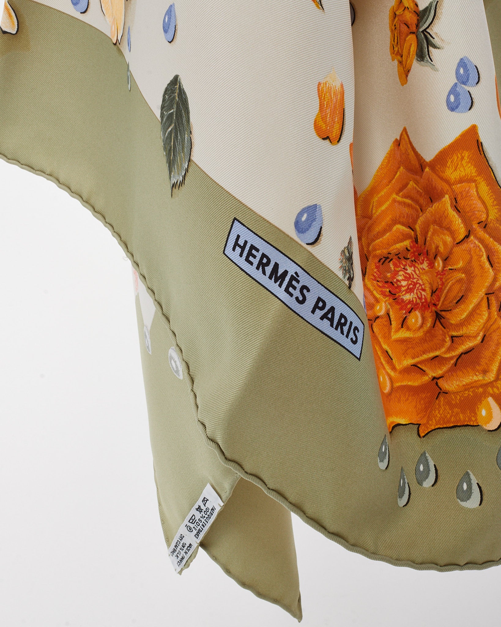 A celebration of artistry and elegance, this pre-loved authentic Hermès “La Rosée Rose Drop” scarf features a vivid palette of green, orange, and multicolor hues printed on luxurious pure silk. The design evokes the freshness of morning dew with delicate floral and botanical motifs, bringing a poetic flair to any wardrobe. Whether worn as a neck scarf, head wrap, or bag accent, it’s a timeless accessory that captures the essence of refined Parisian style.