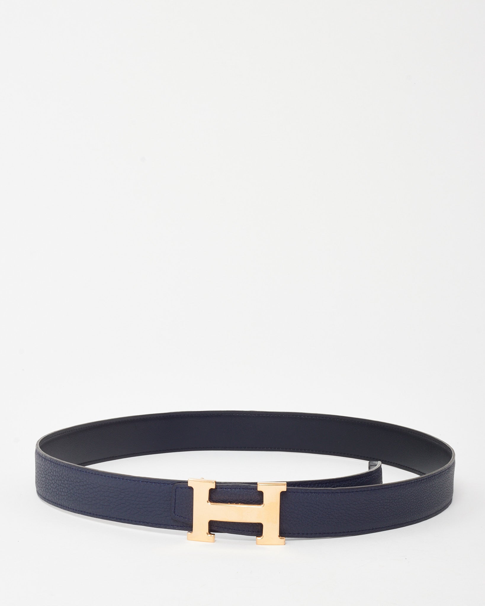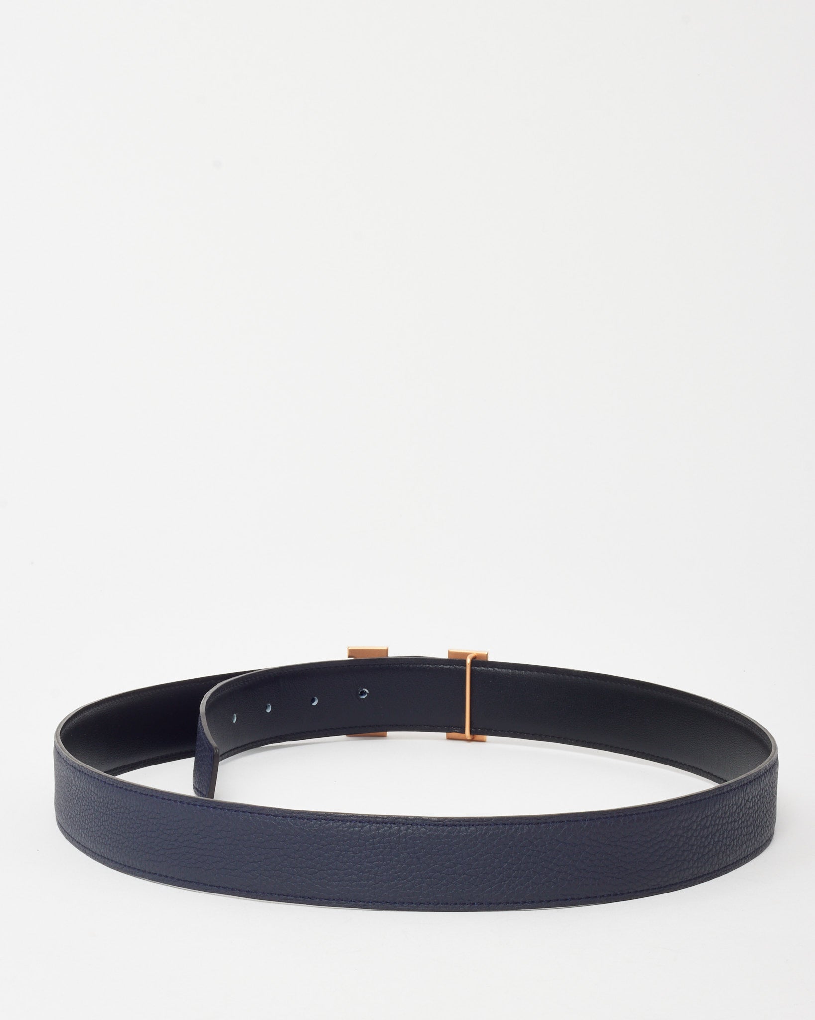 Timeless and versatile, this pre-loved authentic Hermès Navy Blue Nuit Togo and Black Swift Leather Reversible 32mm Rose Gold H Belt combines elegant craftsmanship with everyday luxury. Crafted from premium Togo leather on one side and smooth Swift leather on the other, it features a reversible design in navy and black tones for two refined looks. Finished with the iconic gold-tone “H” buckle, this belt offers a polished statement that complements both casual and formal attire. A classic Hermès accessory that defines sophistication and style.