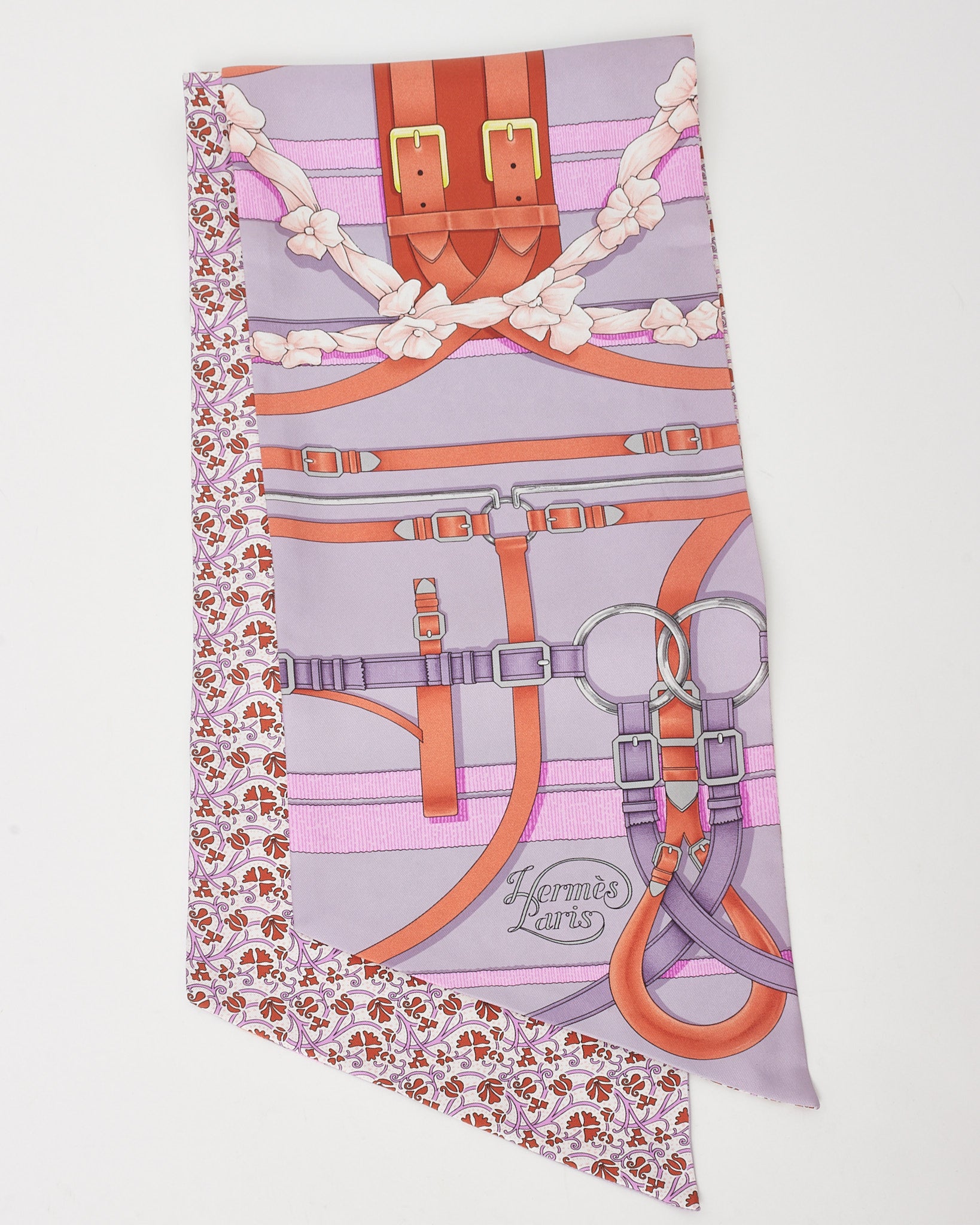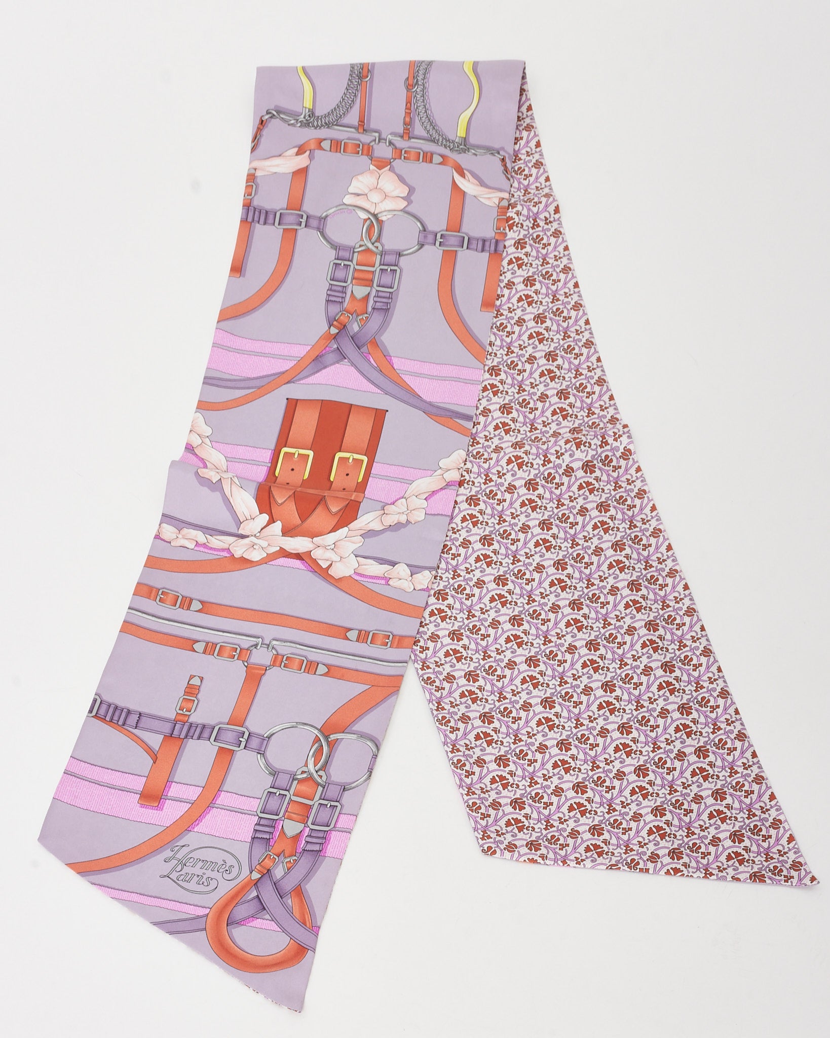 A striking display of equestrian elegance, this pre-loved authentic Hermès Grand Manège Maxi Twilly scarf comes alive in a radiant mix of purple, orange, and multicolor hues on pure silk. Featuring Henri d’Origny’s iconic harness-inspired design, this elongated XL silhouette offers endless styling versatility—drape it as a neck scarf, belt, or bag accessory. A bold, collectible piece for any luxury wardrobe.