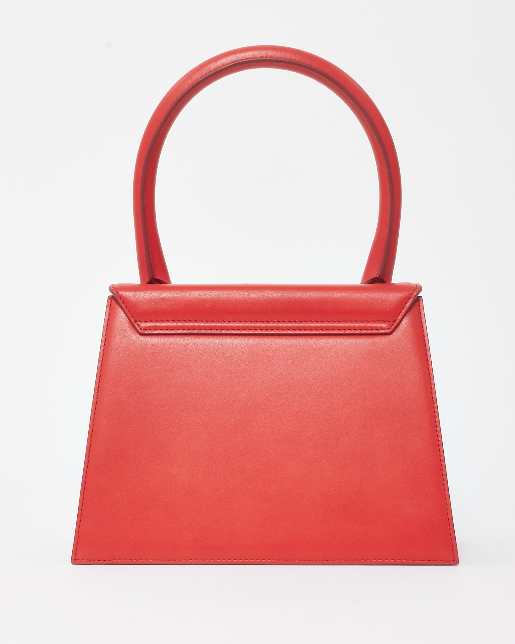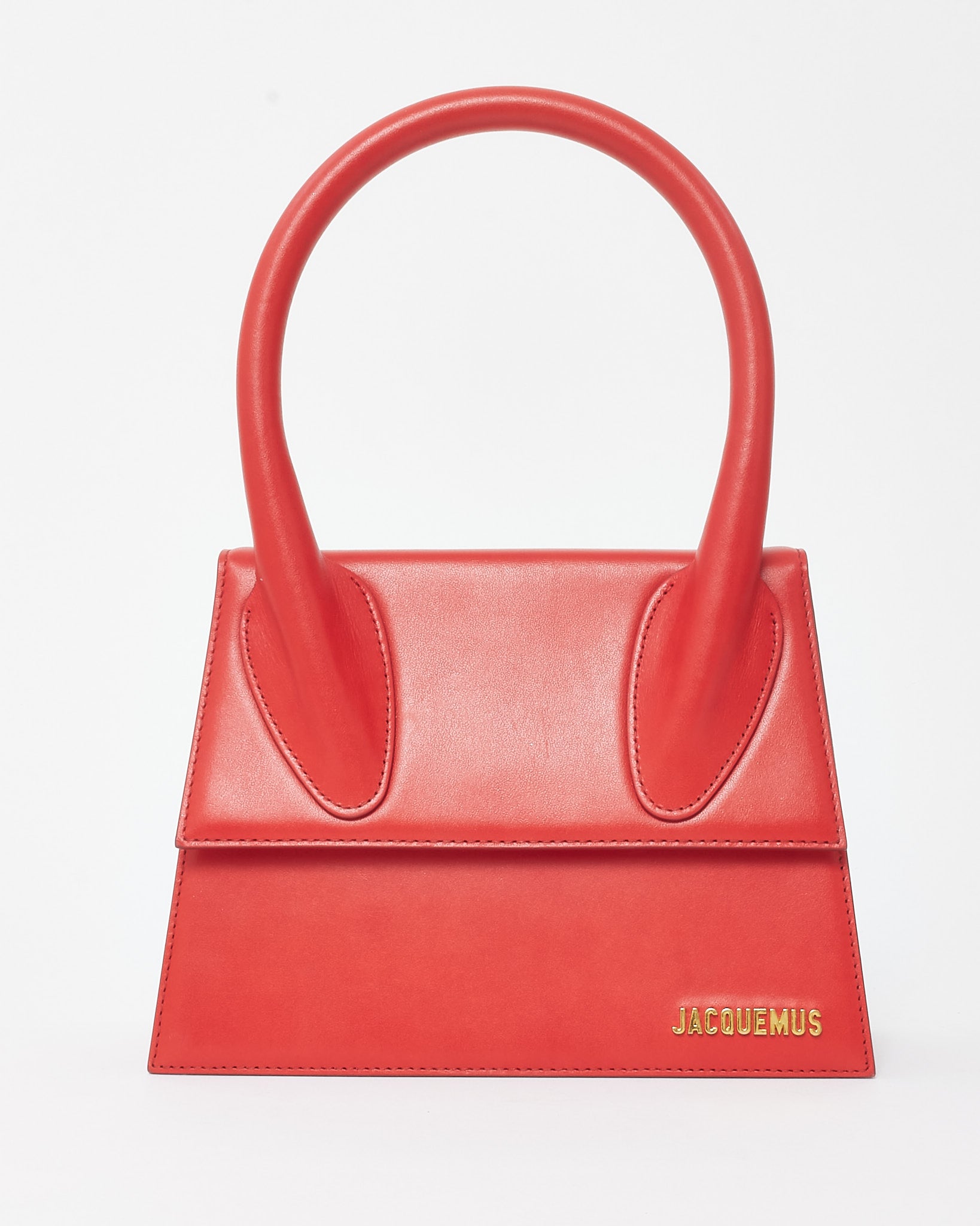 Bold and sculptural, the Jacquemus “Le Grand Chiquito” bag makes a daring statement in smooth red leather. Defined by its exaggerated top handle and structured silhouette, this standout piece features gold-tone logo lettering on the front and includes a detachable shoulder strap for crossbody styling. The flap front opens to a compact interior, perfect for carrying just the essentials. A modern icon of playful sophistication, it’s the ultimate accessory to elevate any fashion-forward wardrobe.