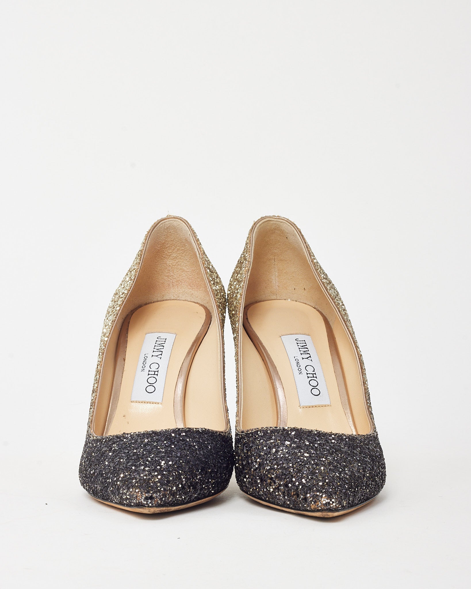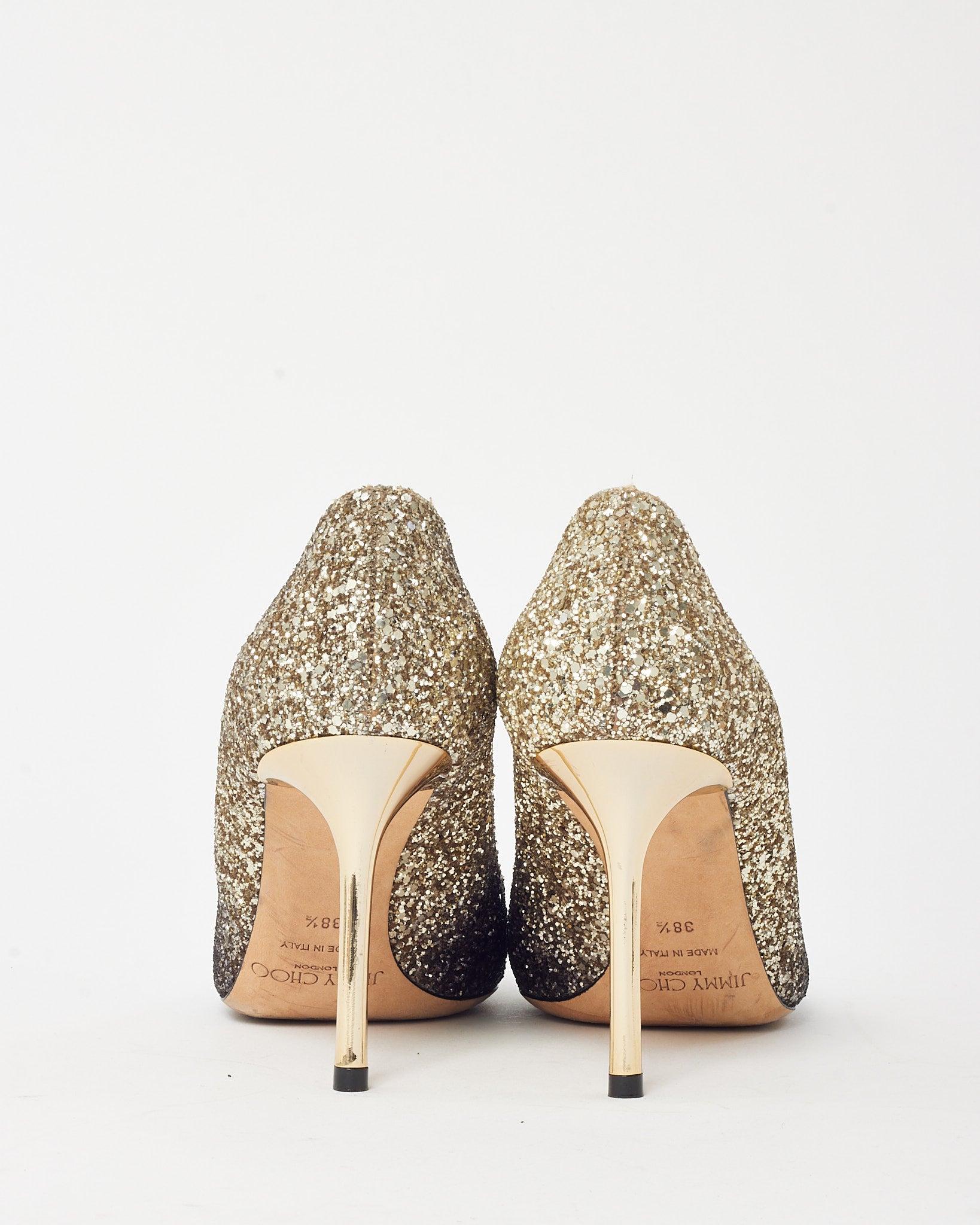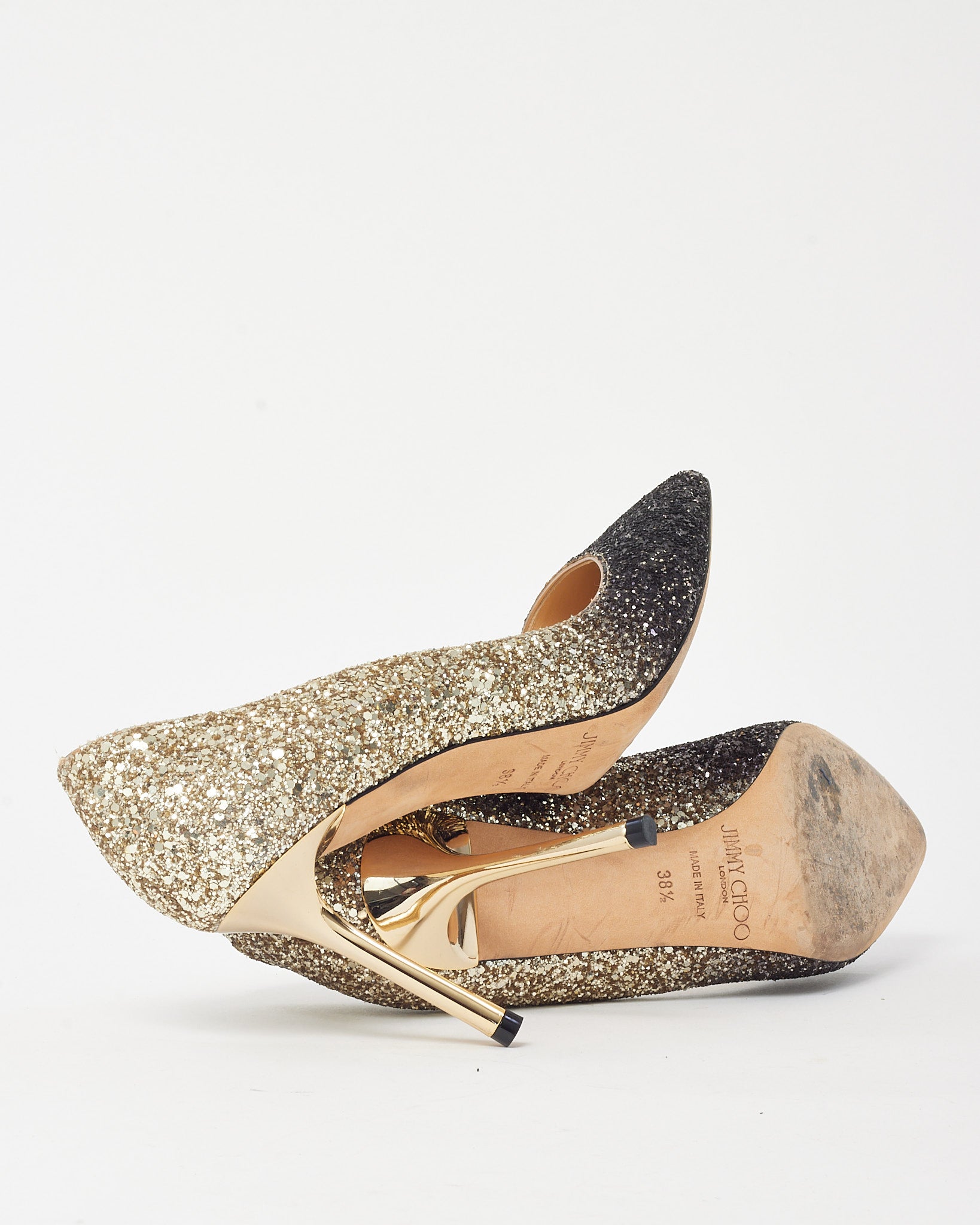 Step into glamor with these pre-loved authentic Jimmy Choo Black and Gold Glitter Ombre Fabric Romy 85 Pumps in size 38.5. Designed in the brand’s iconic pointed-toe silhouette, these heels dazzle with an ombre glitter finish that fades from rich black to shimmering gold. The 85mm stiletto heel offers elegant lift, while the leather lining ensures comfort with every step. Perfect for evening events or festive occasions, they bring a radiant finish to any sophisticated look.