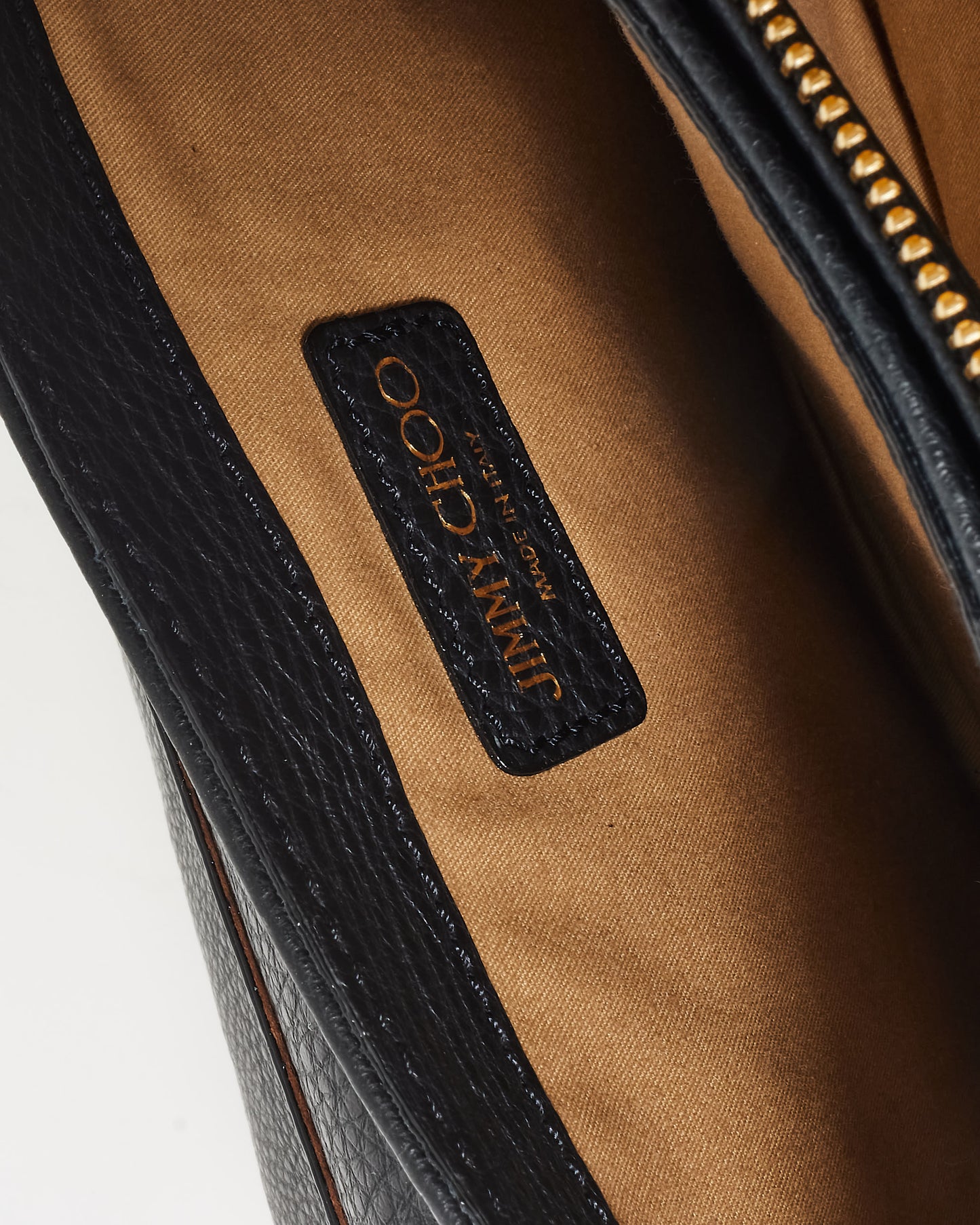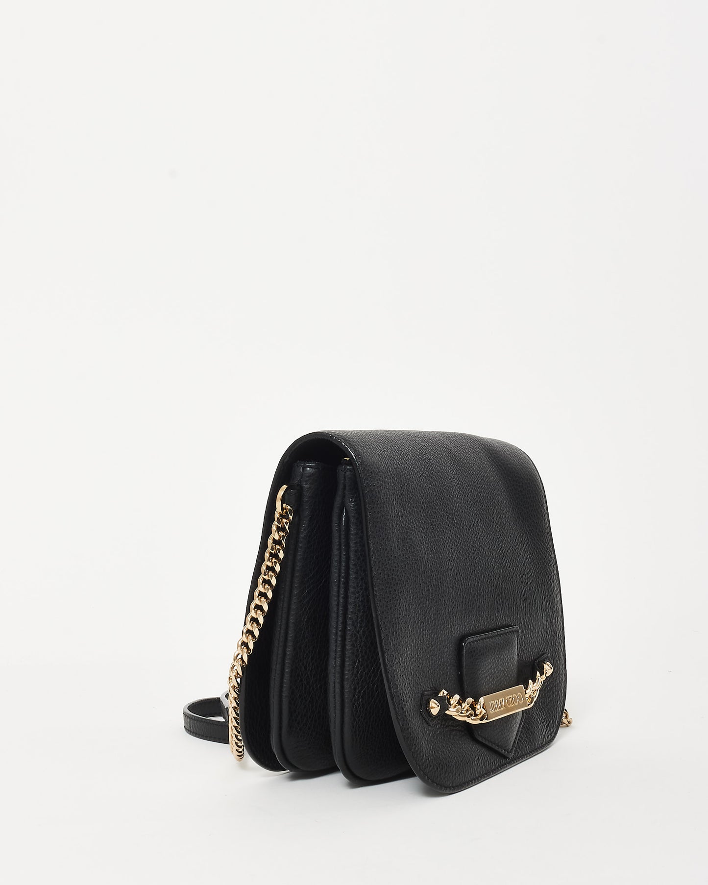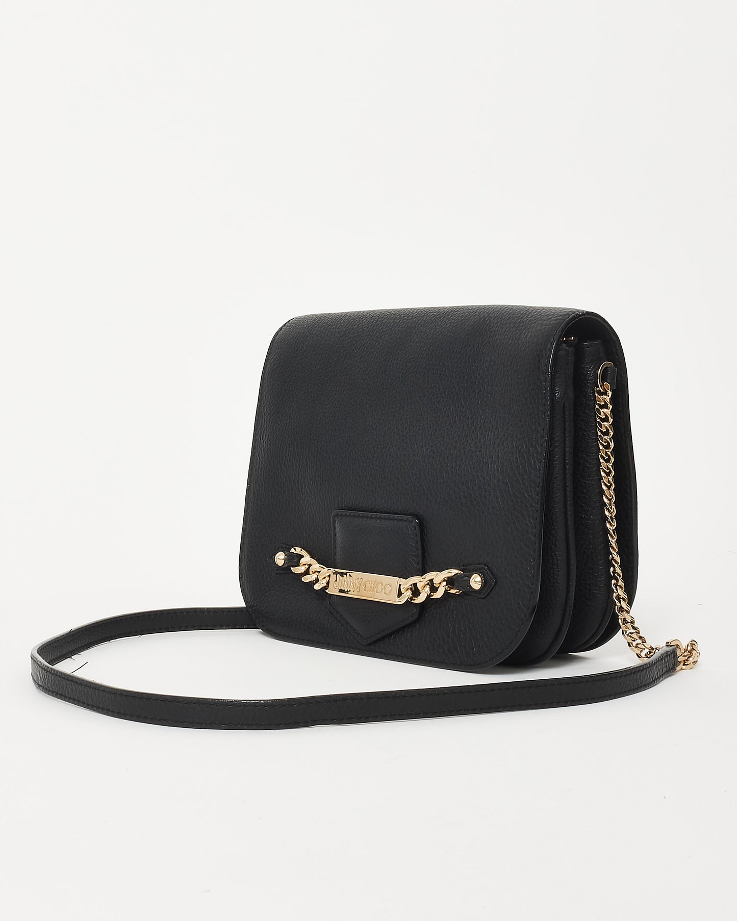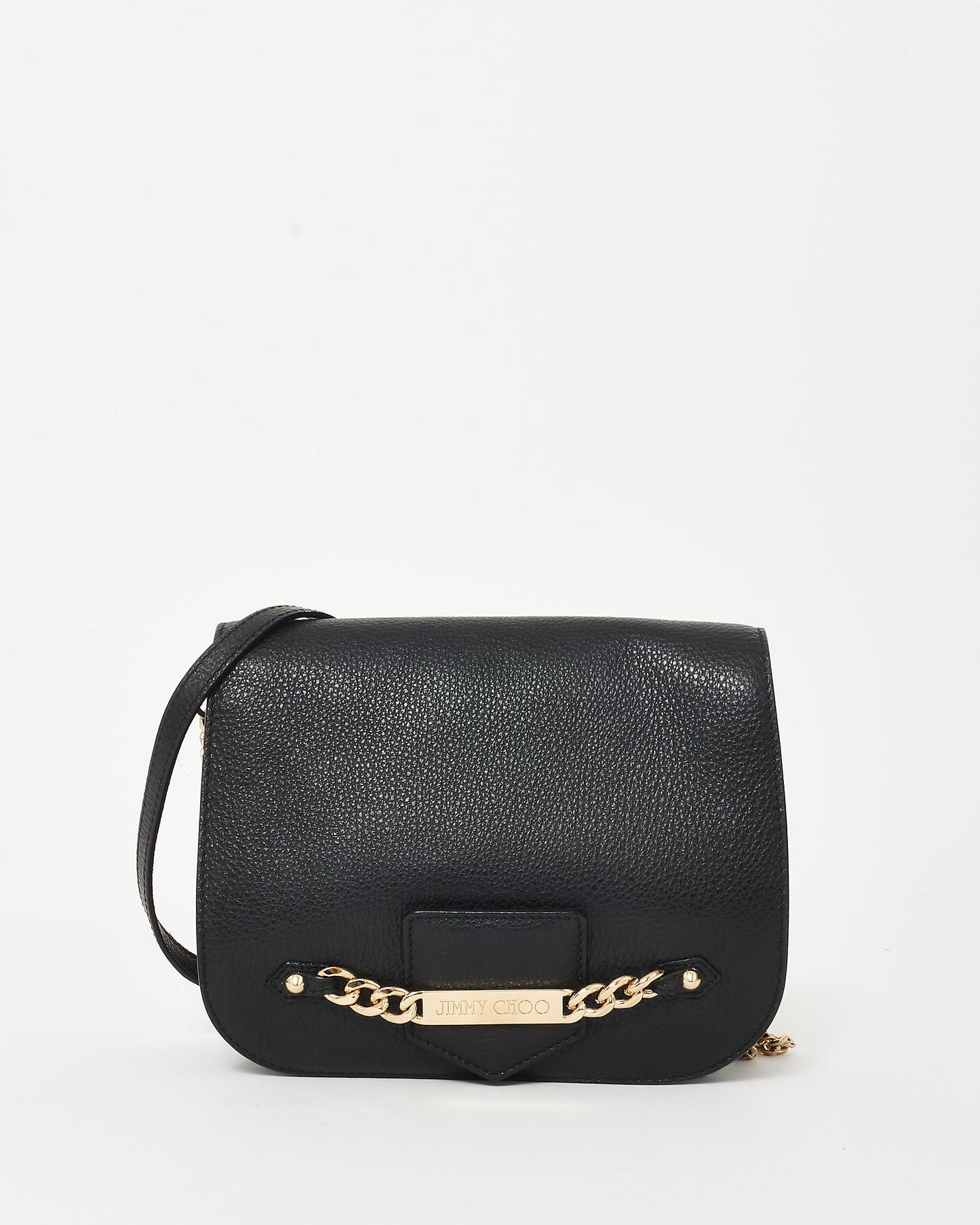 This pre-owned authentic Jimmy Choo Black Leather Shadow Crossbody Bag is a sophisticated accessory that combines elegance with practicality. Crafted from high-quality black grained leather, it features gold-tone hardware, including a distinctive curb chain strap and the iconic Jimmy Choo logo plate on the front flap. Curb chain crossbody strap with a 22-inch drop. Closure: Flap top with magnetic snap closure. Interior: Dual compartments—front zip compartment and back open compartment—with suede lining. Shop pre-owned authentic Jimmy Choo handbags and shoes at Retyche.