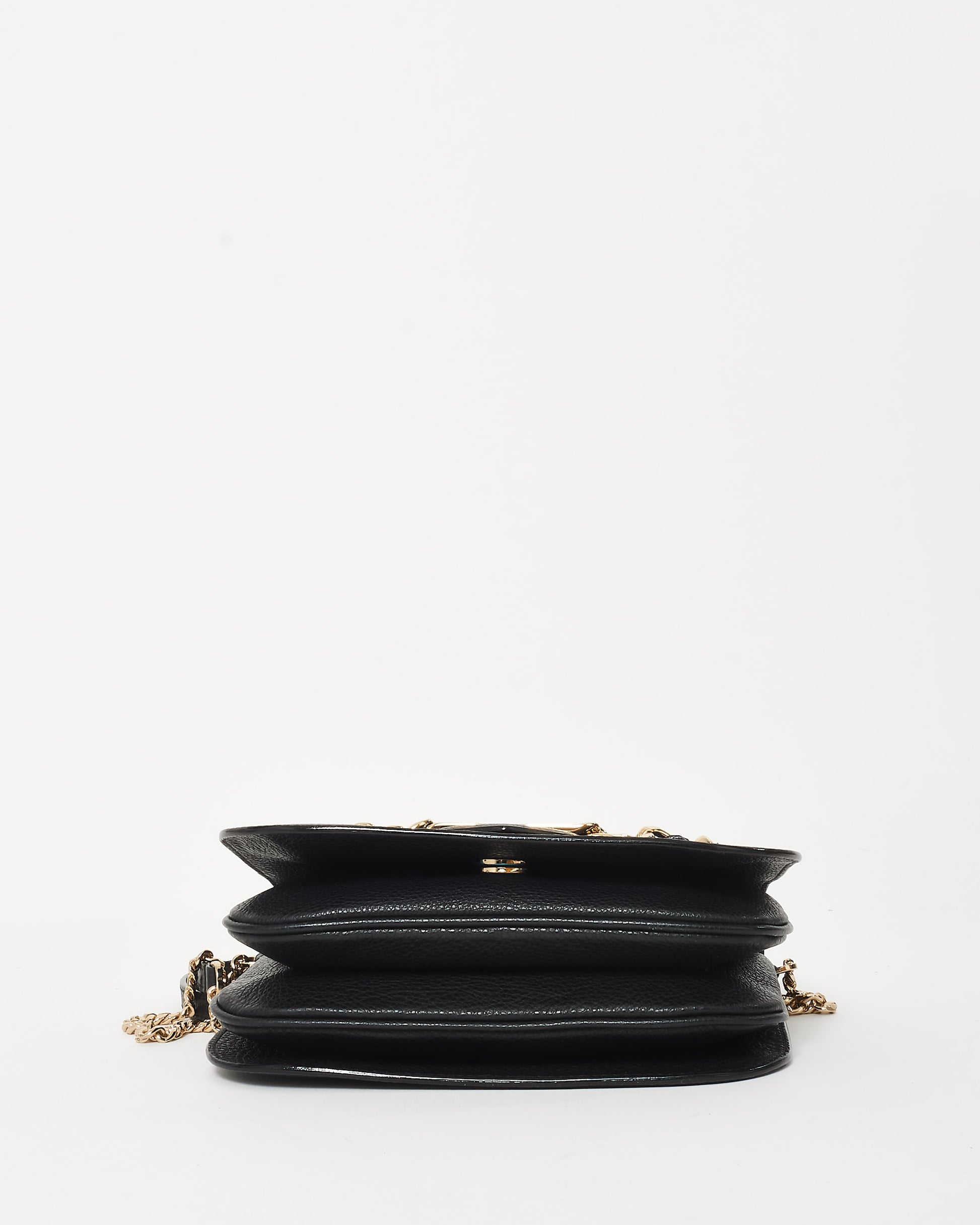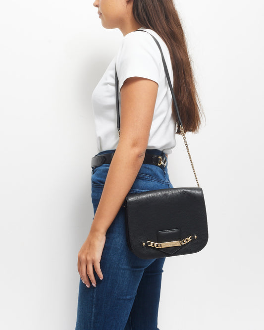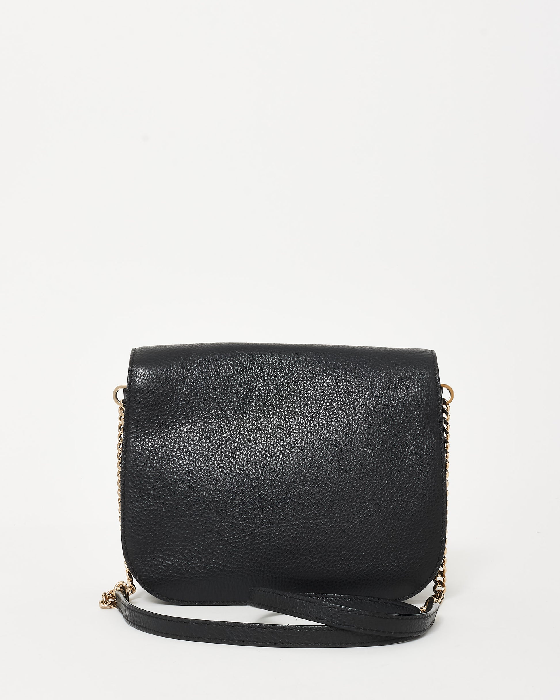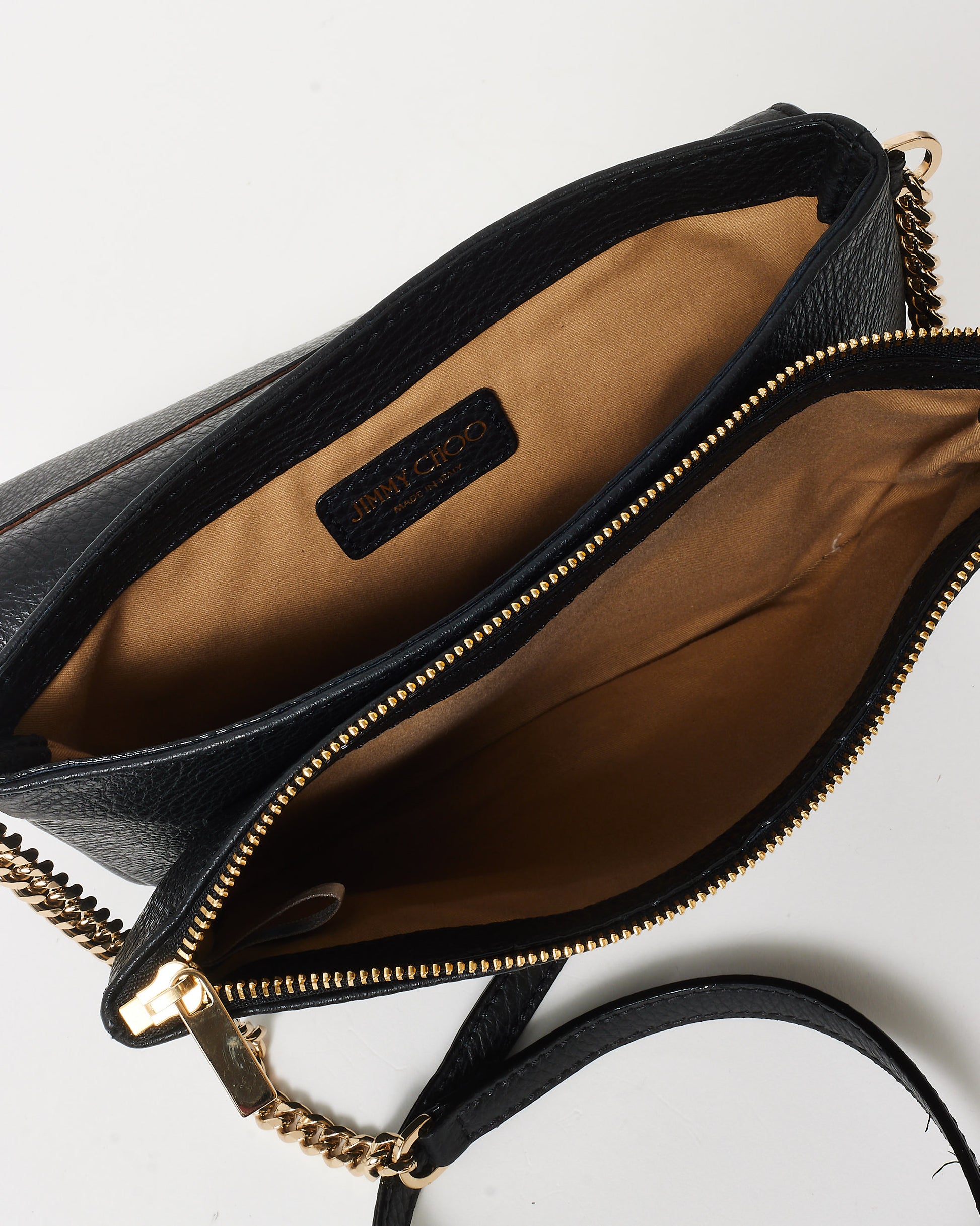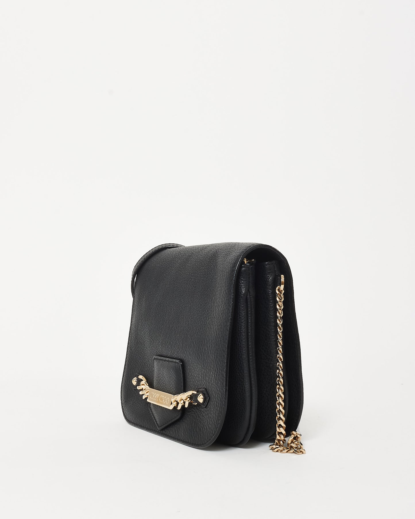 This pre-owned authentic Jimmy Choo Black Leather Shadow Crossbody Bag is a sophisticated accessory that combines elegance with practicality. Crafted from high-quality black grained leather, it features gold-tone hardware, including a distinctive curb chain strap and the iconic Jimmy Choo logo plate on the front flap. Curb chain crossbody strap with a 22-inch drop. Closure: Flap top with magnetic snap closure. Interior: Dual compartments—front zip compartment and back open compartment—with suede lining. Shop pre-owned authentic Jimmy Choo handbags and shoes at Retyche.