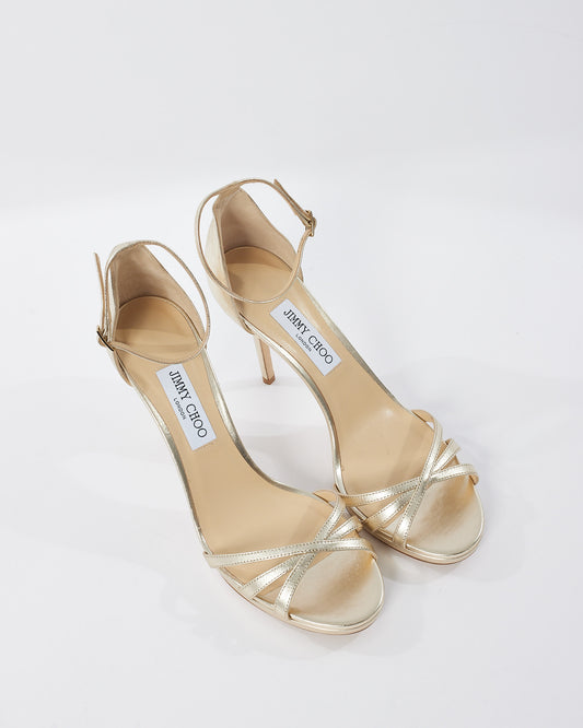 Explore Jimmy Choo's exquisite collection of shoes, featuring this certified pre-owned Champagne Leather Dinda High Heel Sandals. Embodying timeless elegance and modern sustainability, each piece, including favorites like this, is authenticated by Retyche. Discover sustainable luxury — shop our current treasures or find inspiration for your next coveted find.