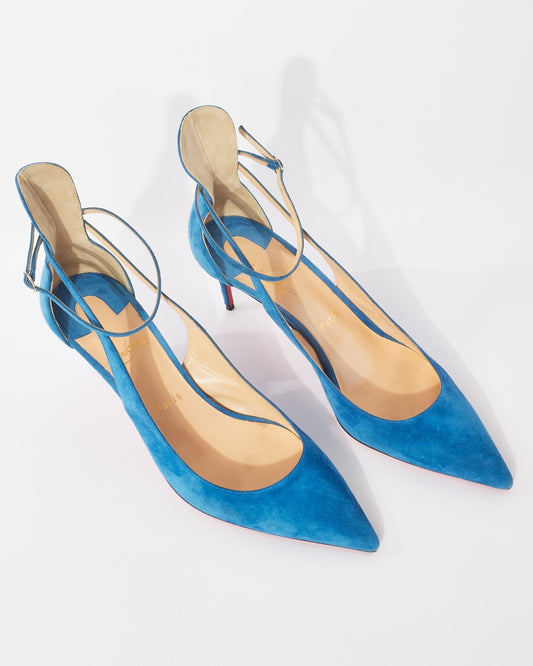 Explore Christian Louboutin's exquisite collection of shoes, featuring this certified pre-owned Christian Louboutin Turquoise Suede Strappy Pumps. Embodying timeless elegance and modern sustainability, each piece, including favorites like this, is authenticated by Retyche. Discover sustainable luxury — shop our current treasures or find inspiration for your next coveted find.