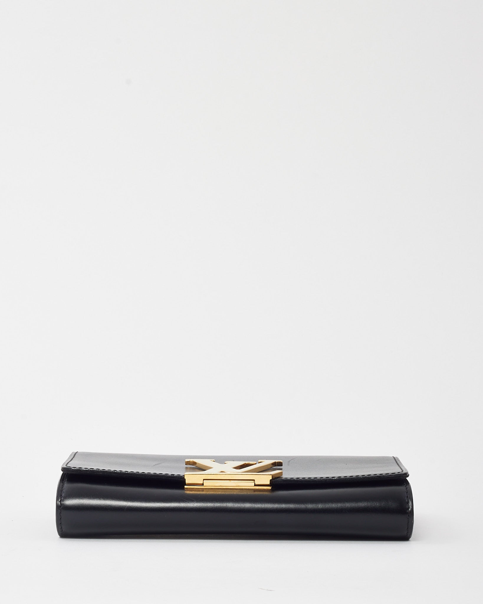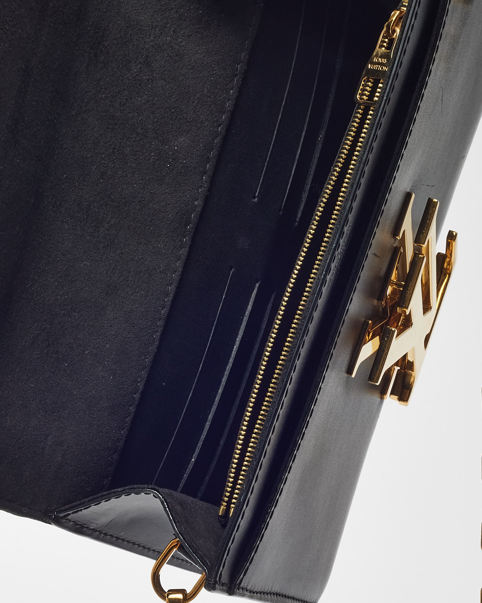 Refined and contemporary, this pre-loved authentic Louis Vuitton Louise Lockme MM Shoulder Bag in smooth black calfskin leather is a sophisticated statement for day or night. The sleek silhouette is accented by the signature LV twist-lock closure in silver-tone hardware, adding a bold yet elegant edge. Designed with a sliding chain strap for shoulder or crossbody wear, and a well-structured interior for your daily essentials, this versatile bag is the perfect blend of modern design and timeless luxury.