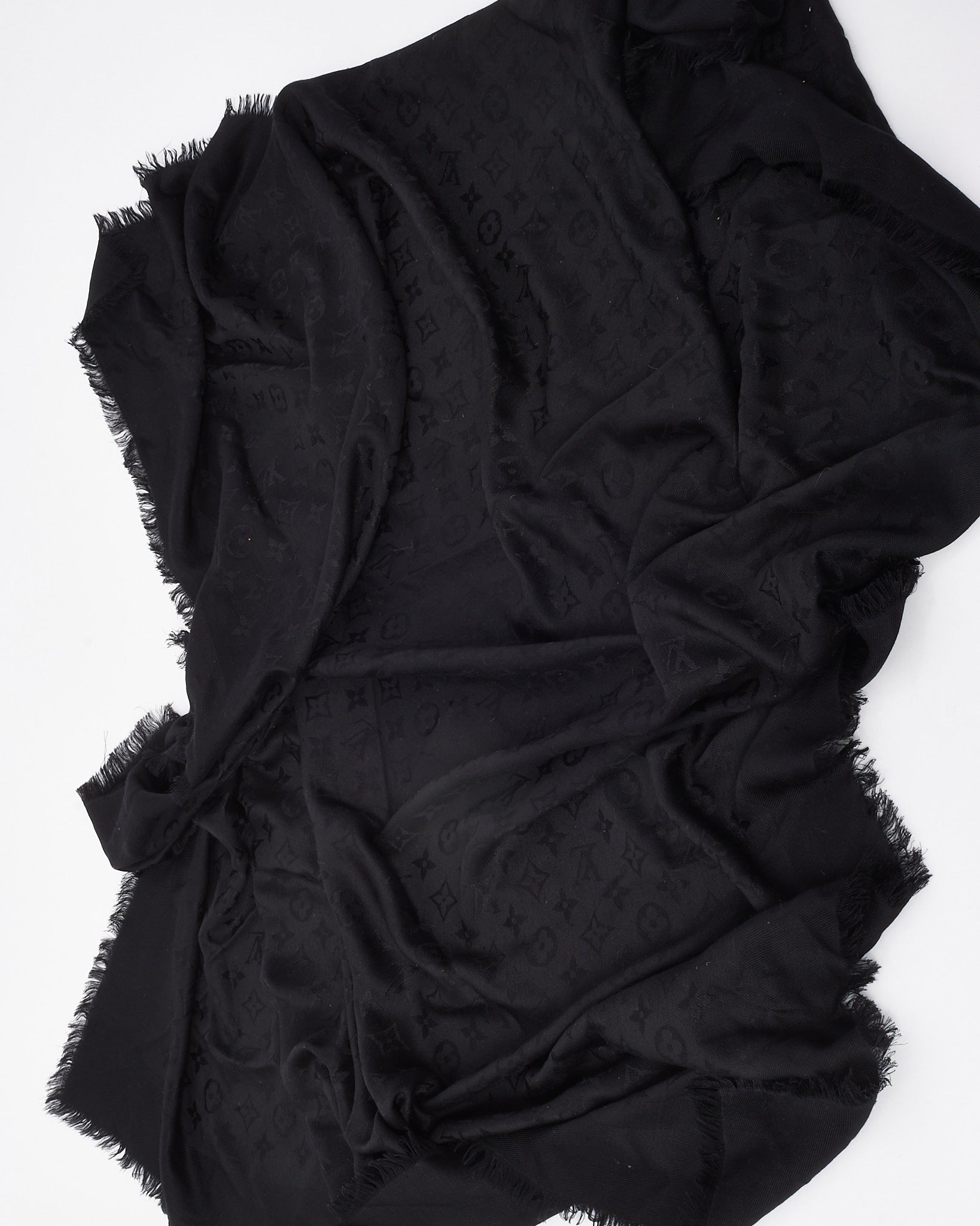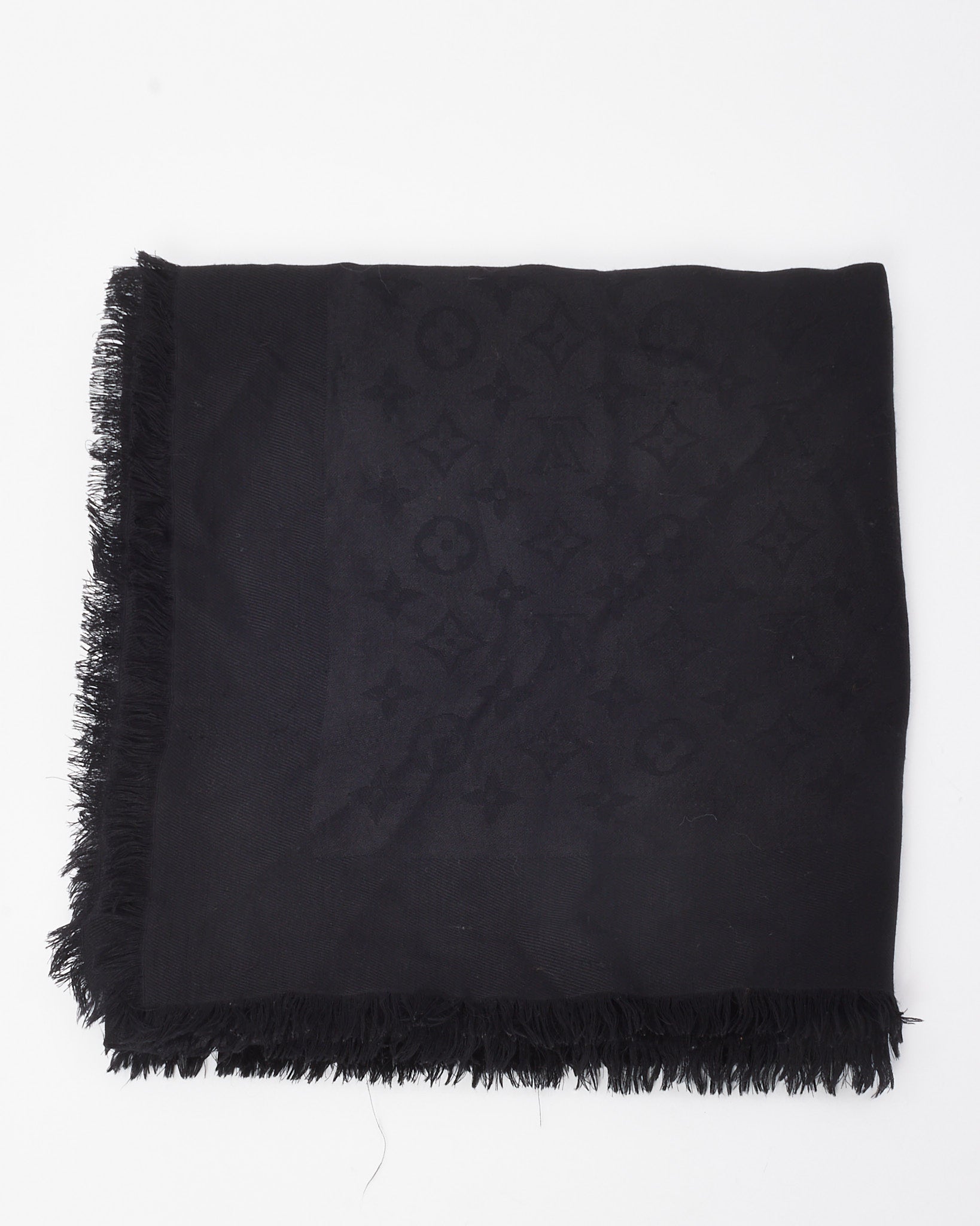 Elevate your layering essentials with this pre-loved authentic Louis Vuitton Black Monogram Shawl. Expertly crafted from a sumptuous blend of silk and wool, this versatile piece showcases the iconic LV monogram subtly woven into a deep black backdrop for an understated yet luxurious finish. Lightweight with a soft, fluid drape, it features delicate fringed edges and generous dimensions—perfect for wrapping, draping, or styling as a statement scarf. A timeless accessory that adds effortless sophistication to both day and evening looks.