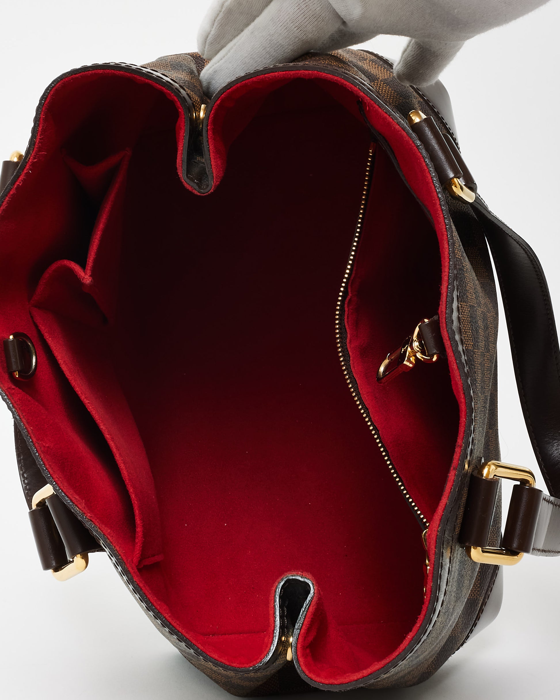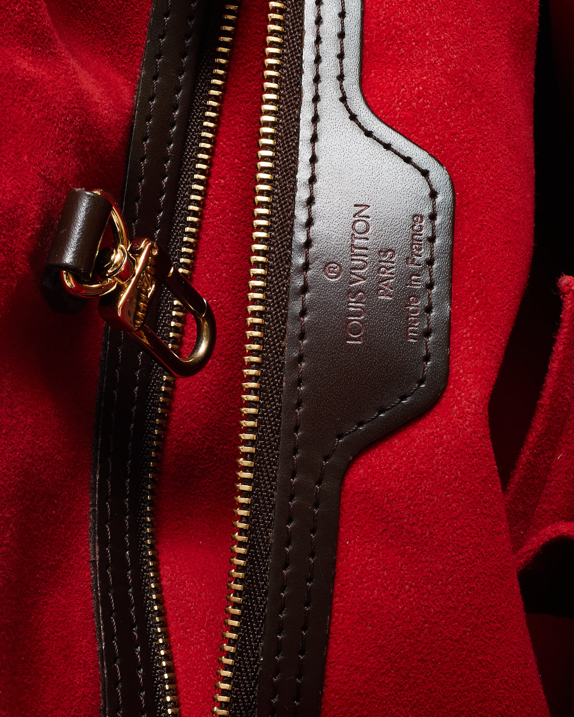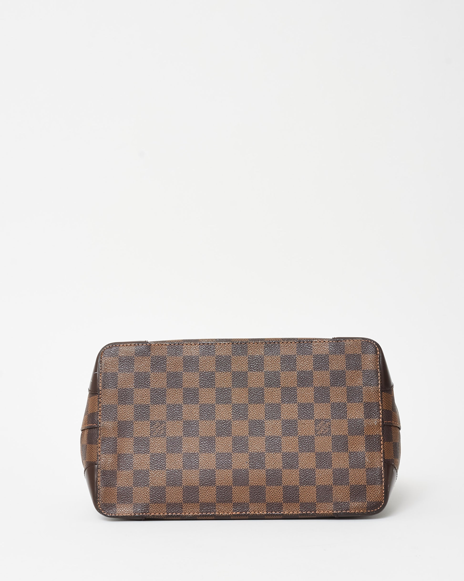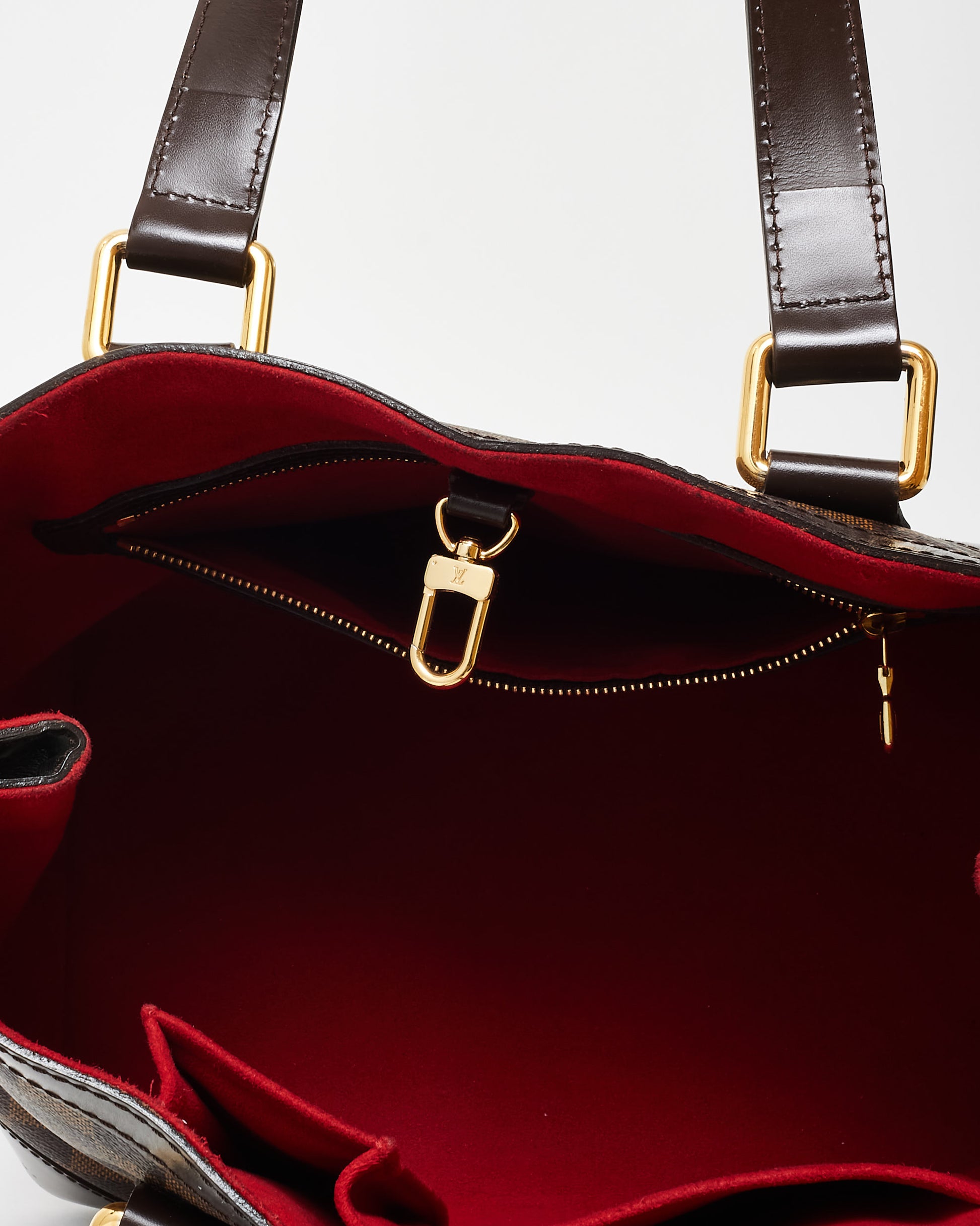 Classic structure meets signature elegance in the pre-owned authentic Louis Vuitton Damier Ebene Coated Canvas Hampstead PM Shoulder Bag. Crafted from durable Damier Ebene coated canvas, this refined tote features rich dark brown leather trim and is finished with gold-tone hardware, including the iconic Louis Vuitton engraved plaque at the front for a polished touch.