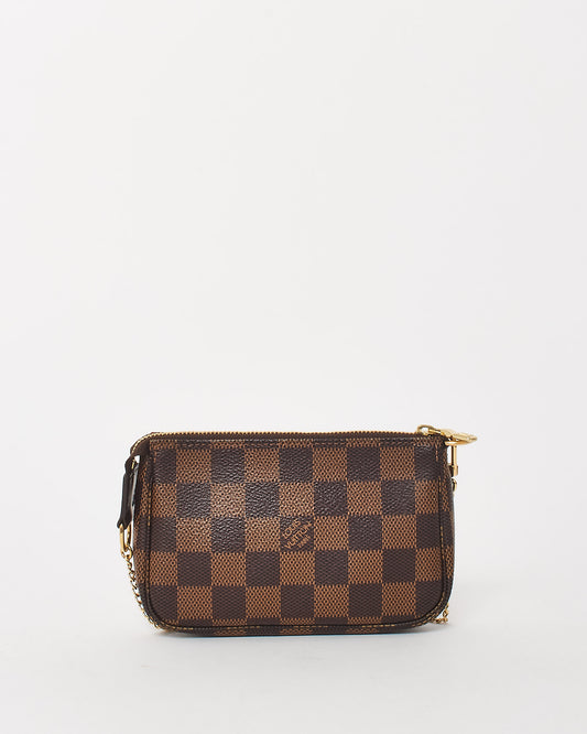 This authentic pre-owned Louis Vuitton Damier Ebene Mini Pochette Accessoires is a chic and versatile accessory, perfect for carrying your essentials in style. Crafted from durable Damier Ebene coated canvas with a luxurious leather trim, this mini pouch effortlessly transitions from a compact clutch to a stylish bag charm or wallet insert. Damier Ebene coated canvas with brown leather trim, gold-tone chain with a hook for attaching to larger bags or carrying as a wristlet, top zip closure with gold-tone hardware, textile lining with space for small essentials. Shop pre-owned Louis Vuitton handbags at Retyche.