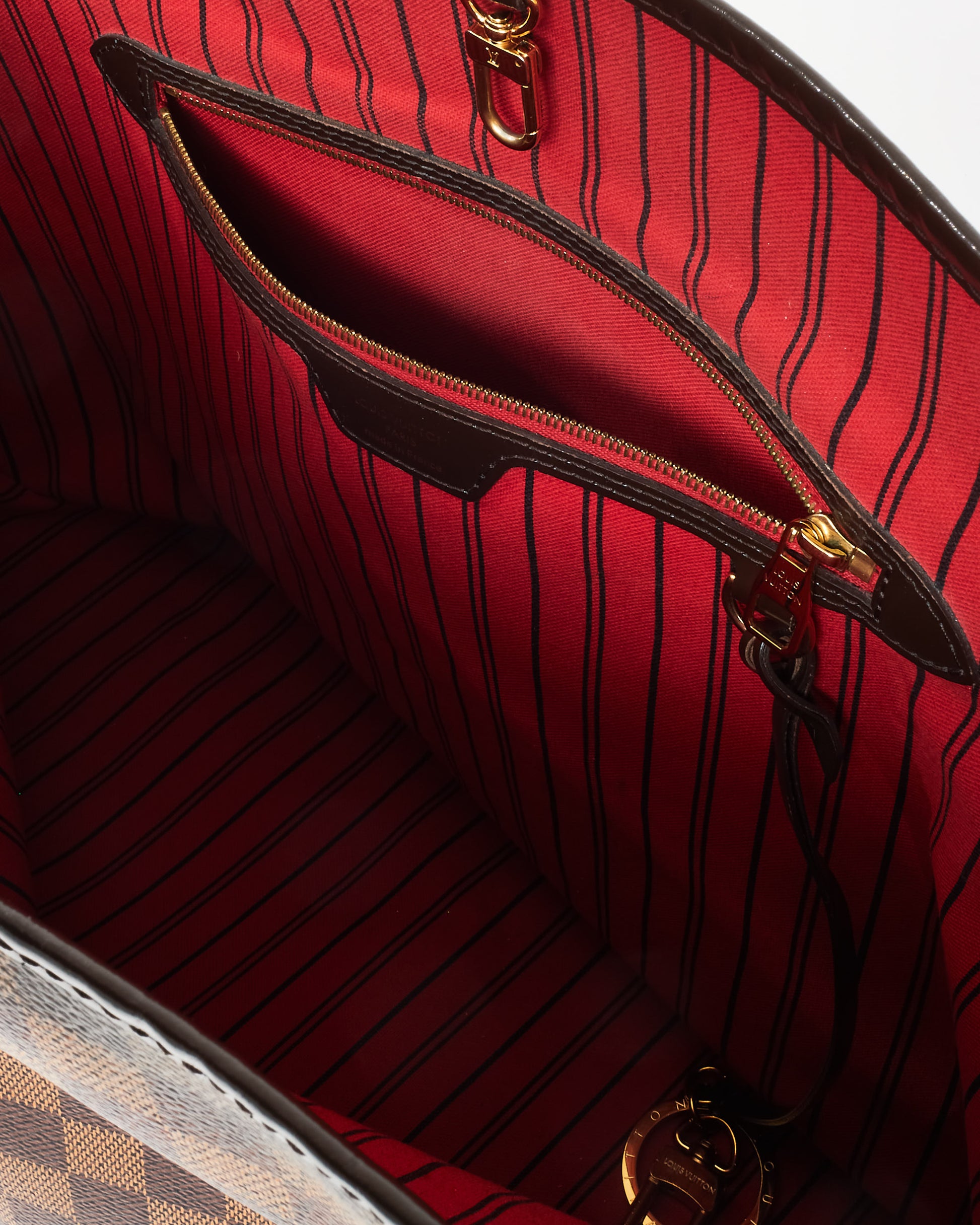 The chocolate brown leather trim and flat shoulder strap provide a comfortable carry, while the gold-tone hardware and engraved LV nameplate add a polished touch. The spacious interior with multiple pockets ensures easy organization, making it ideal for work, errands, or travel.