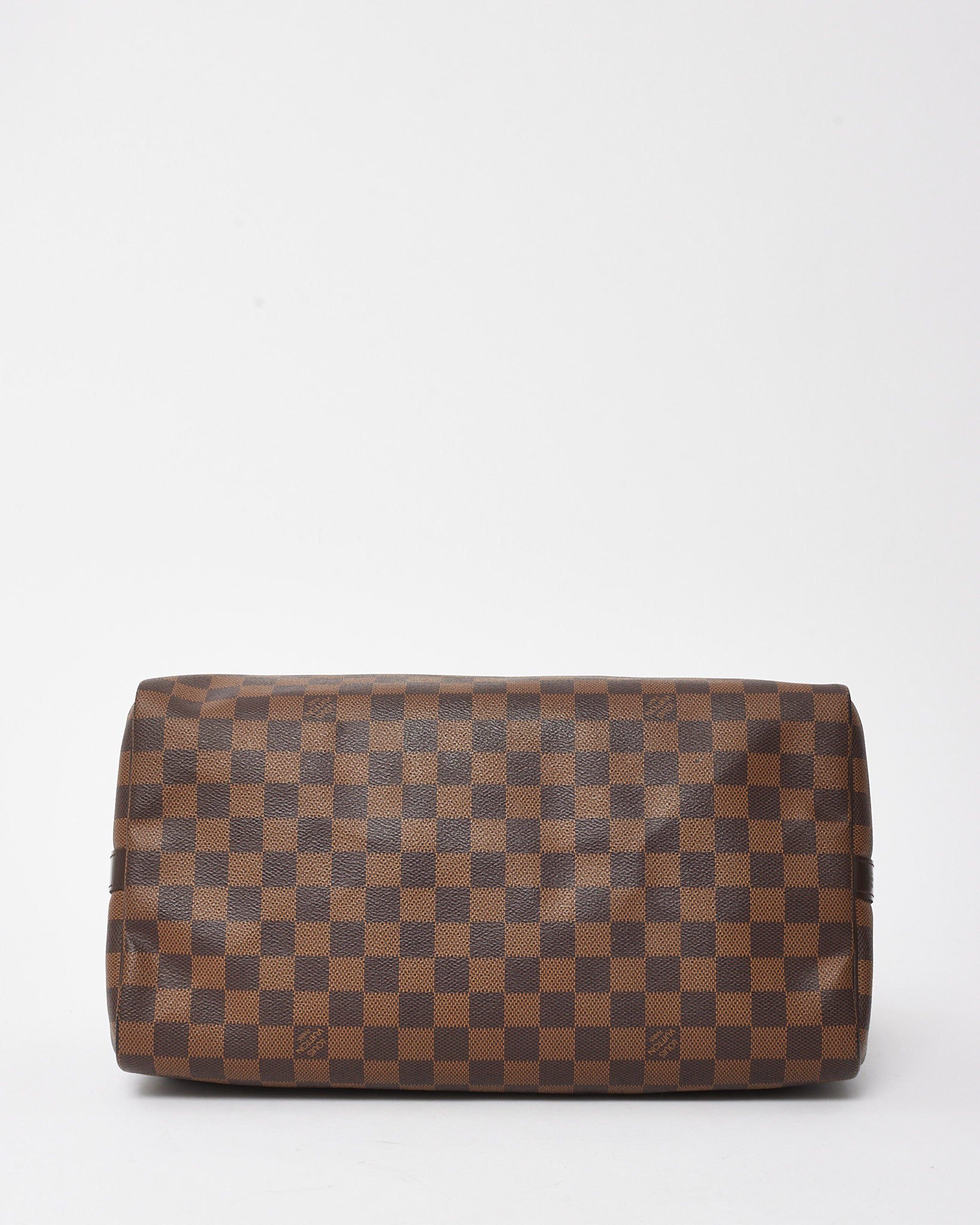 Elevate your everyday with this pre-loved authentic Louis Vuitton Speedy Bandoulière 35, crafted in durable Damier Ebene coated canvas. The classic silhouette is updated with a removable and adjustable strap for crossbody or shoulder carry, while the dual top handles maintain timeless appeal. Finished with chocolate brown leather trim and gleaming gold-tone hardware, this spacious city bag is ideal for both travel and daily use.