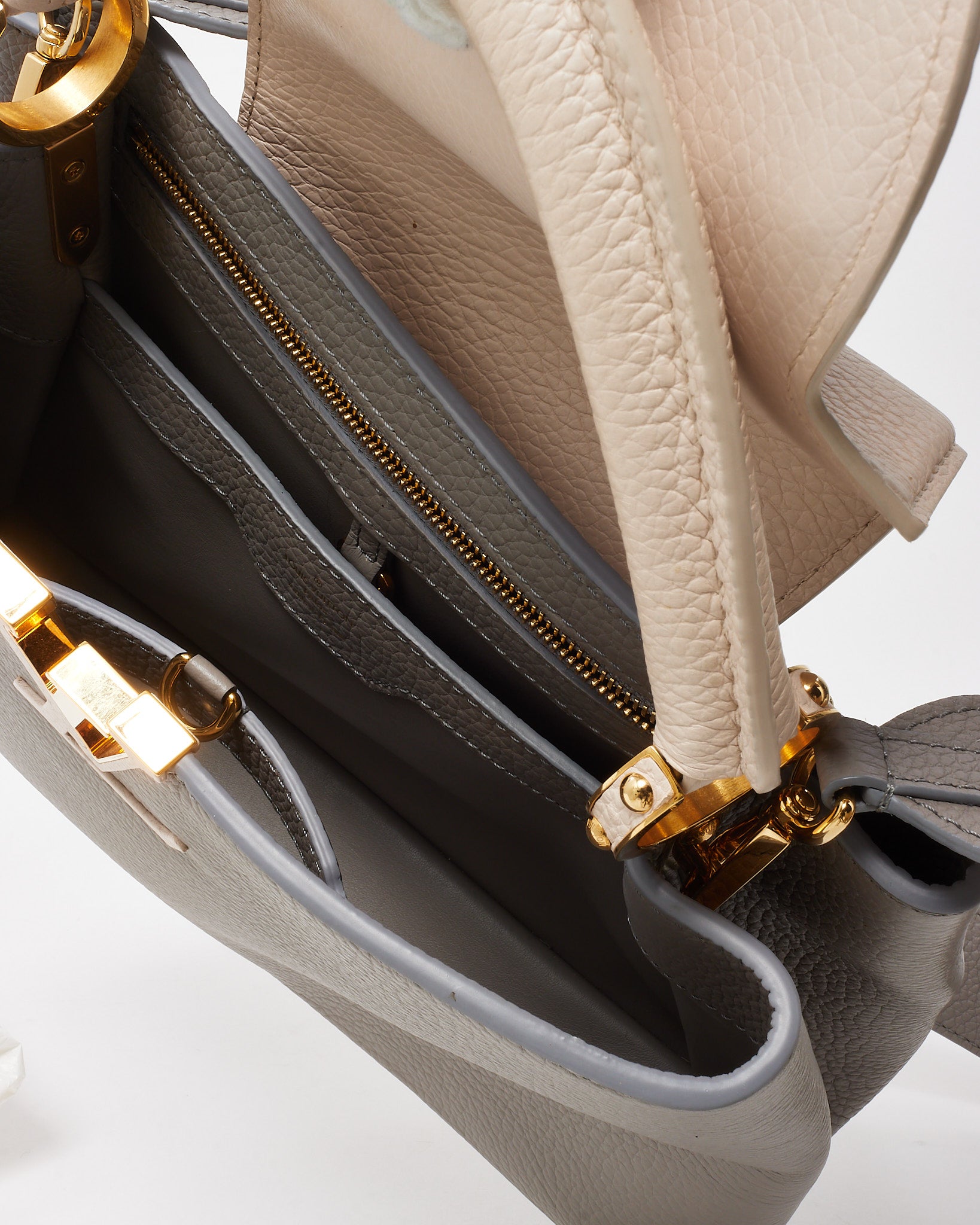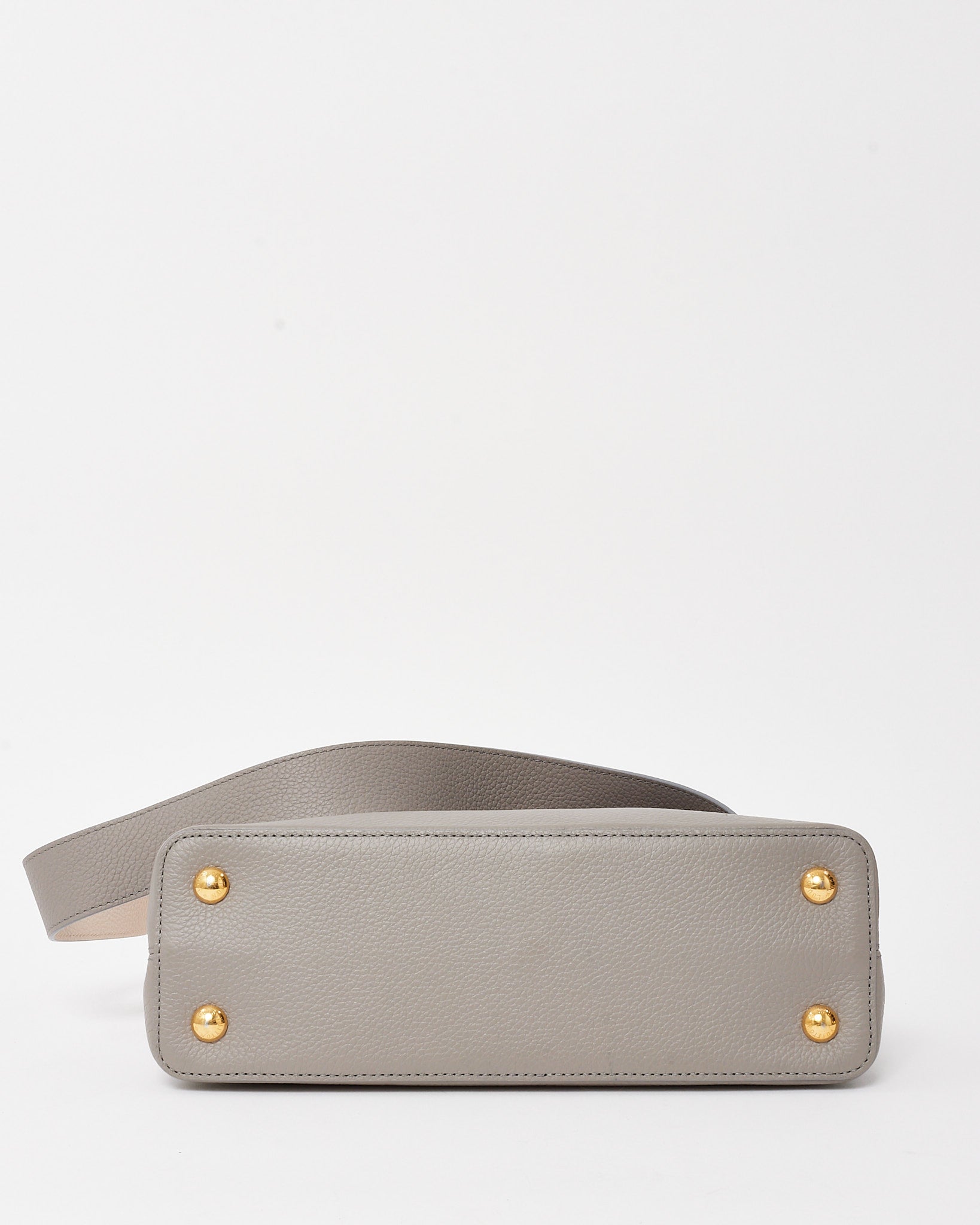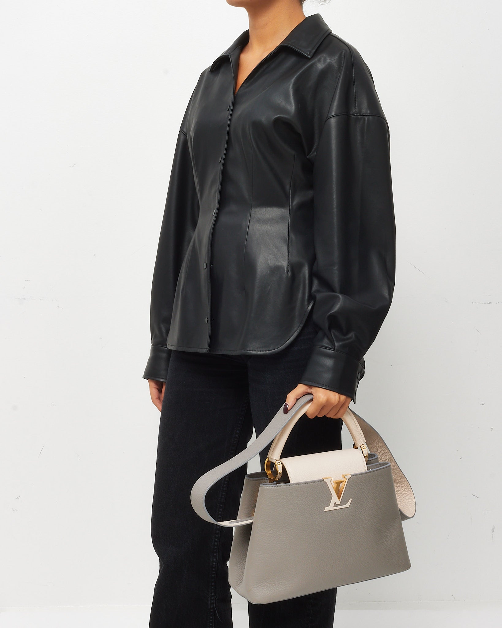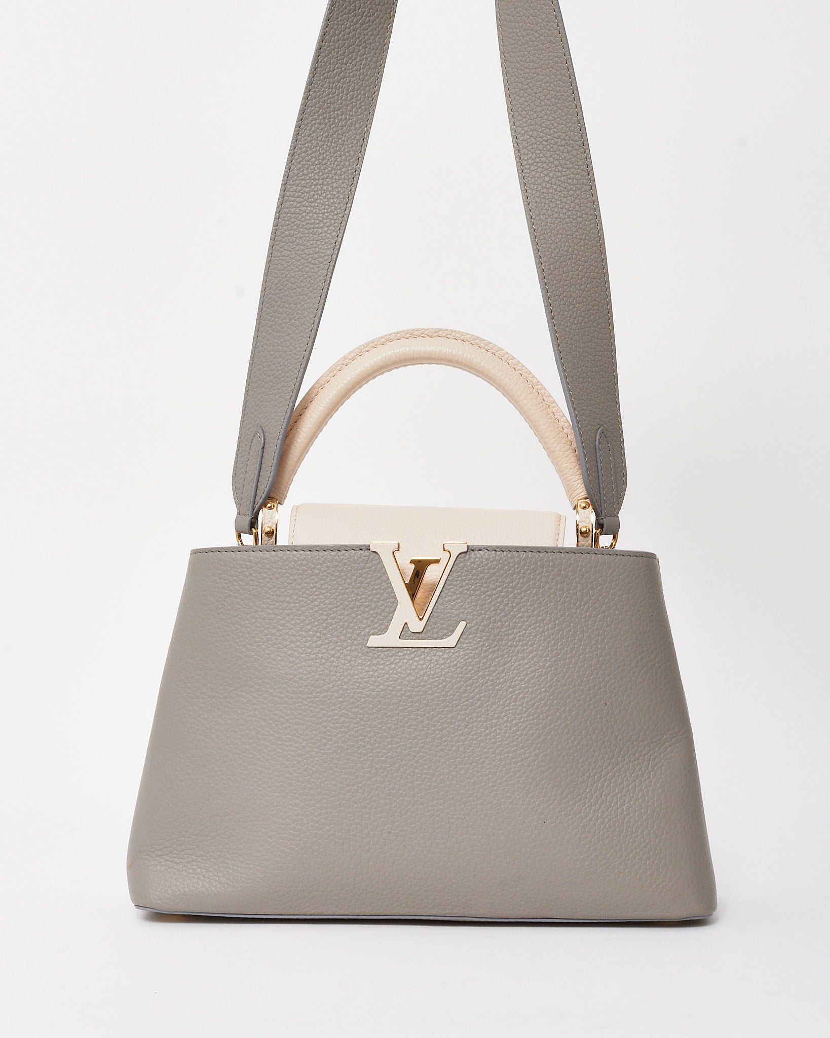 A modern icon with refined contrast, this pre-loved authentic Louis Vuitton Capucines MM bag is rendered in supple grey Taurillon leather with striking white accents for a timeless, elevated aesthetic. Detailed with the signature LV initials and a structured silhouette, it features a convertible flap that can be styled over or under the logo. The top handle and optional shoulder strap offer versatile wear, while the spacious interior with a central divider ensures everyday functionality. A statement piece that blends classic sophistication with contemporary edge.