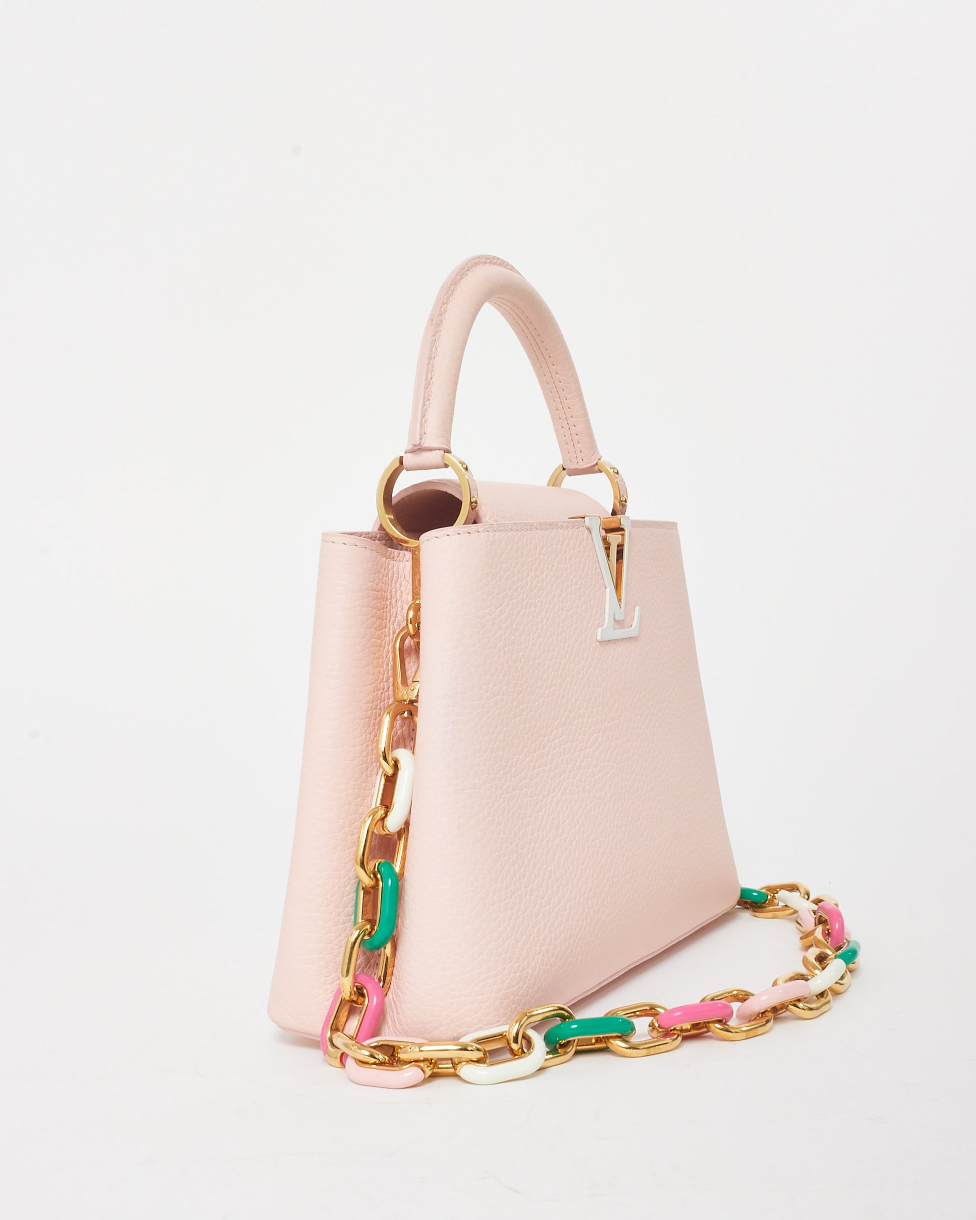 Refined and timeless, the authentic pre-owned Louis Vuitton Light Pink Grained Leather Capucines BB Bag is a sophisticated accessory that exudes elegance. Crafted from luxurious grained leather in a delicate light pink hue, this bag features a structured silhouette that is both chic and versatile.