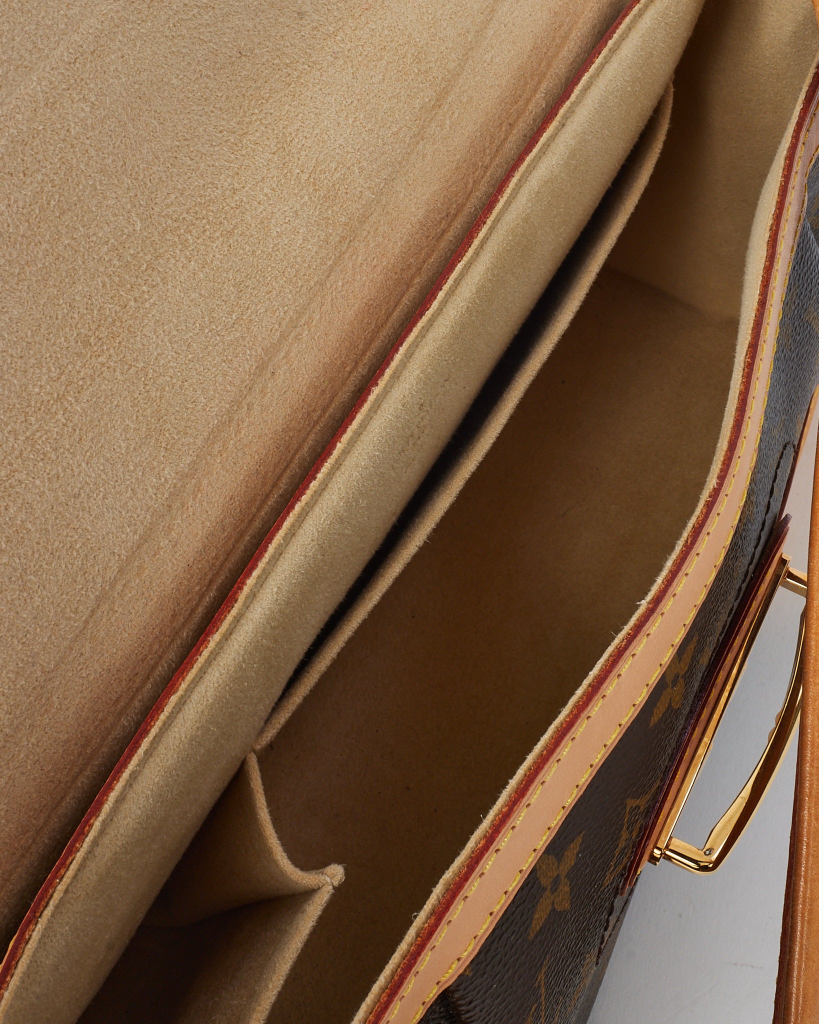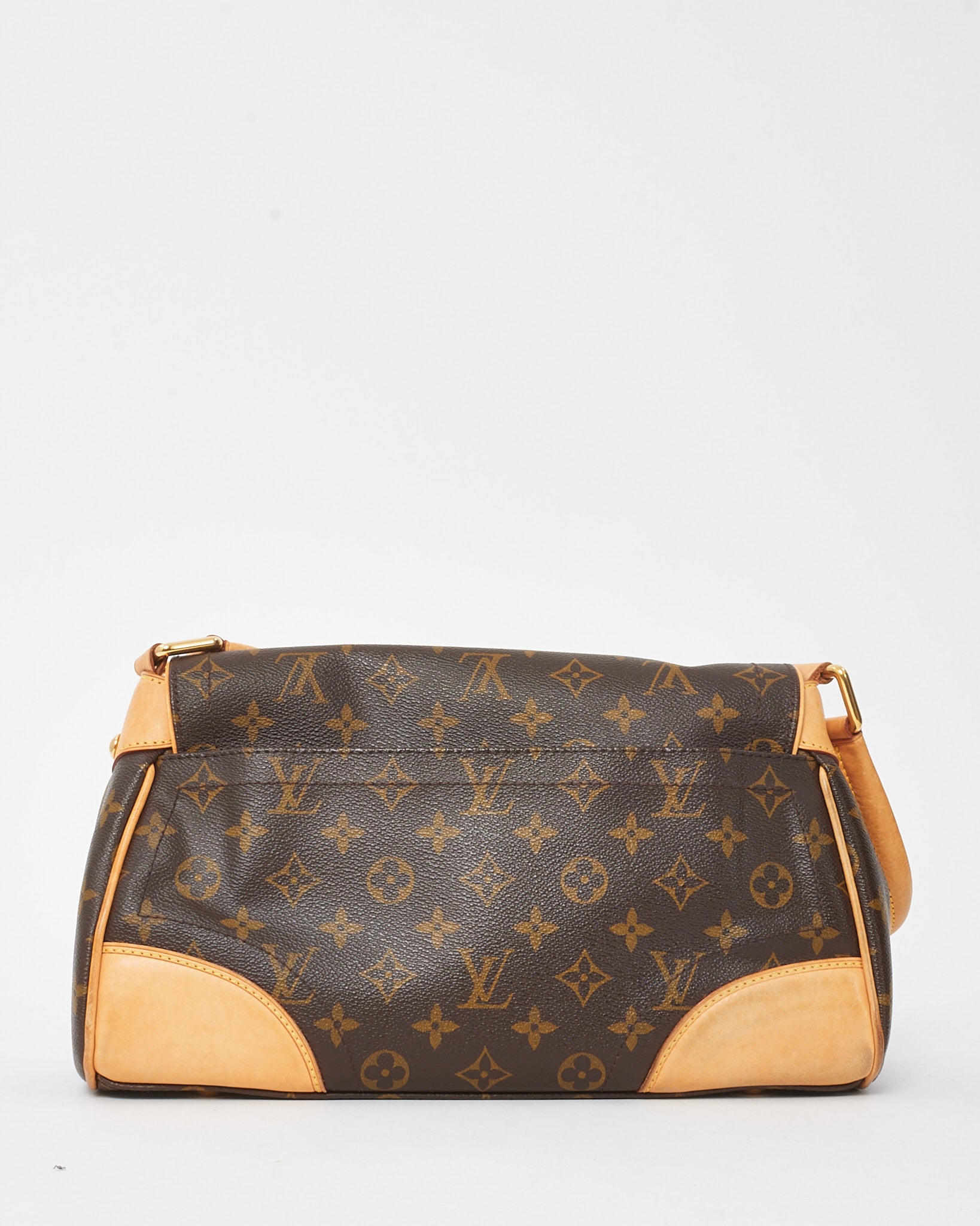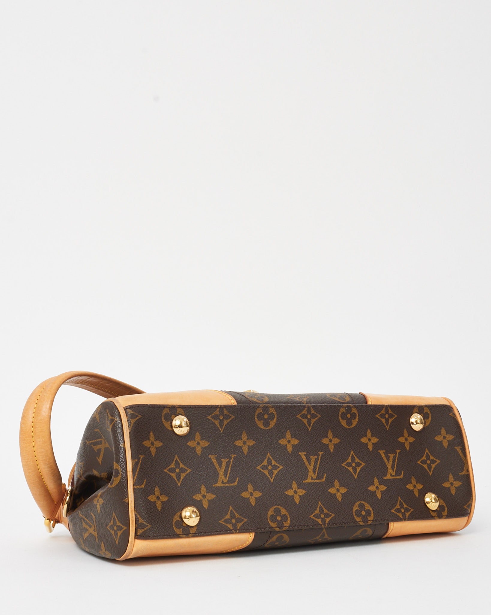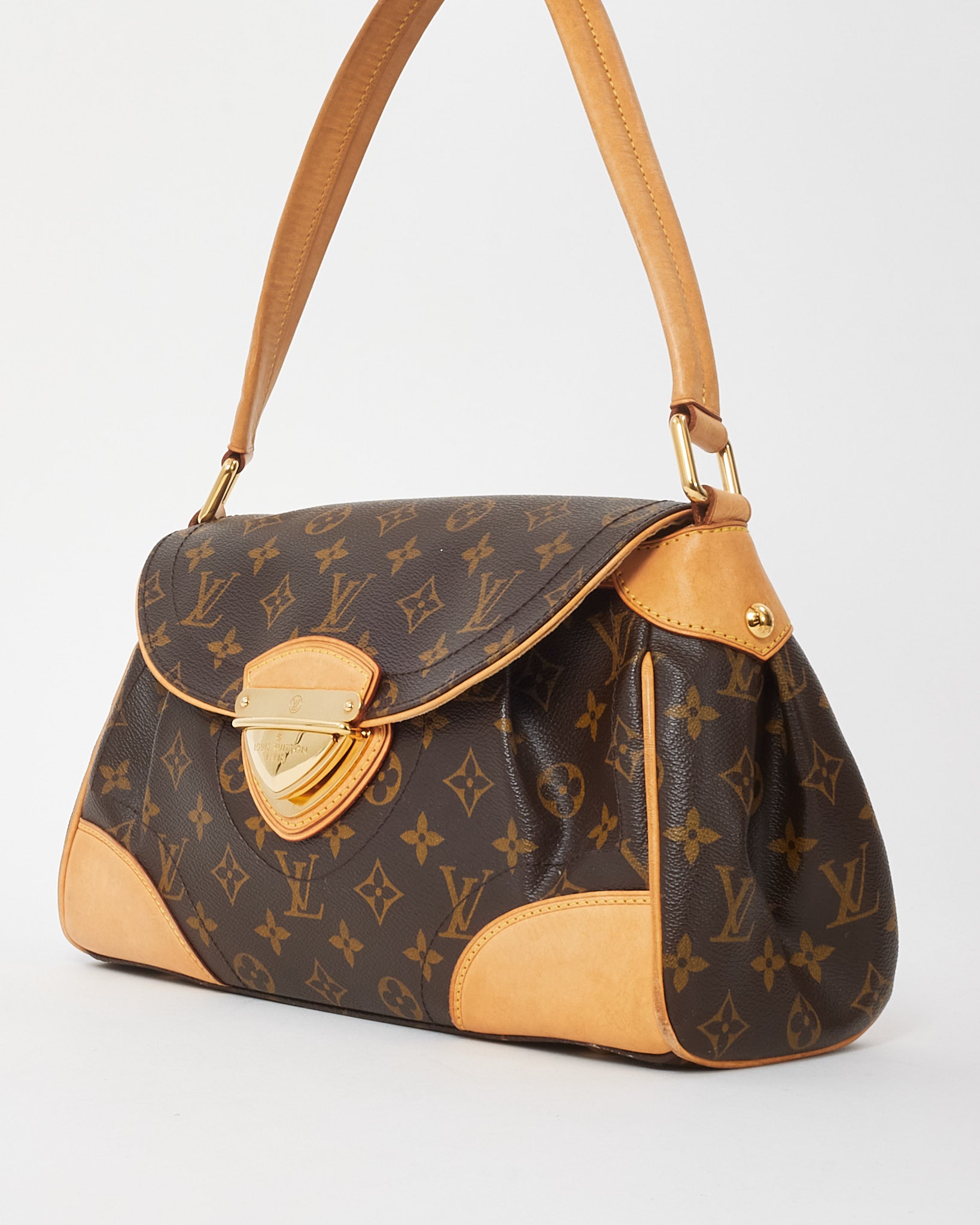 Elegant and structured, this pre-owned authentic Louis Vuitton Beverly MM Shoulder Bag is crafted from classic Monogram coated canvas with natural Vachetta leather trim and a distinctive front flap with gold-tone push-lock closure. The curved silhouette is complemented by rolled leather handles and pleated detailing for a timeless, feminine finish.