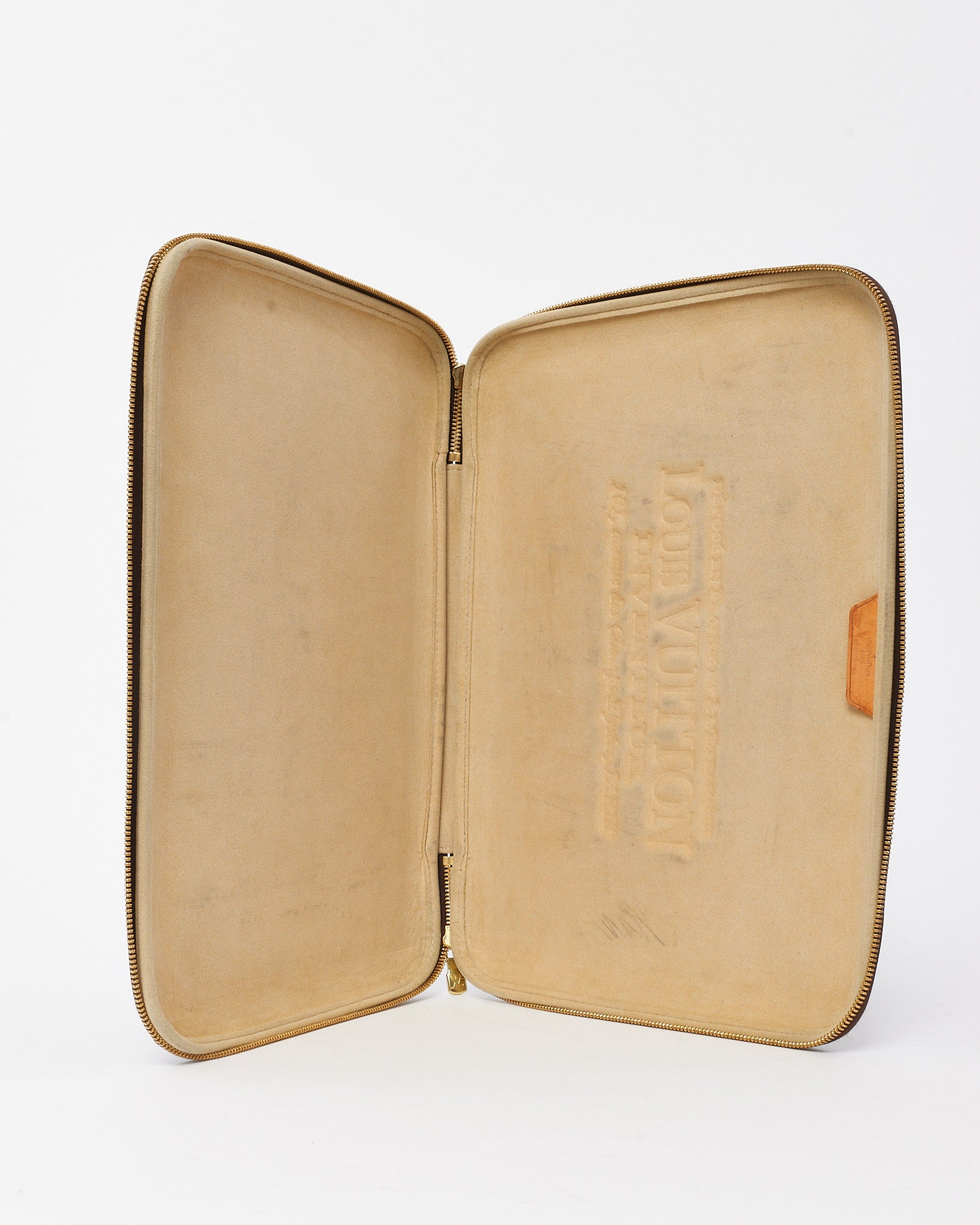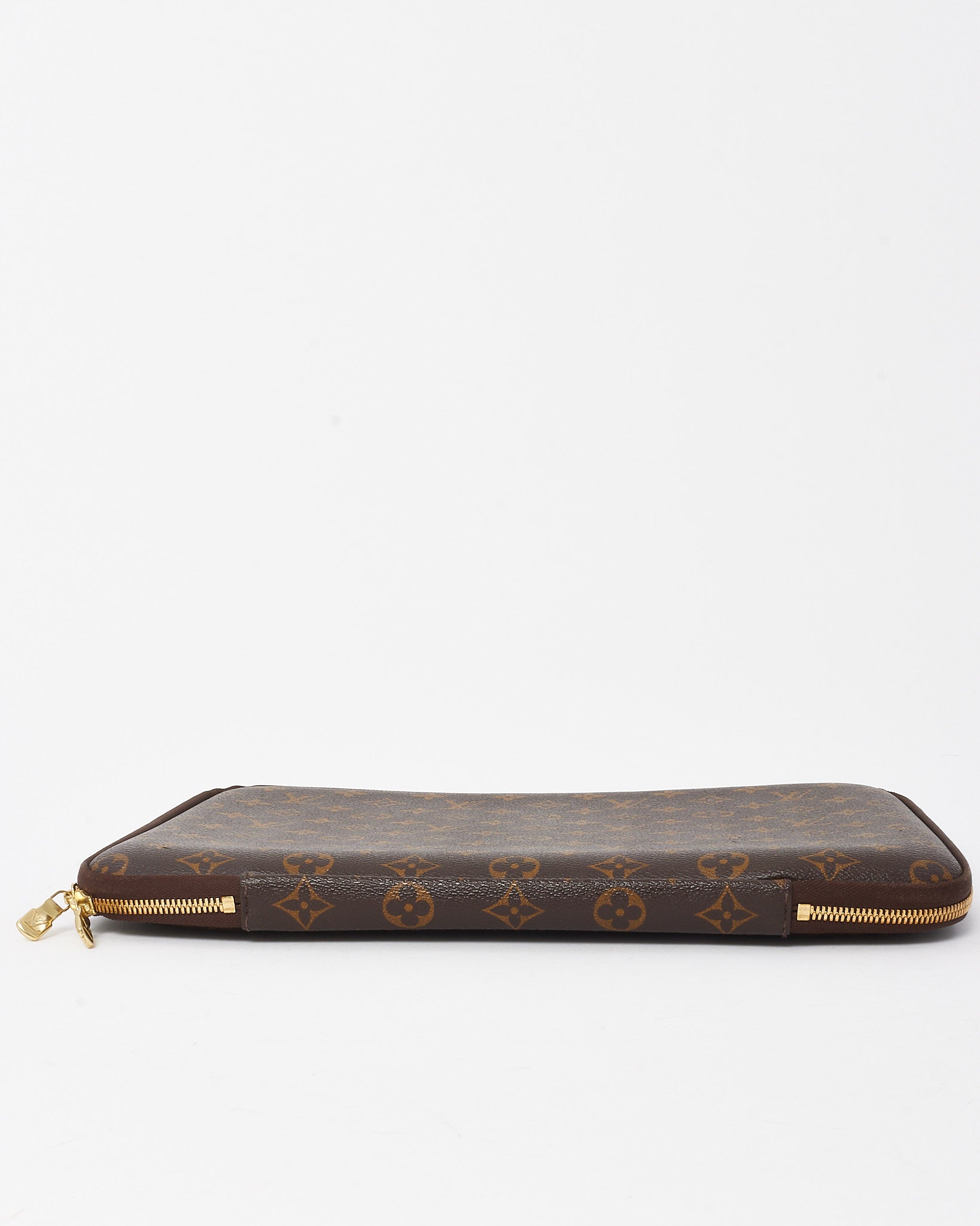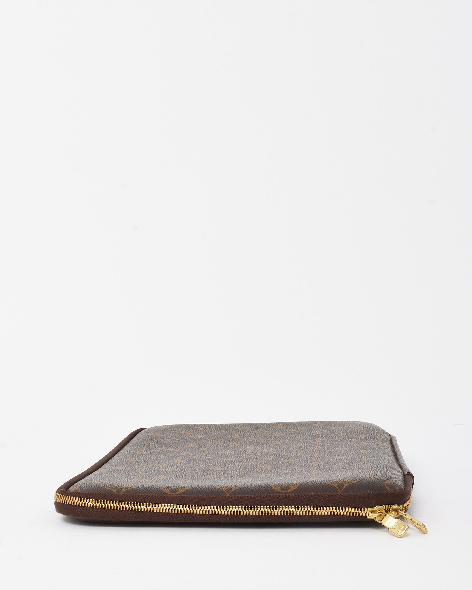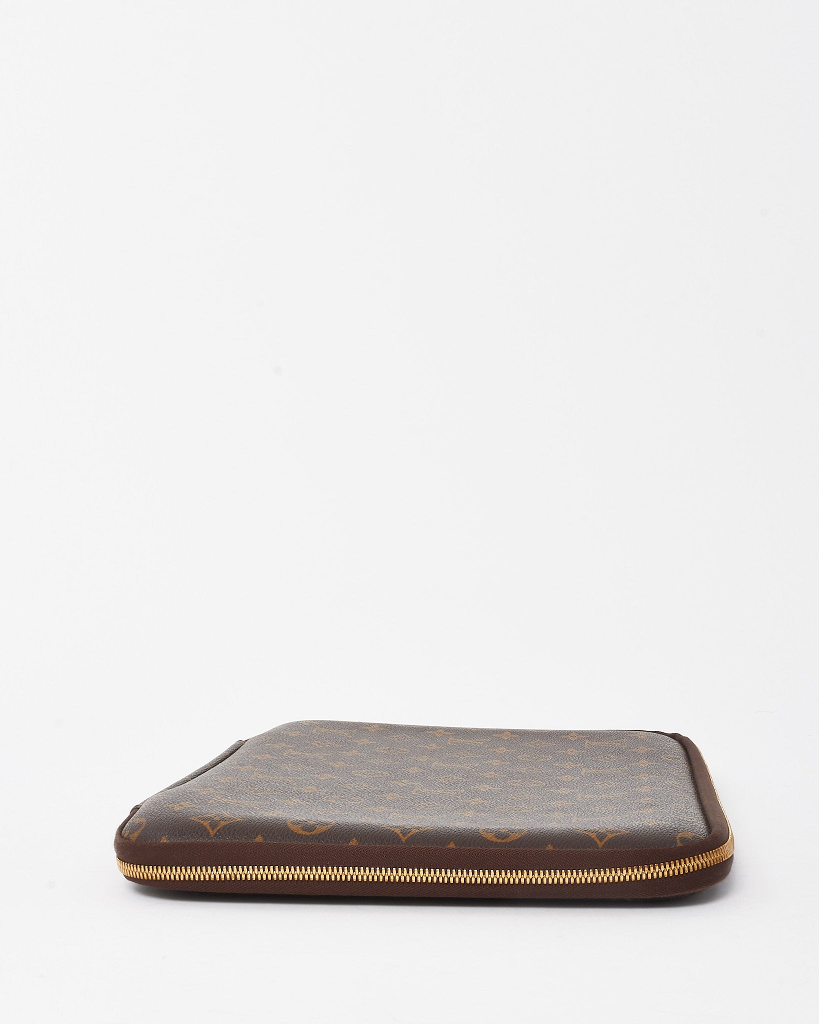 Add refined luxury to your daily essentials with this pre-loved authentic Louis Vuitton Monogram Canvas 13” Laptop Case Pouch. Crafted in the house’s iconic monogram coated canvas, this sleek and protective pouch is designed to hold a 13-inch laptop or tablet with ease. The slim silhouette features a secure gold-tone wrap-around zip closure and a softly padded interior lined in brown textile to safeguard your device. Both practical and stylish, this piece is perfect for the modern professional or traveler who values classic Louis Vuitton craftsmanship in their tech accessories.