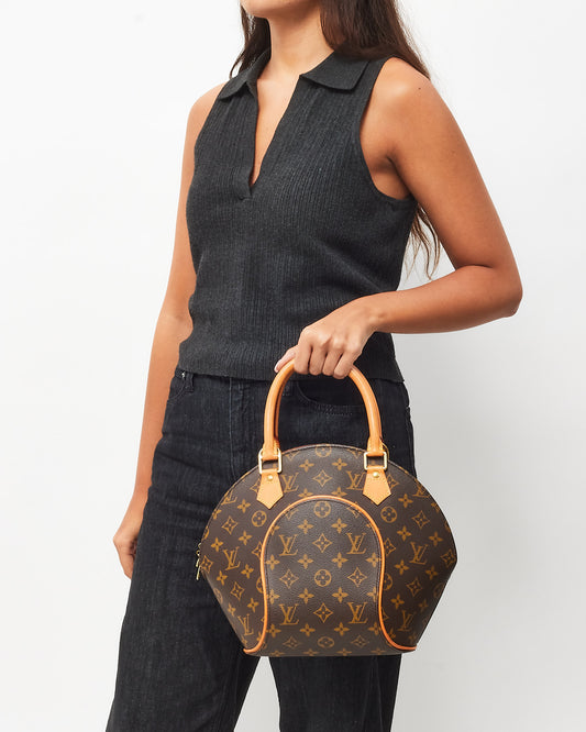 A standout in shape and style, this pre-owned authentic Louis Vuitton Ellipse PM Bag showcases the house’s signature Monogram coated canvas in a distinct, structured silhouette. Trimmed in natural Vachetta leather with gold-tone hardware, it features dual top handles and a spacious interior—perfect for polished everyday wear.