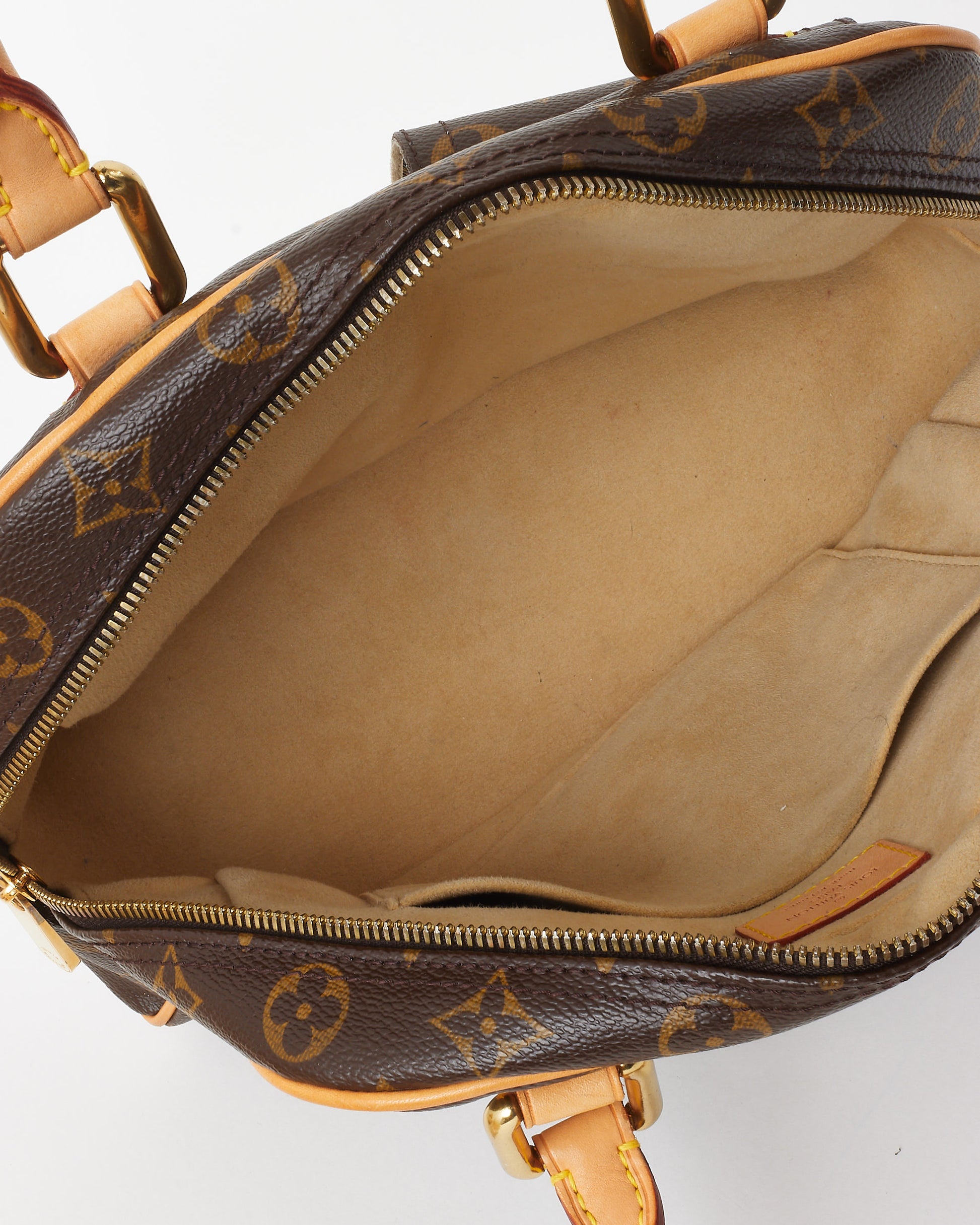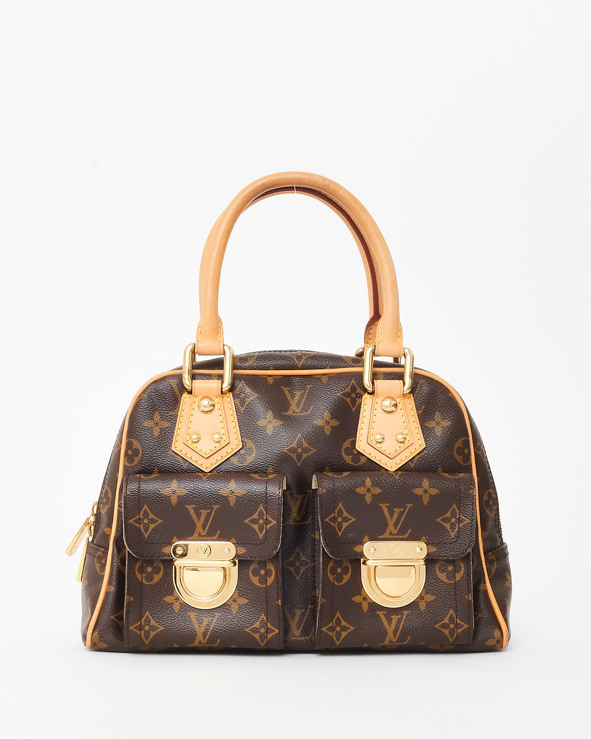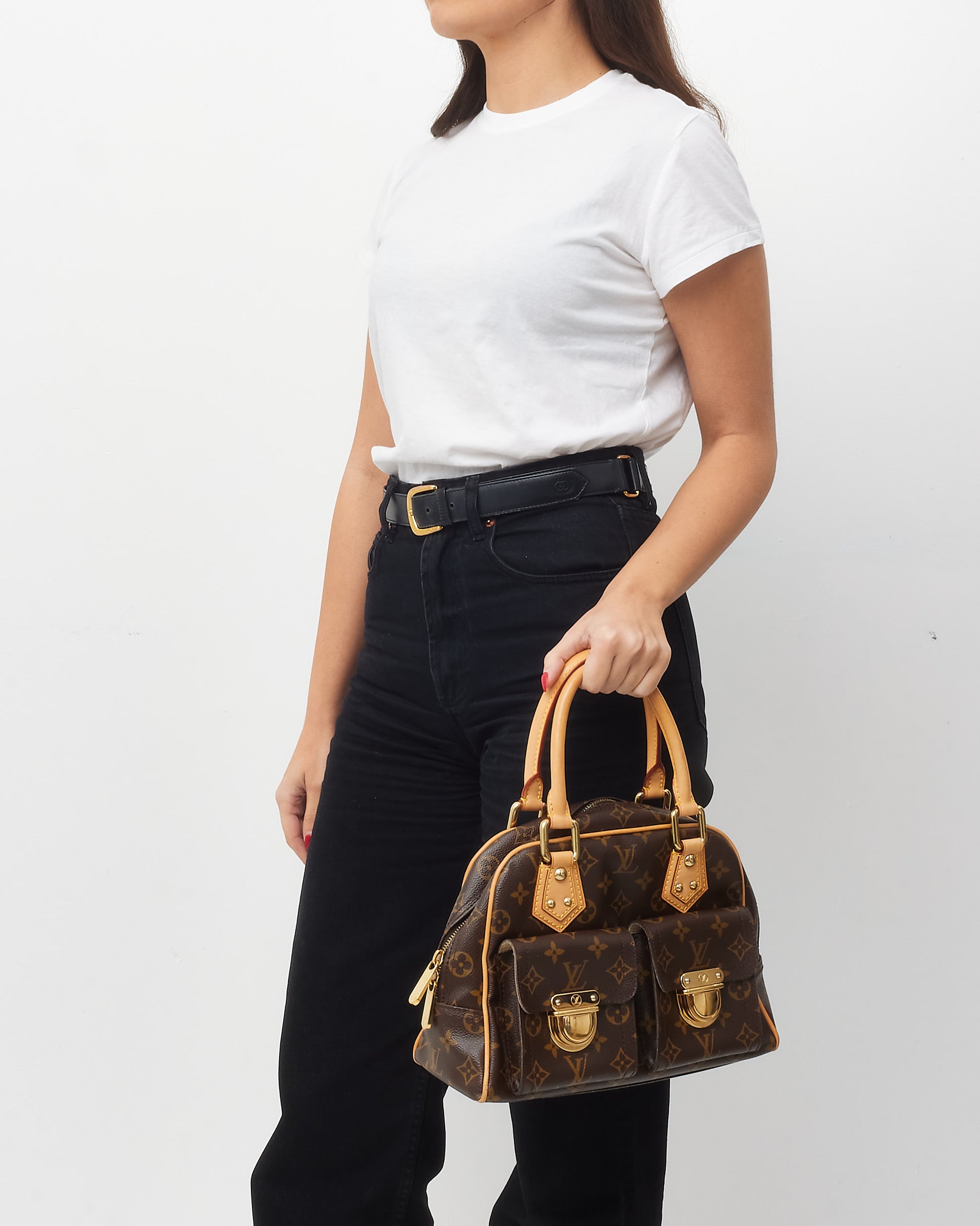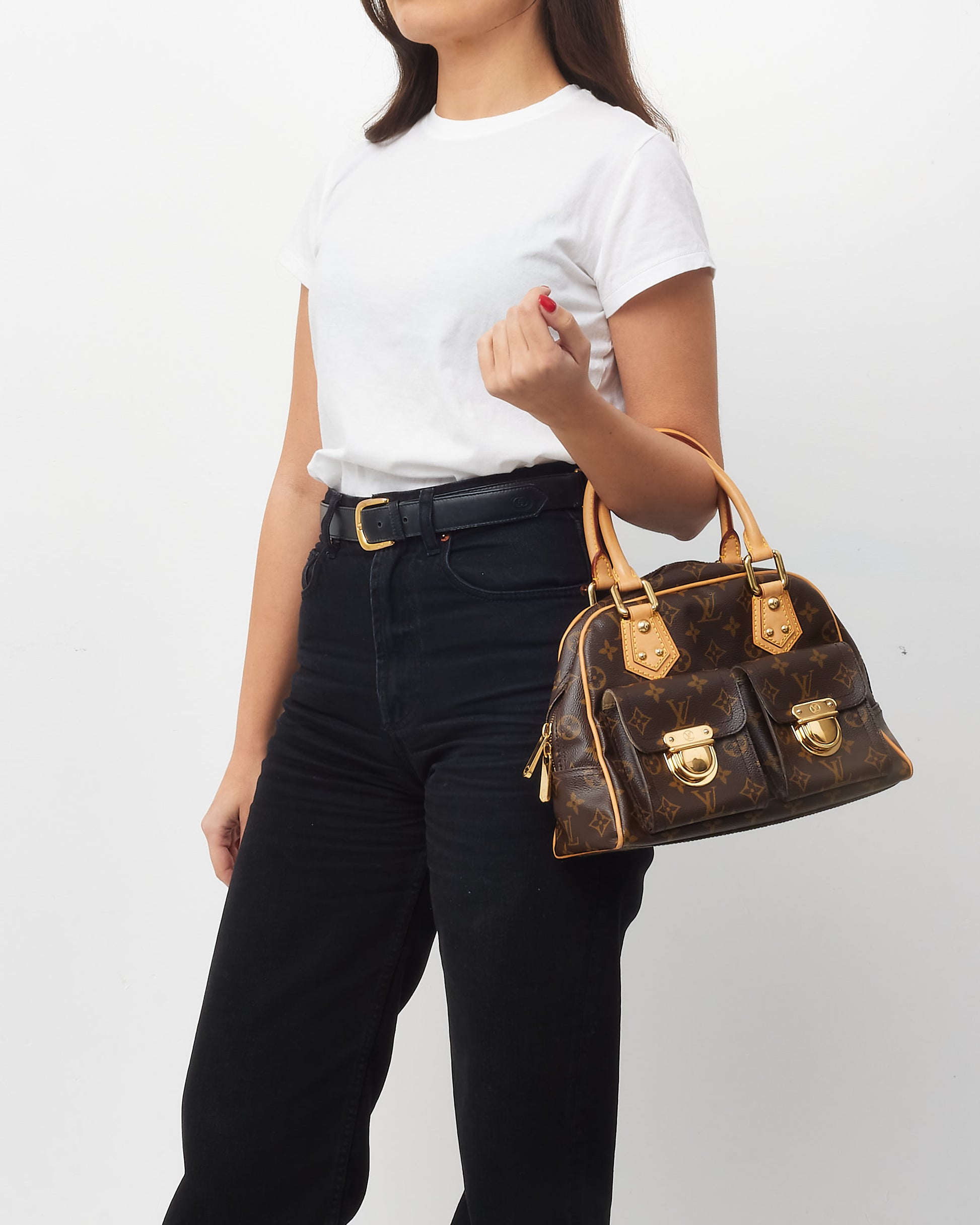 A sophisticated and structured take on a classic, the pre-owned authentic Louis Vuitton Monogram Coated Canvas Manhattan PM Bag is a timeless piece designed for both style and functionality. Crafted from signature monogram-coated canvas, this bag features natural vachetta leather trim and gold-tone push-lock closures, adding a refined, elegant touch.