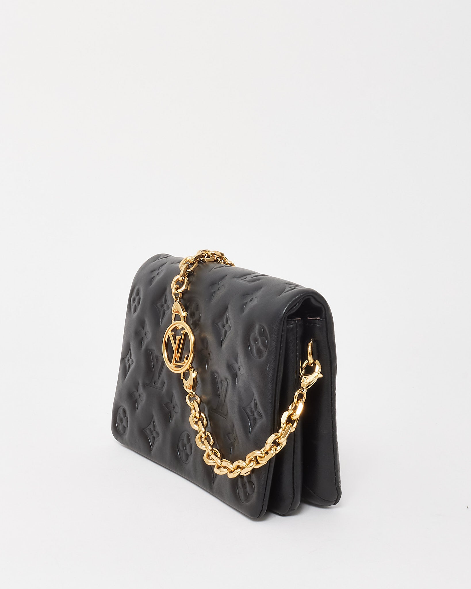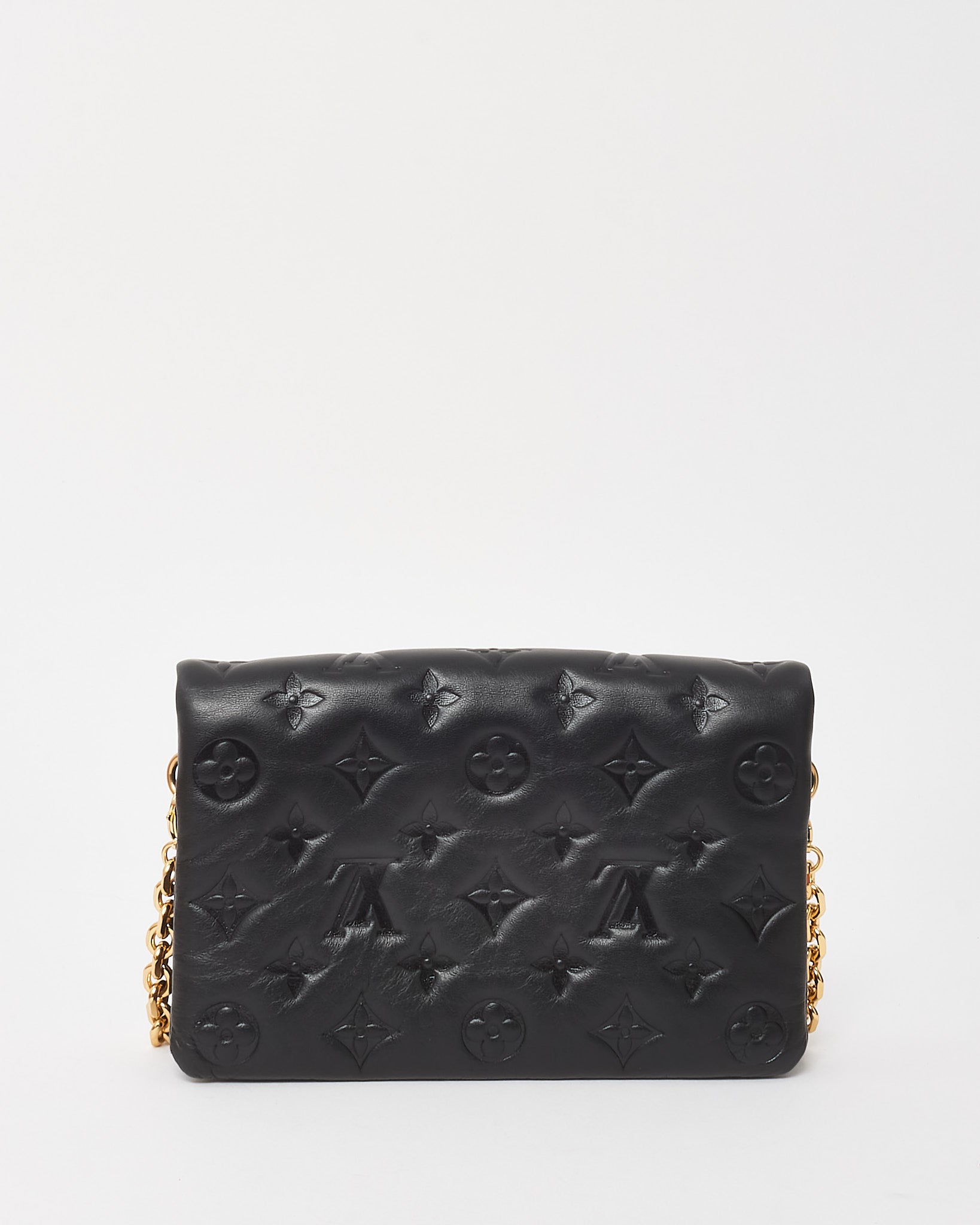 Bold and fashion-forward, this pre-loved authentic Louis Vuitton Pochette Coussin bag is crafted from luxuriously soft lambskin leather embossed with the iconic Monogram motif. The puffy silhouette is both lightweight and structured, offering a modern edge with high-fashion appeal. Designed with a removable chunky chain strap and an adjustable textile crossbody strap, it transitions effortlessly from day to evening wear. The triple-compartment interior adds practical storage, making it as functional as it is stylish—perfect for trendsetters who love elevated versatility.