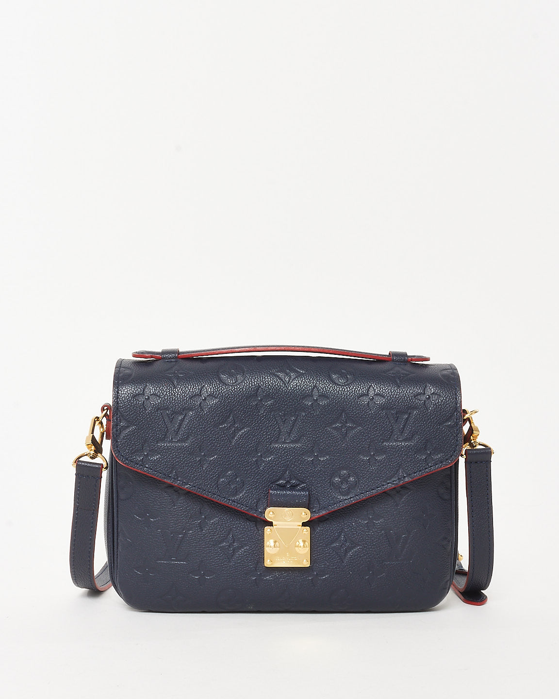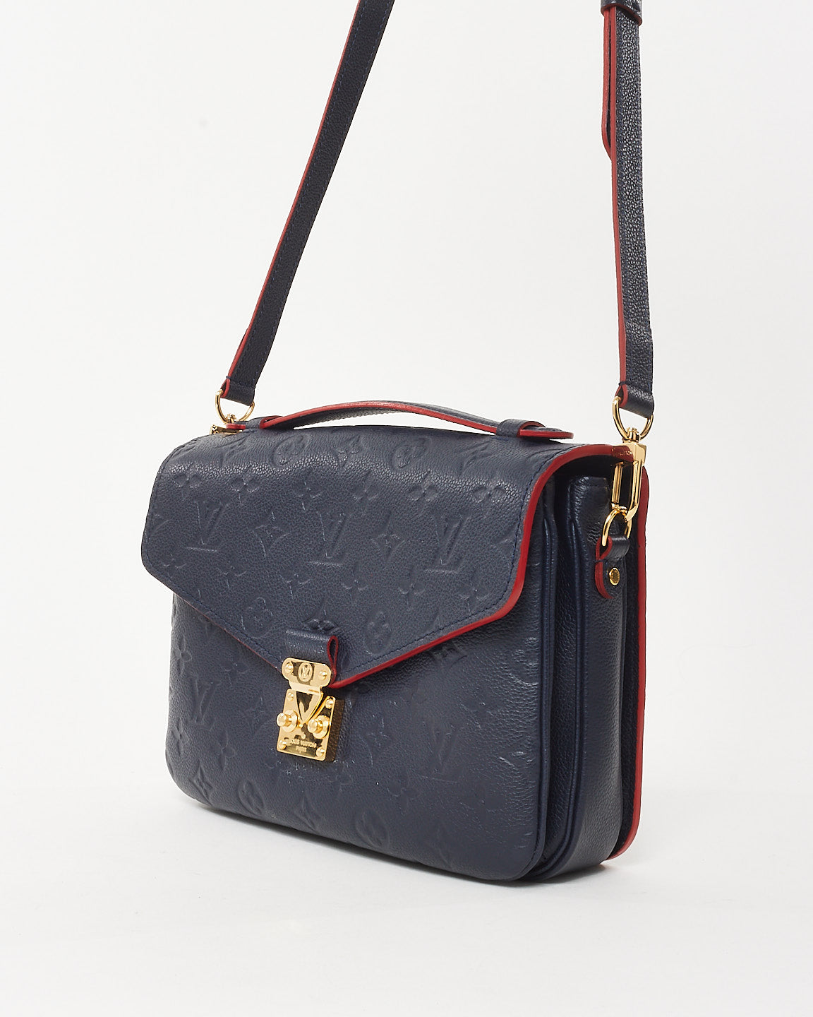 A timeless icon with a bold twist, this pre-owned authentic Louis Vuitton Navy/Red Monogram Empreinte Leather Pochette Métis blends classic structure with elevated edge. Crafted from embossed supple leather in deep navy with striking red trim, this coveted silhouette is both refined and statement-making.