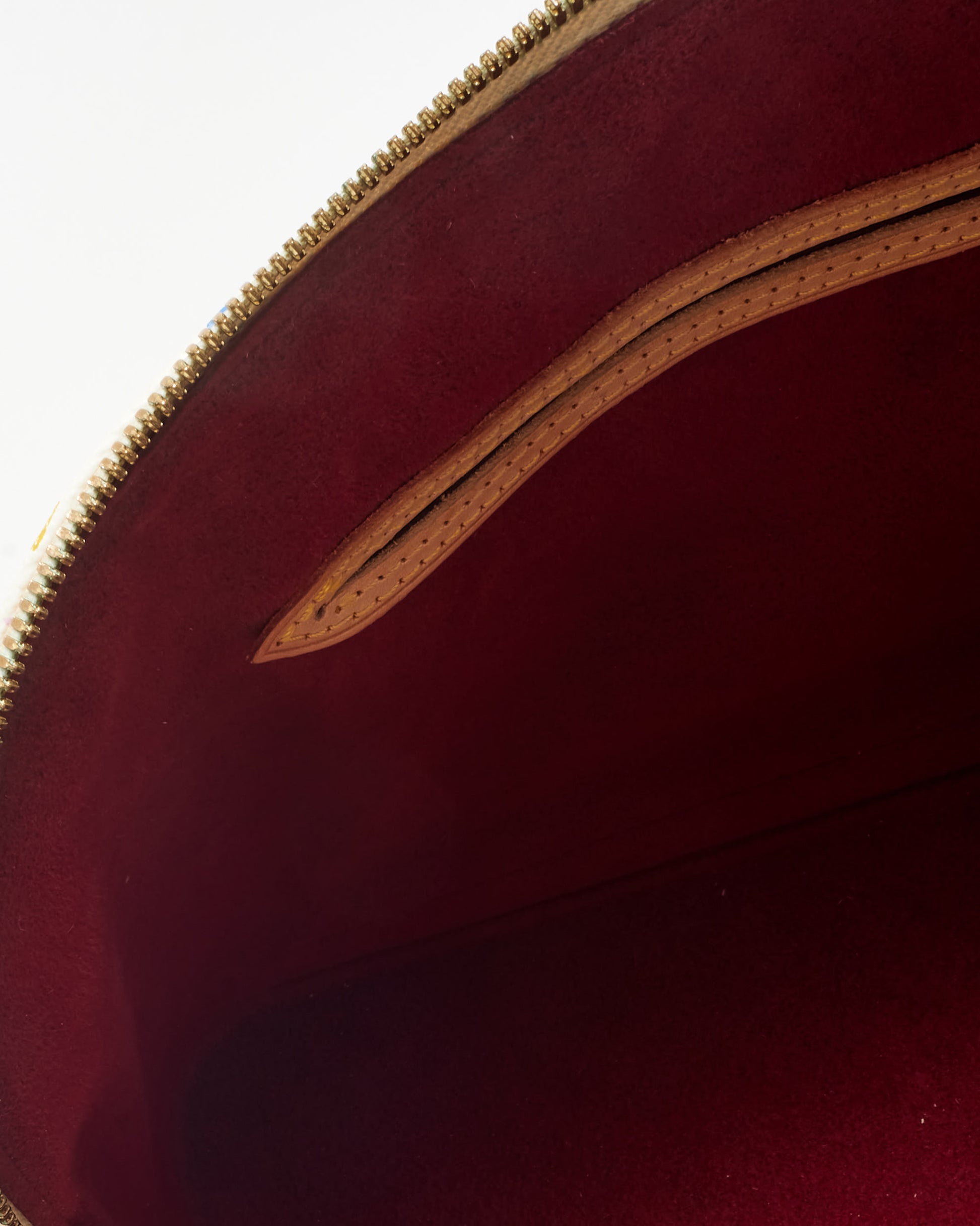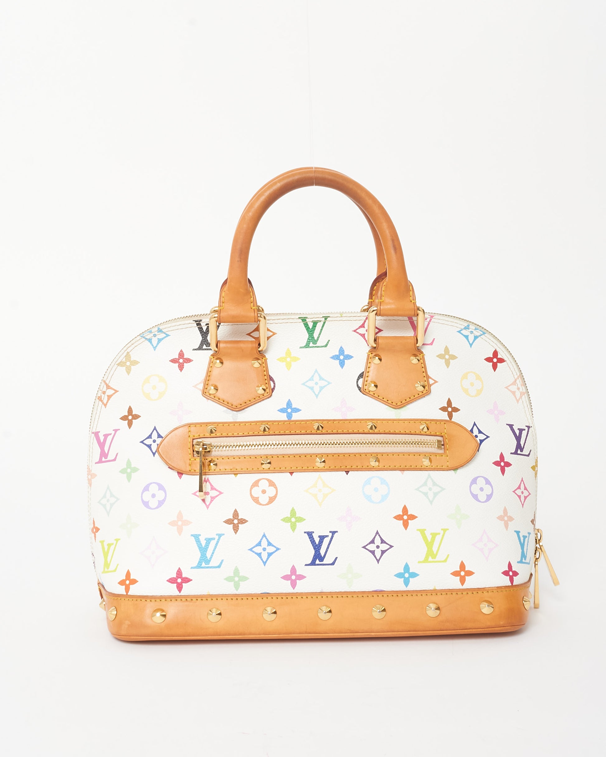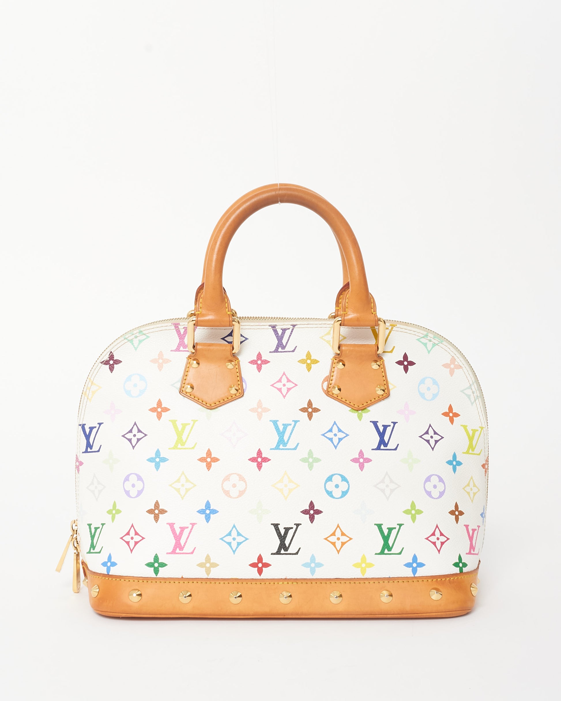 This is an authentic pre-owend Louis Vuitton Alma PM Bag in white Multicolore Monogram canvas is a vibrant and iconic piece designed in collaboration with the renowned artist Takashi Murakami. This limited-edition bag blends Louis Vuitton’s timeless craftsmanship with Murakami’s playful, artistic flair, making it a standout addition to any luxury collection. Multicolore coated canvas featuring a colorful array of LV monograms designed by Takashi Murakami. Natural Vachetta leather trim, including the handles and base, which develops a rich patina over time. Bright white base with multicolored monogram prints and gold-tone hardware for a luxurious finish. Structured, dome-shaped silhouette inspired by the original Alma bag, introduced in the 1930s. Features studded leather accents and a double-zip closure with LV-embossed gold-tone padlock. Rolled leather top handles for a comfortable hand-carry option. Lined in soft microfiber. Features a slip pocket for small essentials and a spacious compartment for everyday items. Dual top zippers with a lockable feature for added security. Shop pre-owned authentic Louis Vuitton bags at Retyche.