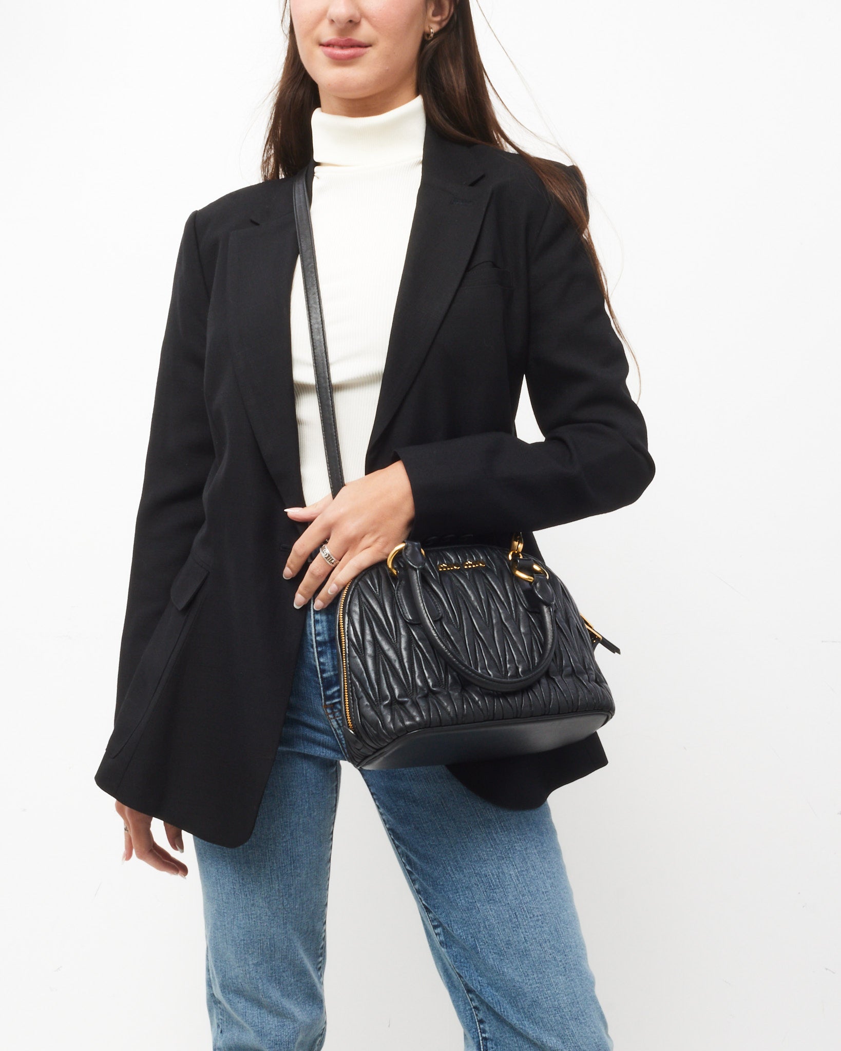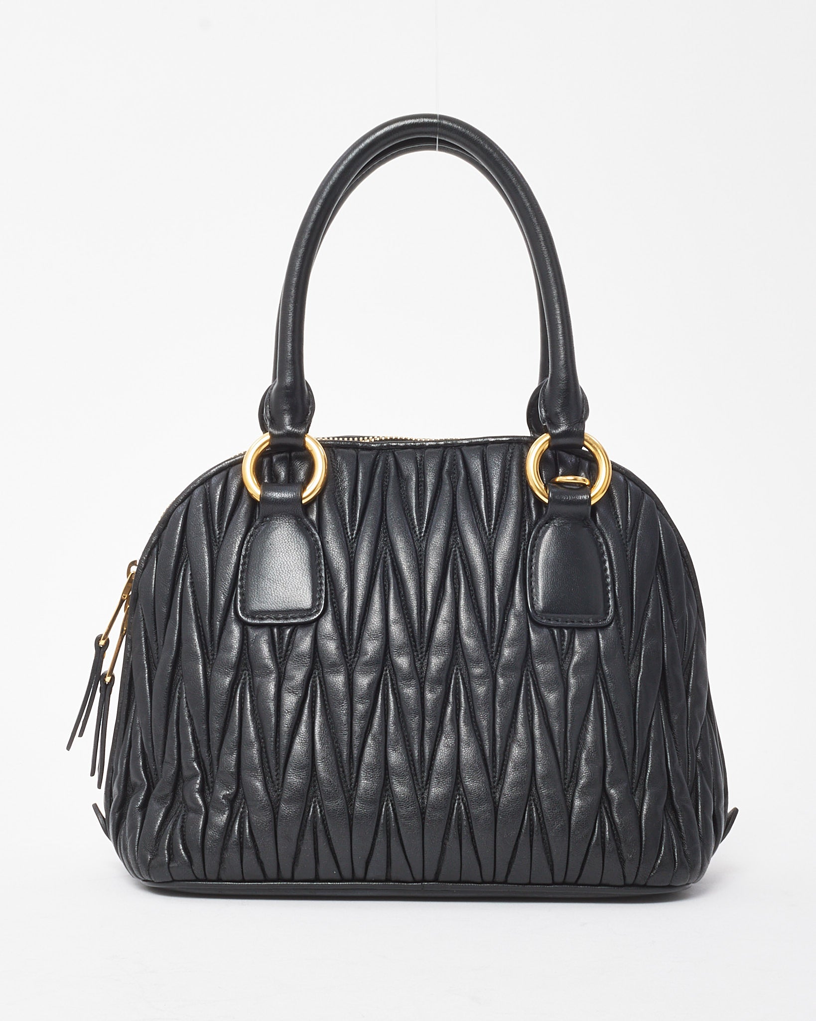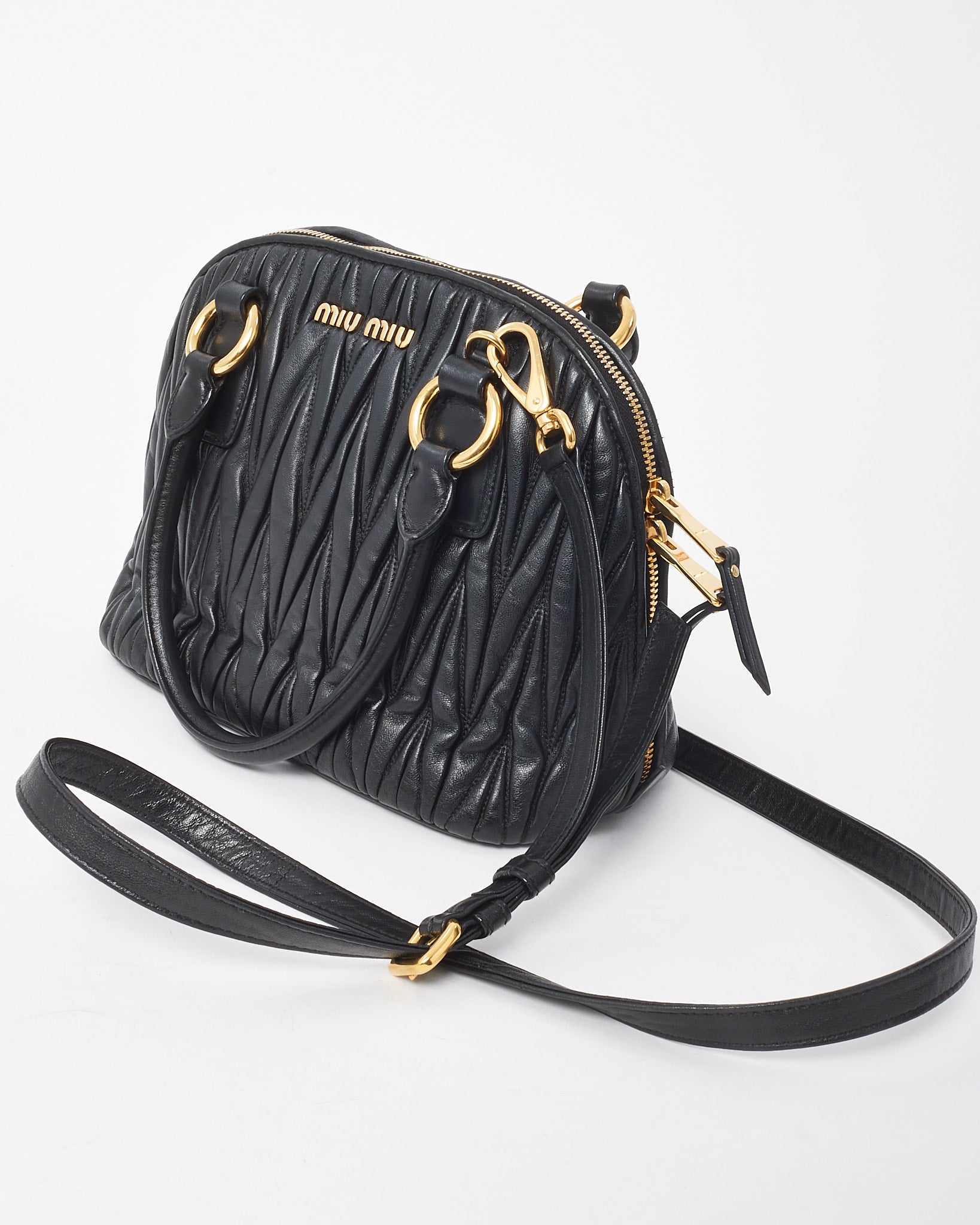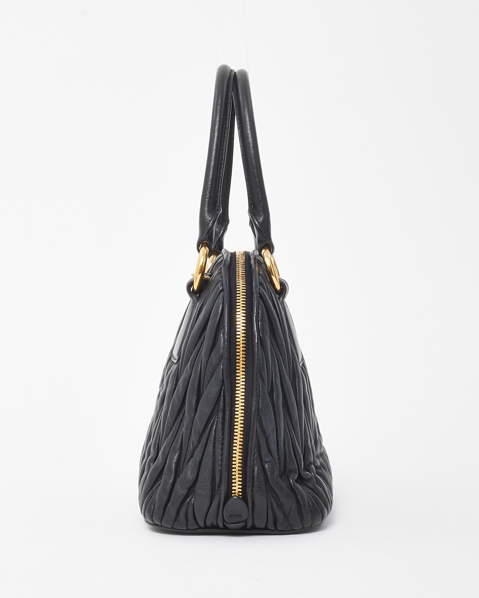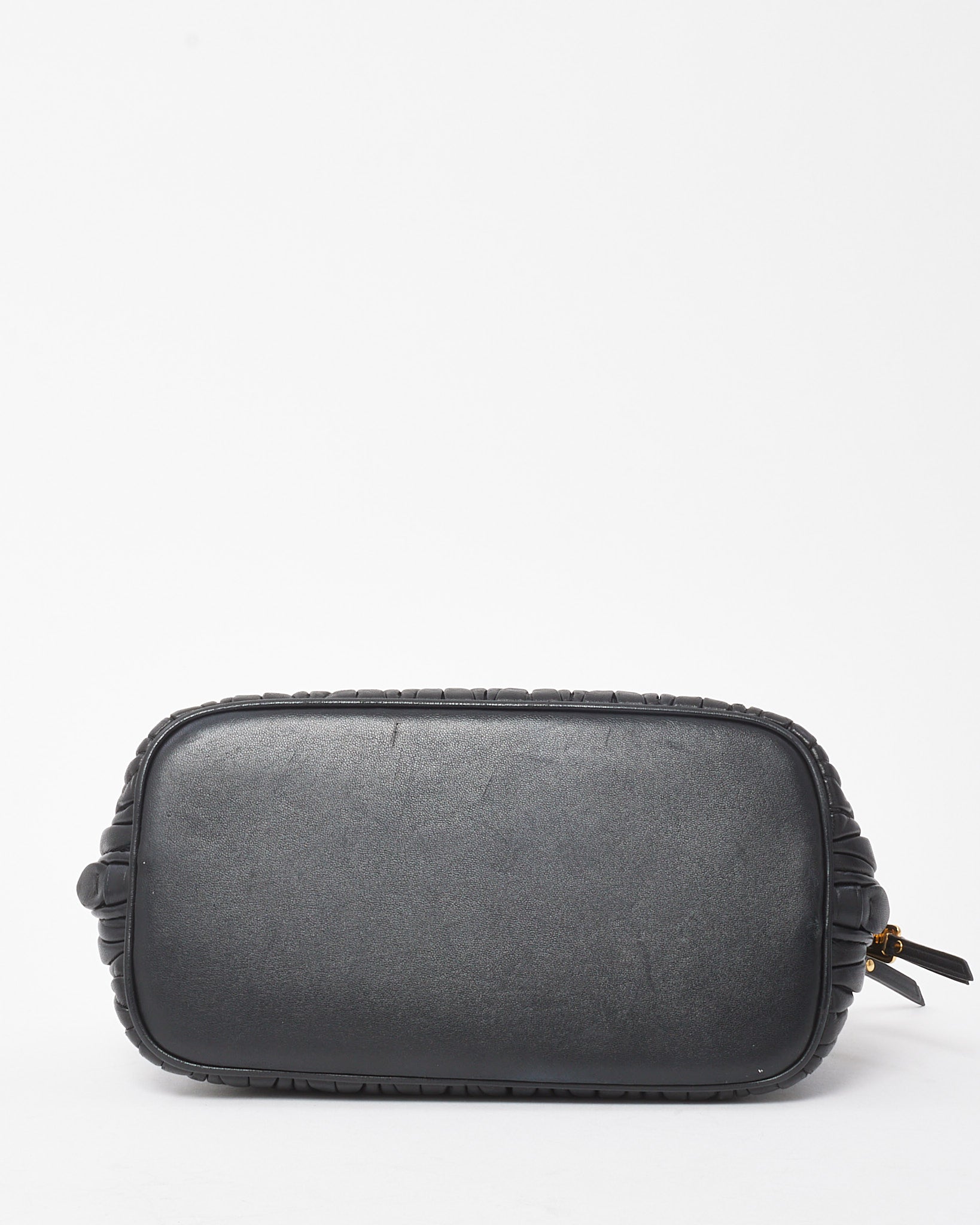 Add elegant texture to your collection with this pre-loved authentic Miu Miu Black Gaufre Leather Top Handle Bowler Bag with Strap. Crafted from luxuriously ruched Gaufre leather, this chic silhouette is both compact and structured, offering a refined twist on a classic satchel shape. The top handles and optional shoulder strap provide versatile styling, while gold-tone hardware and discreet logo detailing enhance the polished finish. Ideal for day-to-night transitions, this Miu Miu bag brings together Italian craftsmanship and youthful sophistication in a timeless black hue.