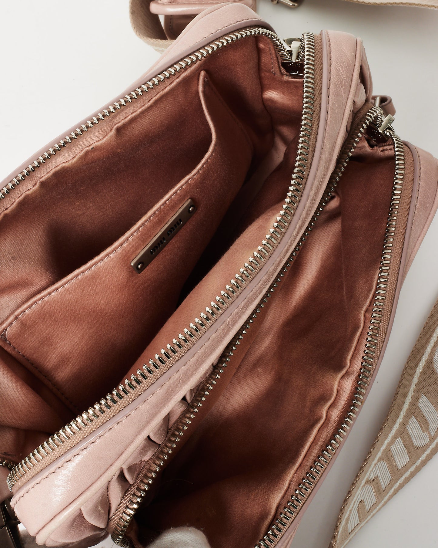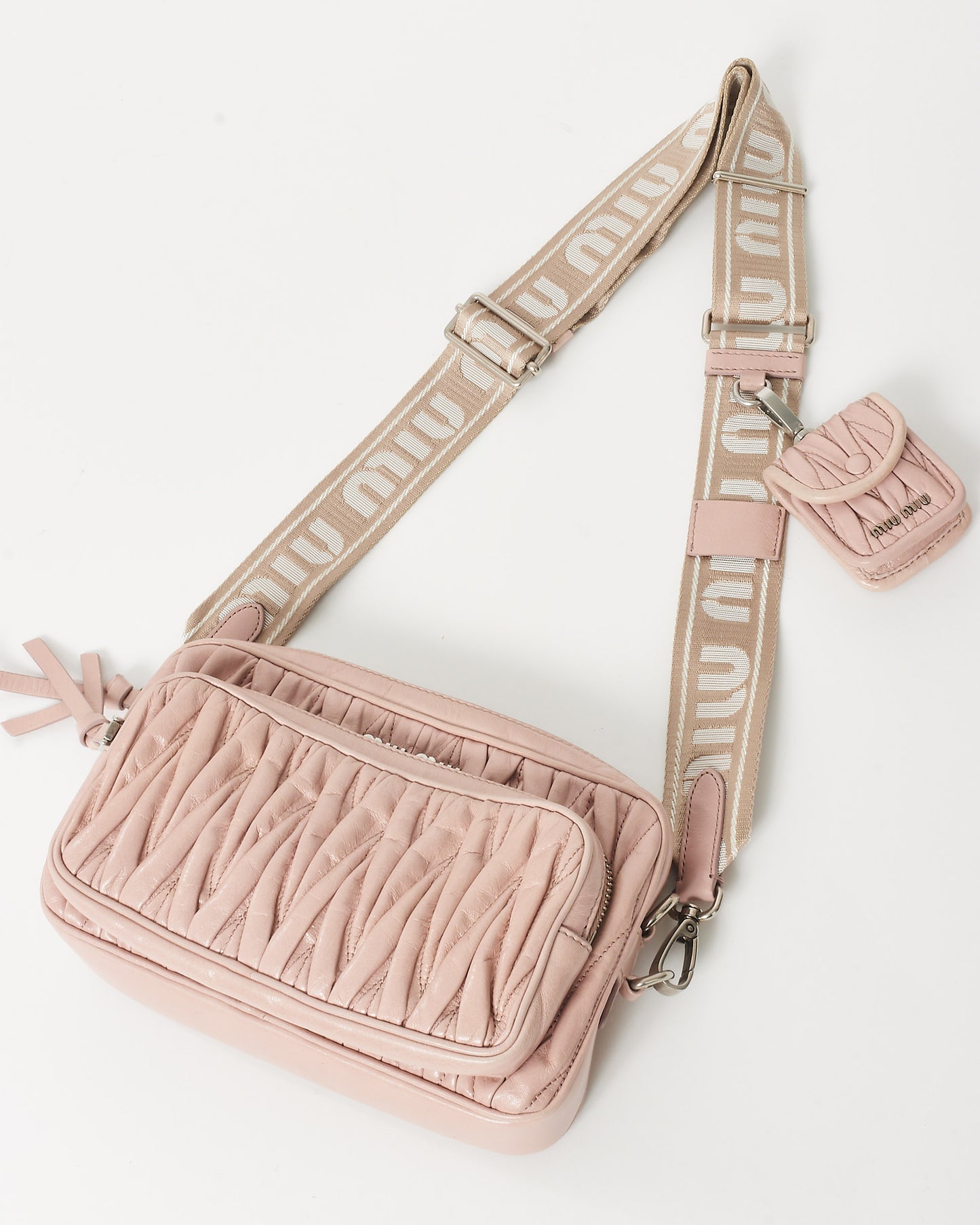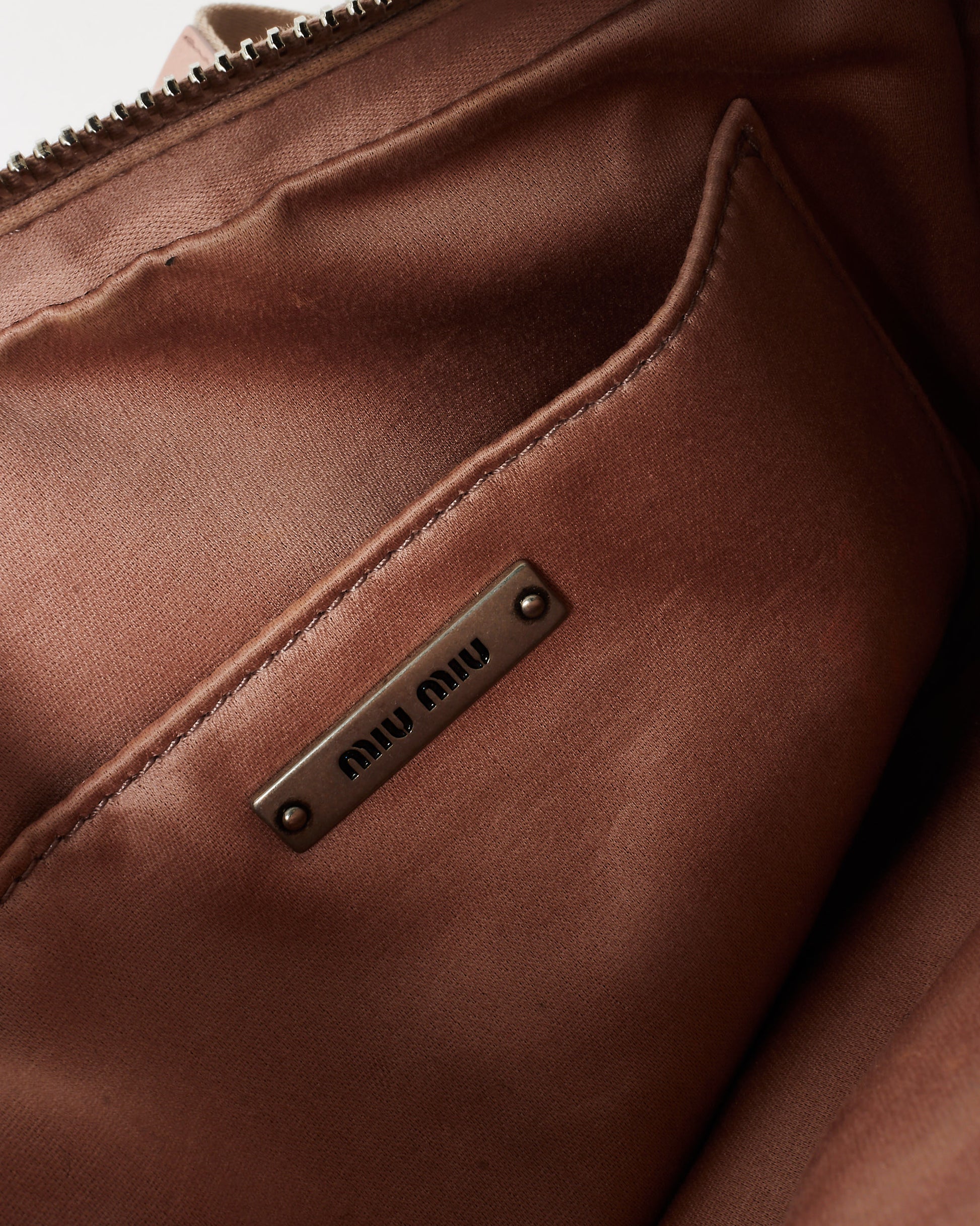 It features a front square zip pocket, a top zip closure, and a detachable, adjustable leather strap for versatile crossbody or shoulder wear. The silver-tone Miu Miu logo adds a touch of glam to the feminine design.