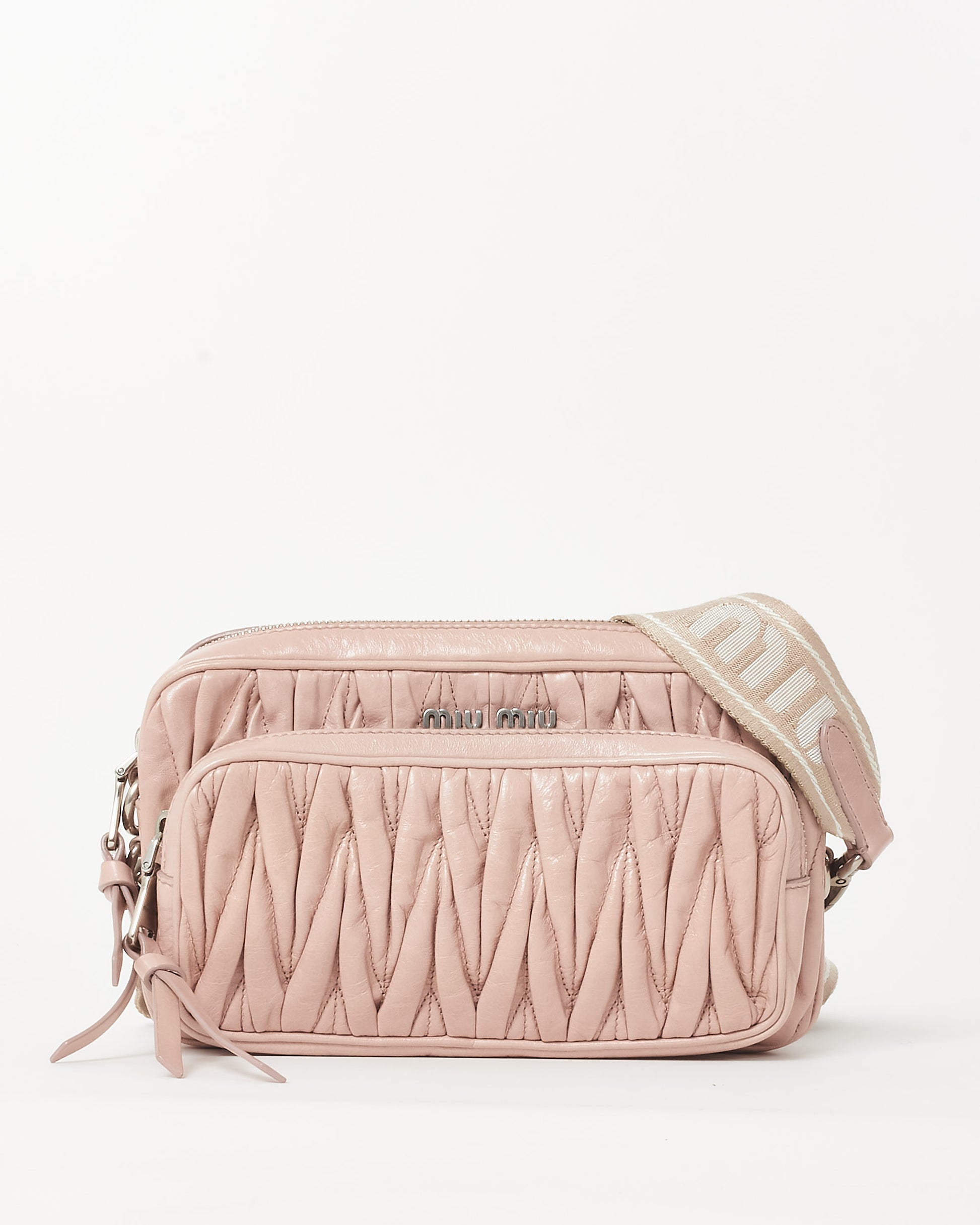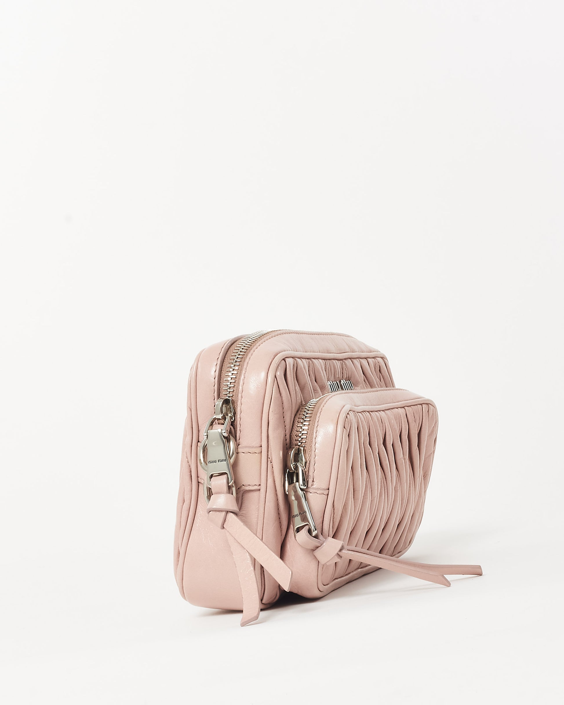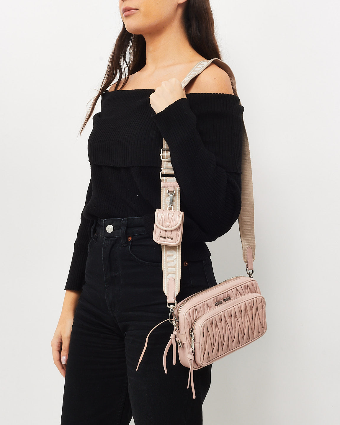 It features a front square zip pocket, a top zip closure, and a detachable, adjustable leather strap for versatile crossbody or shoulder wear. The silver-tone Miu Miu logo adds a touch of glam to the feminine design.