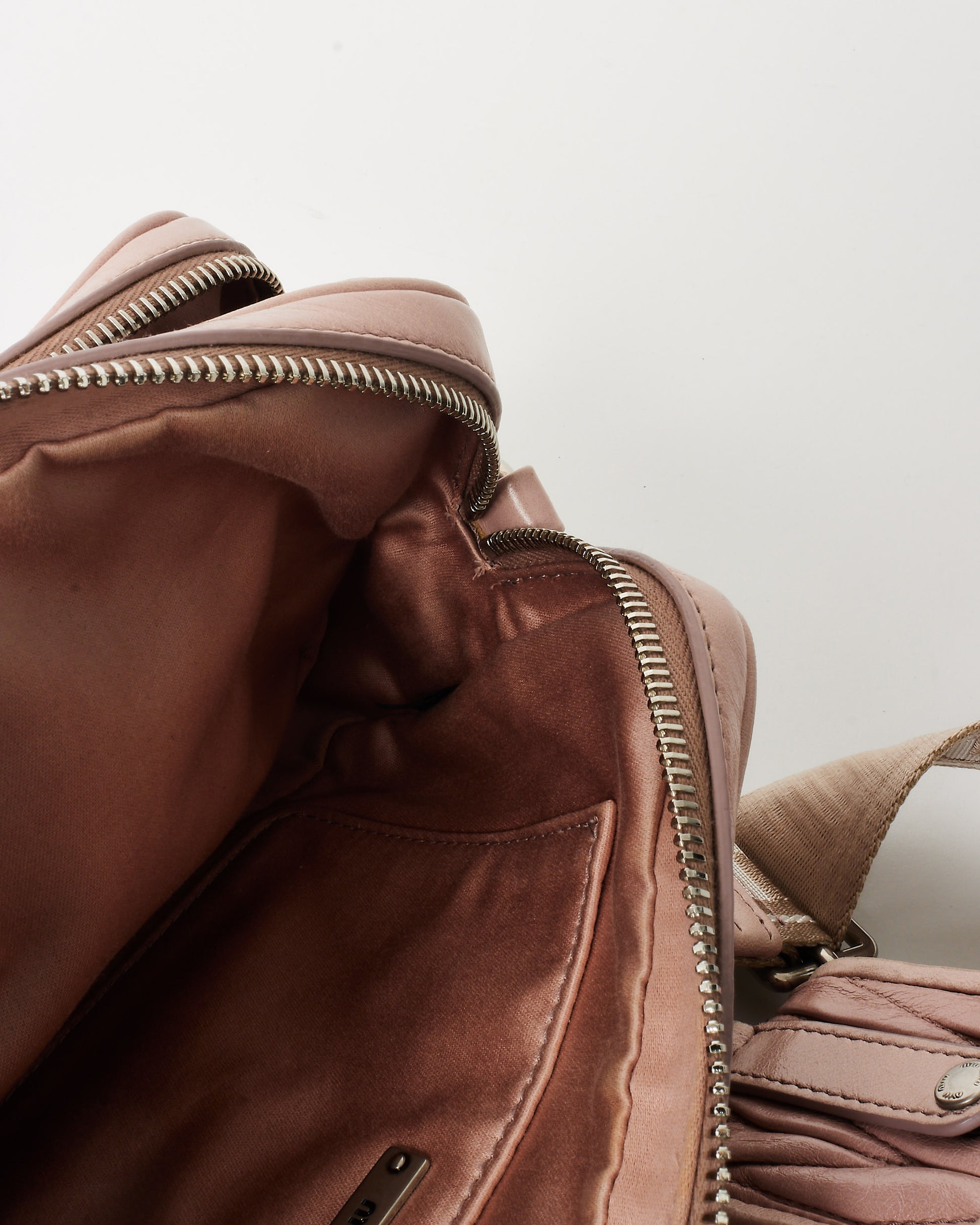 Playful yet polished, the pre-owned authentic Miu Miu Pink Matelassé Leather Square Pocket Bandoliera Crossbody Bag brings texture and charm to everyday accessorizing. Crafted from the brand’s signature matelassé-quilted leather in a soft blush pink, this compact silhouette is both stylish and functional.