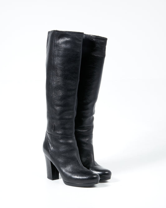 Black Grained Leather Knee Heel Boots - 39.5