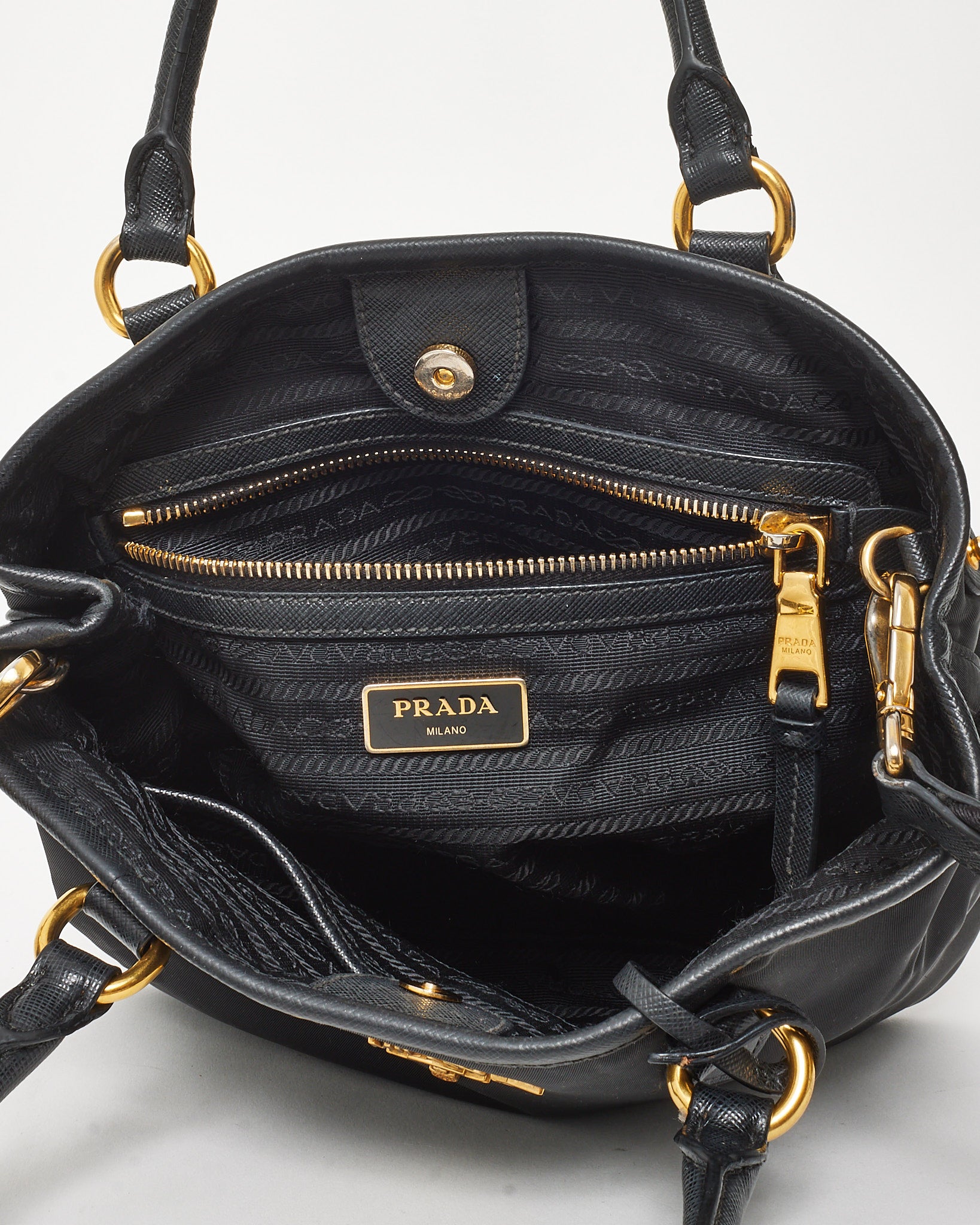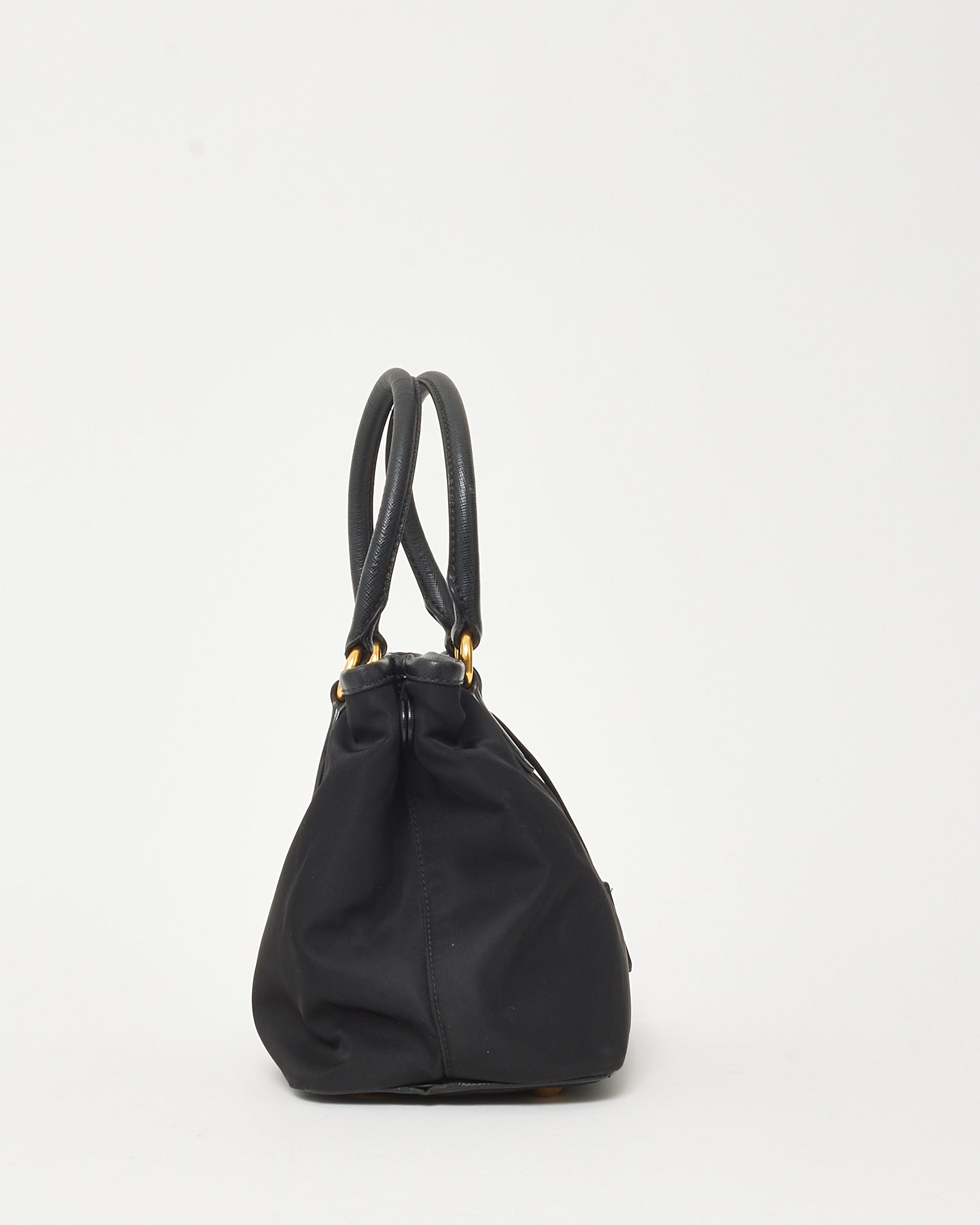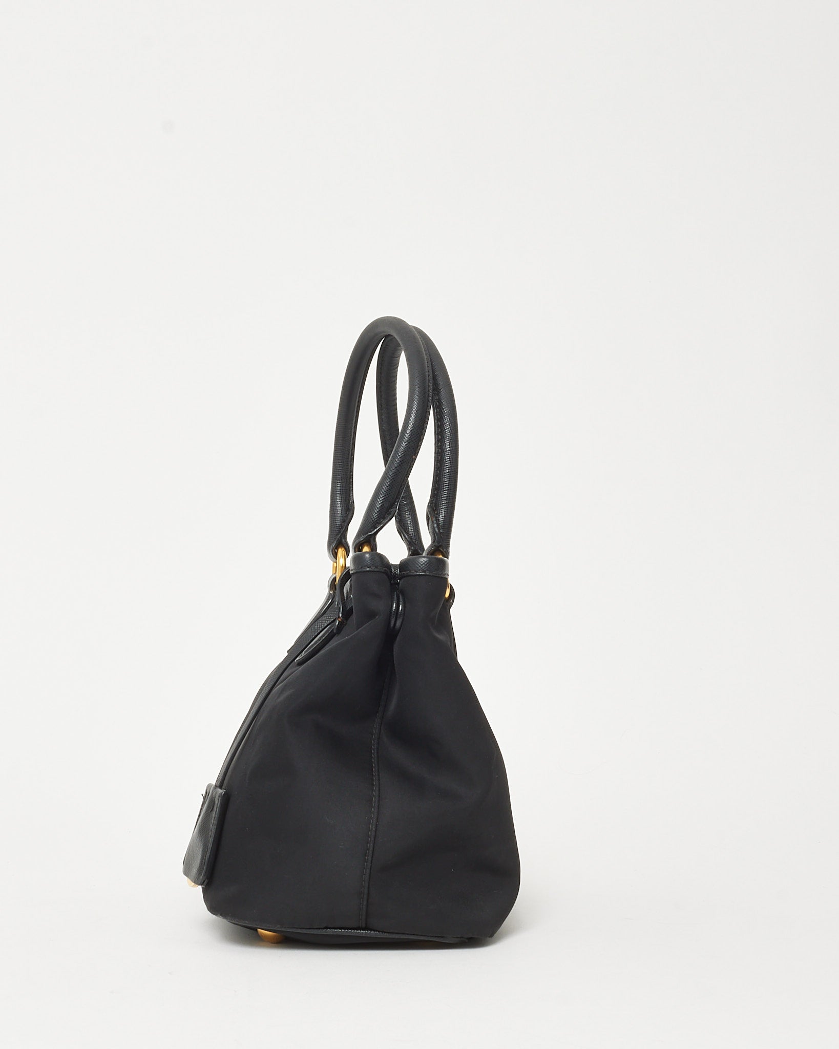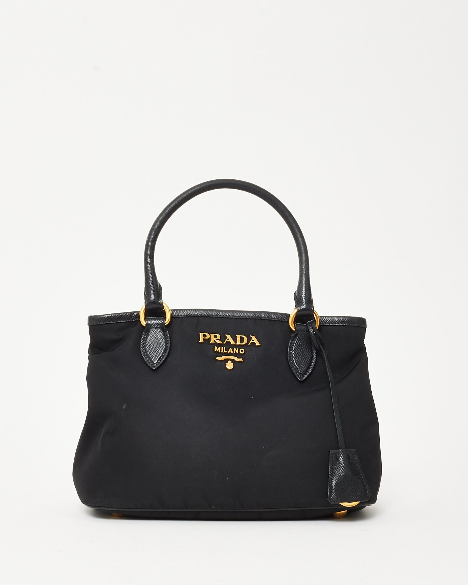A refined fusion of practicality and Italian craftsmanship, this pre-loved authentic Prada Tessuto Nylon Top Handle Bag features black nylon trimmed with signature Saffiano leather. Accented by gold-tone hardware and the iconic Prada logo, this structured silhouette offers dual carry options with rolled top handles and a detachable strap. A timeless everyday companion that embodies understated elegance and versatility.