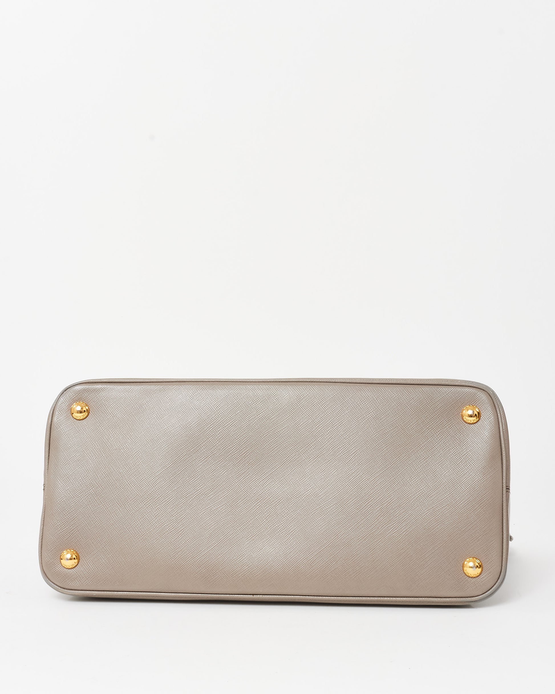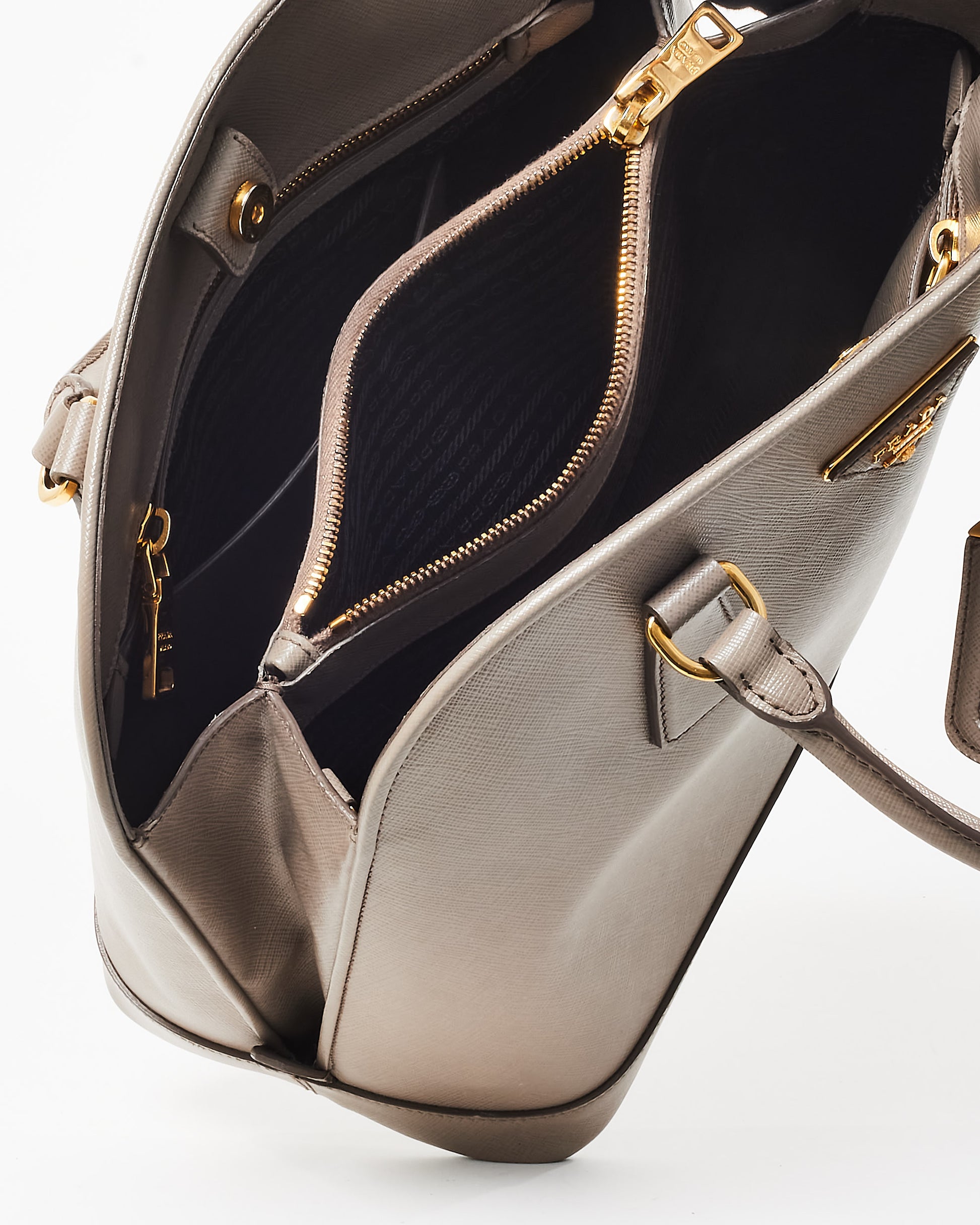 The dual rolled leather top handles provide versatile carrying options, while the gold-tone hardware and Prada triangle logo plaque add a signature touch. Designed for effortless organization, the spacious interior with multiple compartments and zip closures ensures secure storage for daily essentials.
