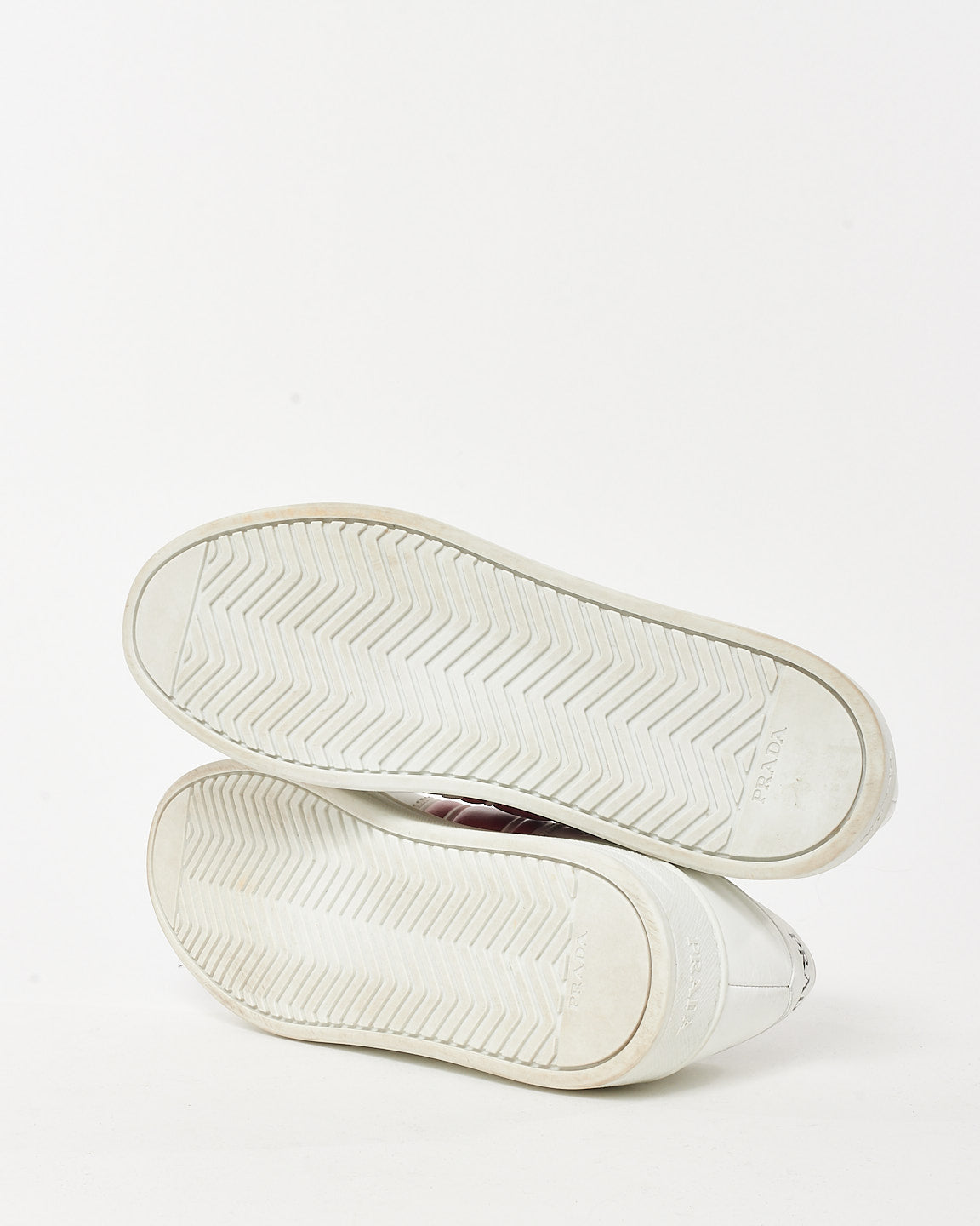 Sporty sophistication meets everyday polish in these pre-owned authentic Prada White Leather Red Stripe Logo New Avenue Sneakers. Crafted in smooth white leather, this clean-lined pair is accented with a bold red logo stripe for a dynamic, modern finish.
