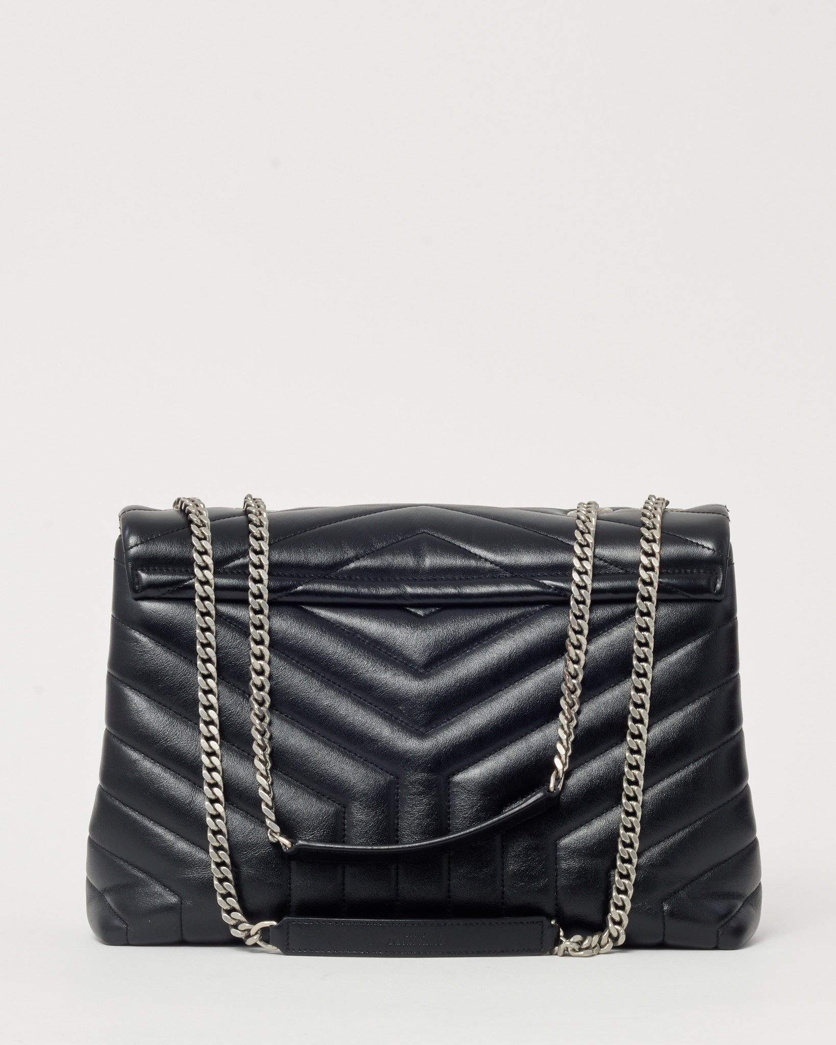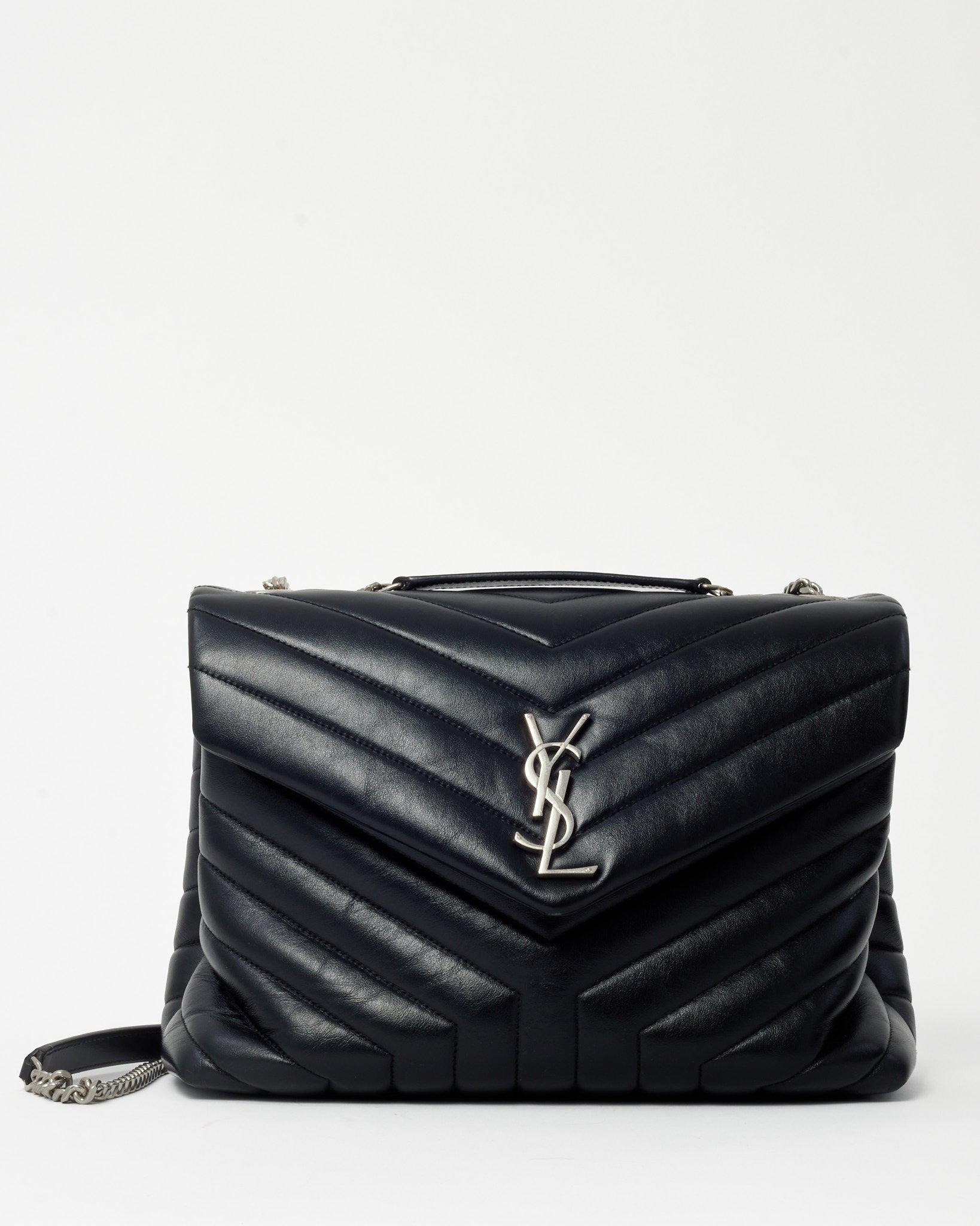 Elevate your everyday style with this pre-loved authentic Saint Laurent Black Chevron Leather Medium Loulou Shoulder Bag SHW, crafted in supple black leather with the signature chevron quilting that defines the Loulou collection. The softly structured silhouette is accented by the iconic YSL monogram in sleek silver-tone hardware, adding a modern edge to the timeless design. Designed with a leather-woven chain strap for versatile shoulder or crossbody wear and a spacious interior for daily essentials, this Saint Laurent bag blends effortless Parisian sophistication with practical luxury. A coveted designer handbag that offers both elegance and versatility for day-to-night styling.