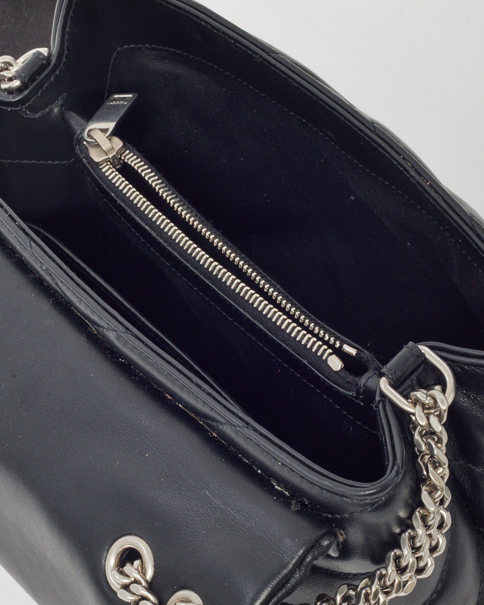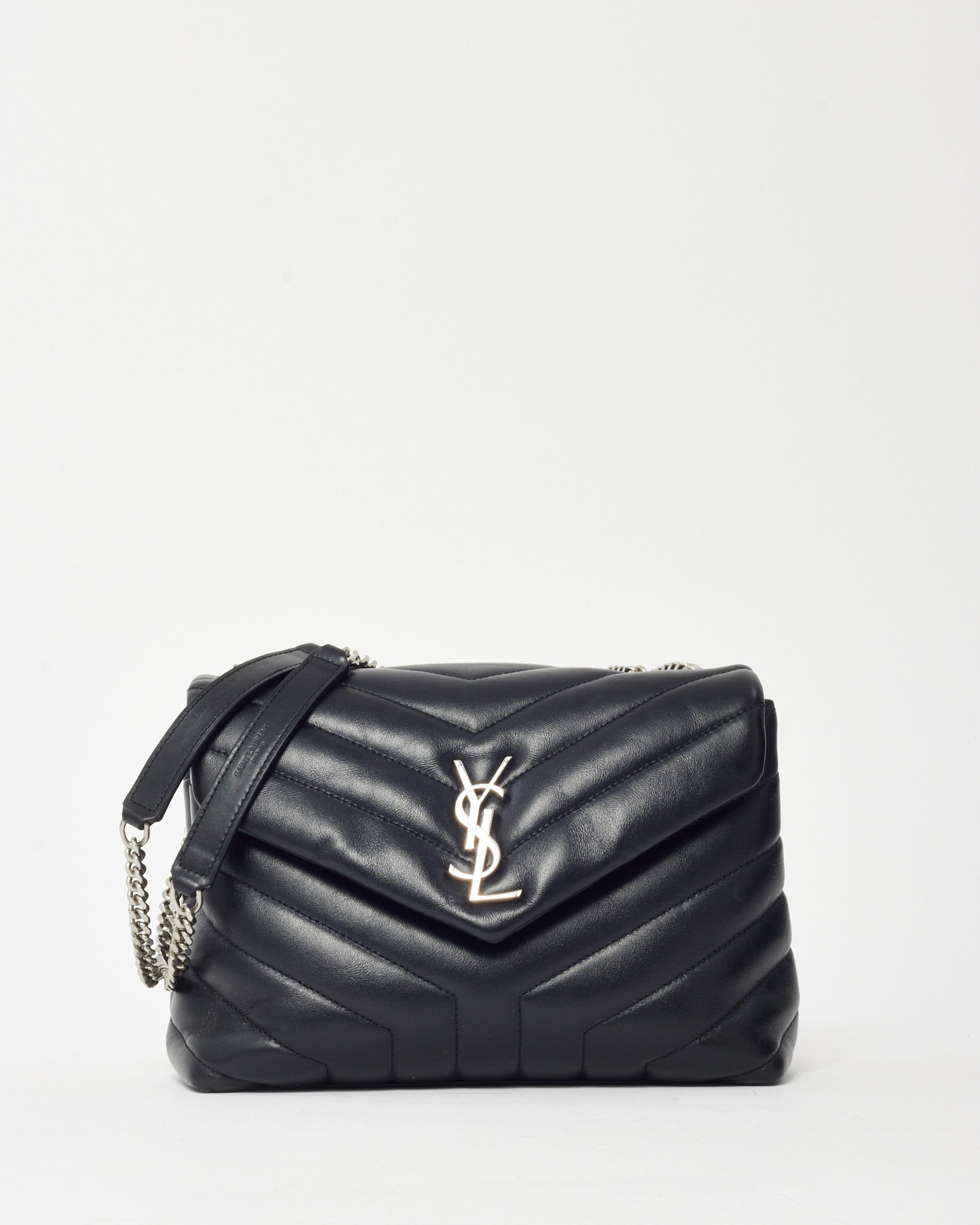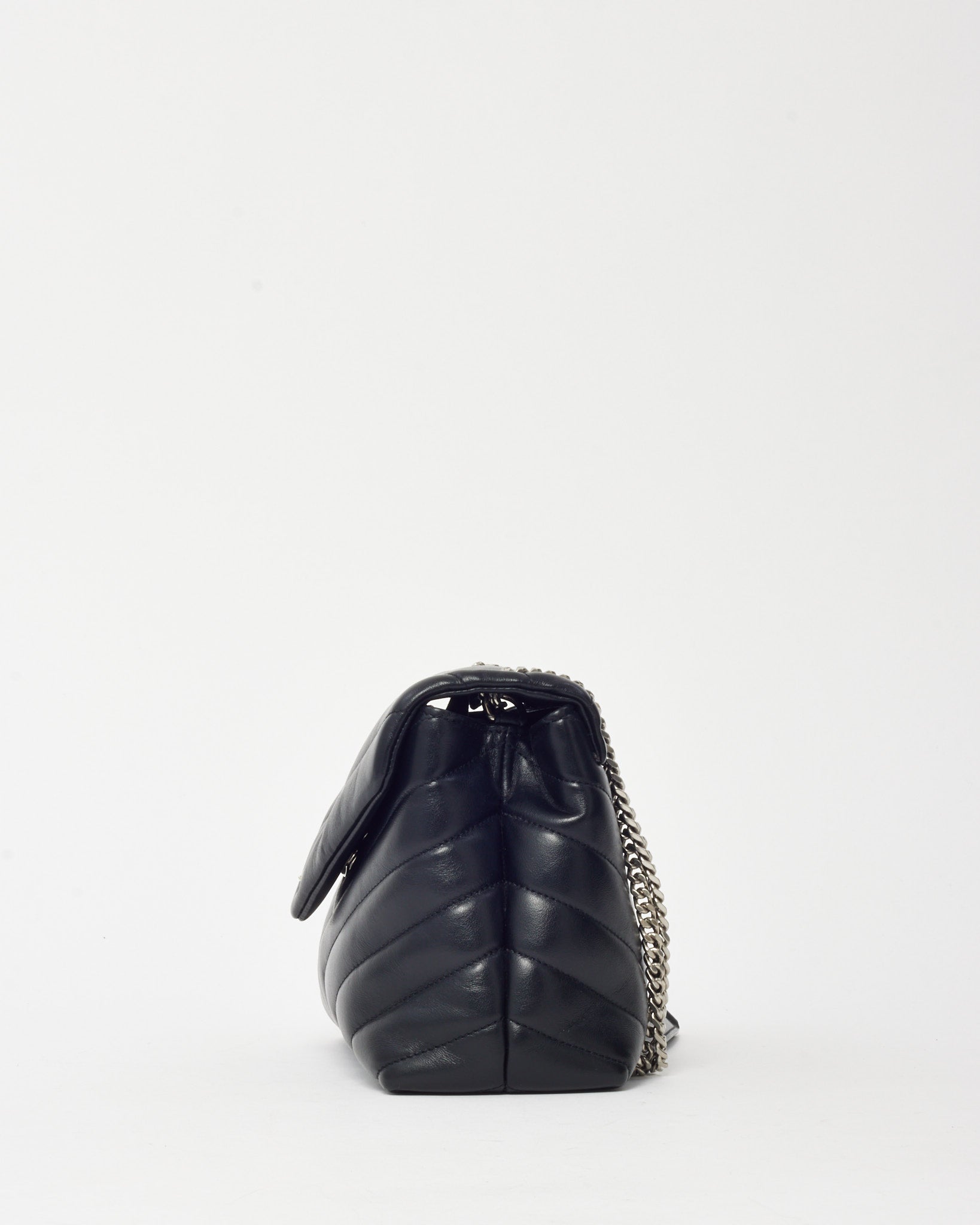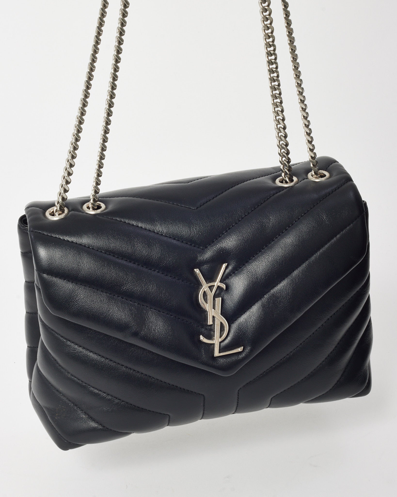 Elegant and versatile, this pre-loved authentic Saint Laurent Black Chevron Leather Small YSL Monogram Loulou Shoulder Bag with Silver Hardware embodies timeless Parisian style. Crafted from supple chevron-quilted leather, it features the iconic YSL logo on the flap, silver-tone chain straps, and a spacious interior for everyday essentials. The adjustable strap allows for both shoulder and crossbody wear, making it a perfect blend of sophistication and functionality. A true Saint Laurent classic designed for effortless day-to-night elegance.