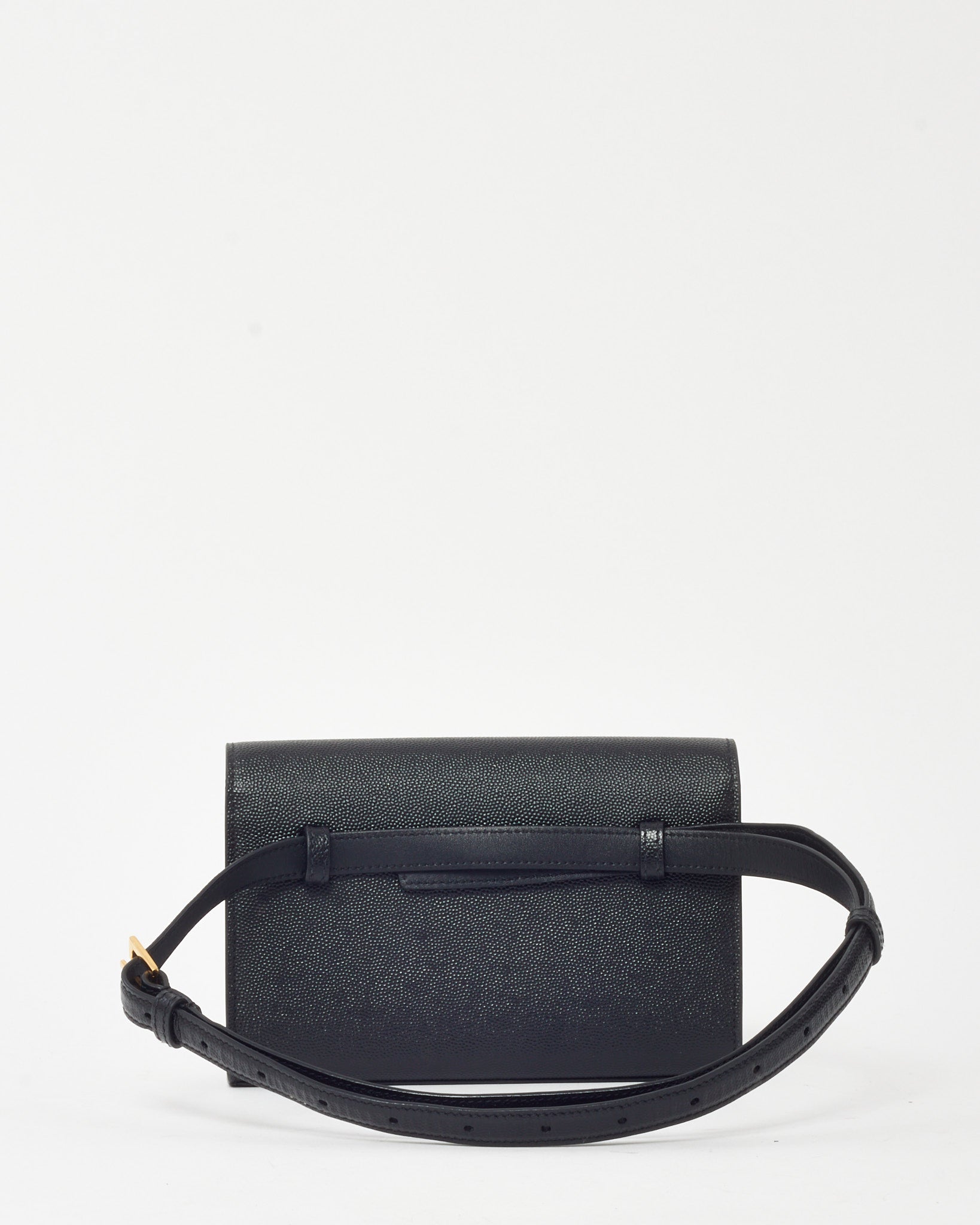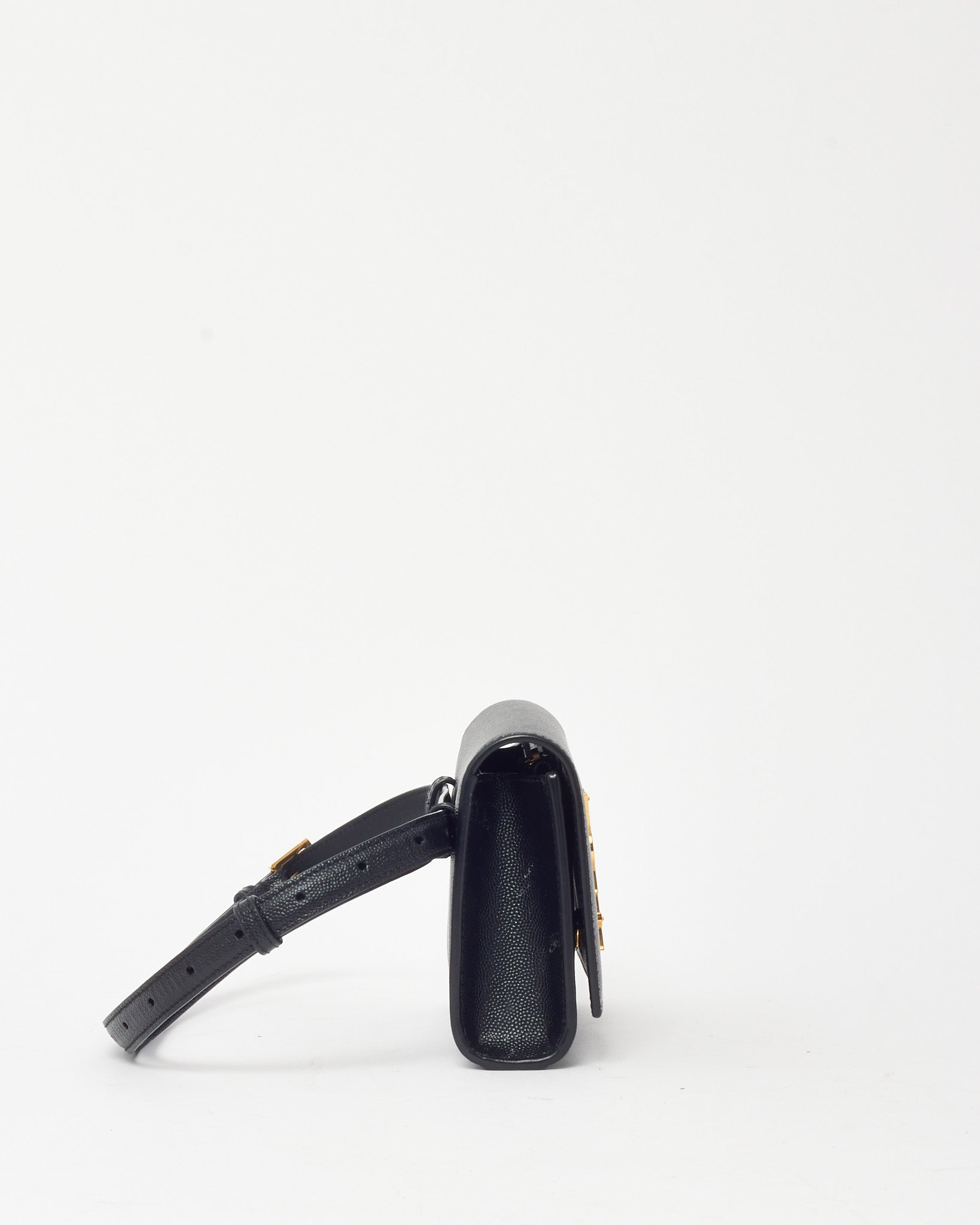 Elevate your luxe hands‑free edit with this pre‑loved authentic Saint Laurent Small Kate Belt Bag, crafted in grained black leather and finished with gleaming gold‑tone YSL monogram hardware. Featuring a sleek rectangular flap front, a matching adjustable leather belt that allows versatile waist or hip wear, and thoughtfully sized to carry essentials, this iconic piece blends modern utility with Parisian polish. The durable grained leather texture ensures wearability and the signature logo adds structured sophistication—perfect for day‑to‑night styling or elevated urban minimalism.
