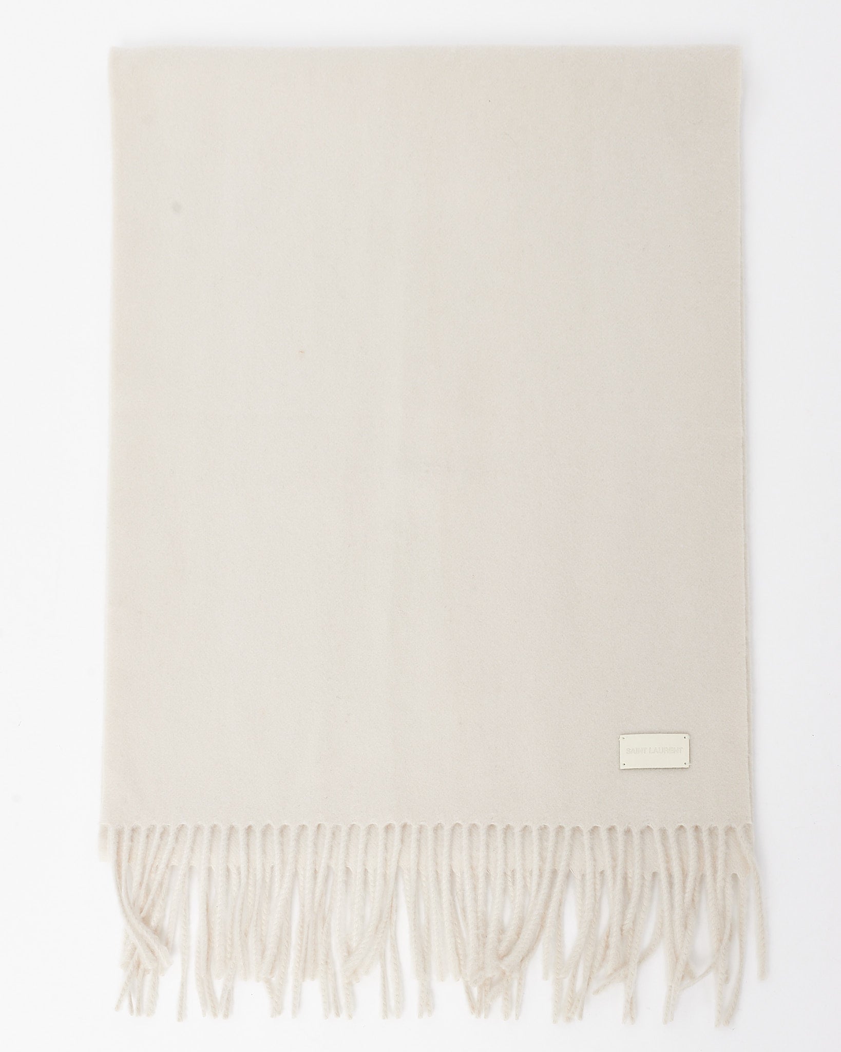 Elevate your cold-weather wardrobe with understated luxury through this pre-loved authentic Saint Laurent scarf. Crafted from ultra-soft ivory cashmere, the jacquard weave subtly showcases the Saint Laurent logo for a refined tonal effect. Finished with delicate fringe edges, this lightweight yet cozy accessory drapes effortlessly for a polished look. Perfect for layering over winter coats or styling with seasonal knits, it’s a timeless investment in everyday elegance.