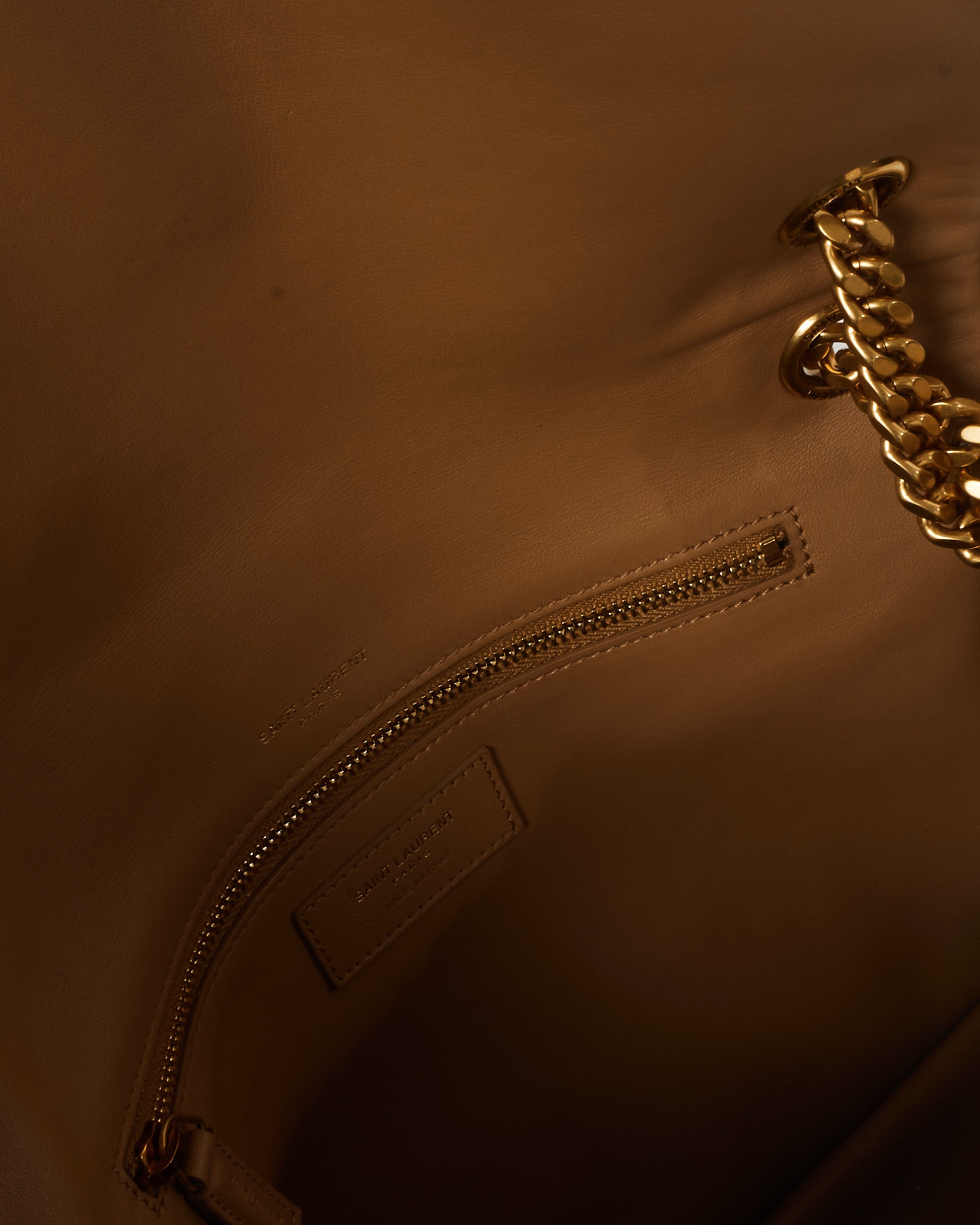 The flap front features the signature tonal YSL logo, while the matte chain strap can be worn doubled or long for crossbody styling. The roomy interior includes multiple compartments, making it as functional as it is fashionable.